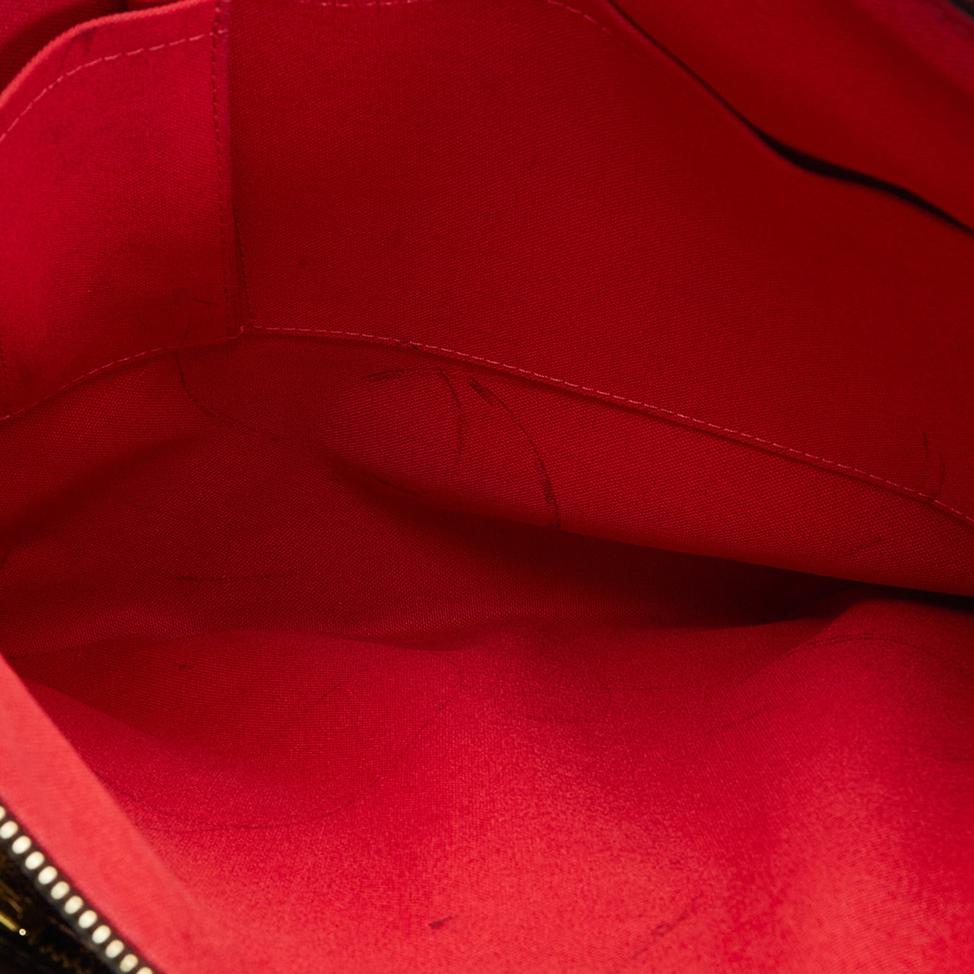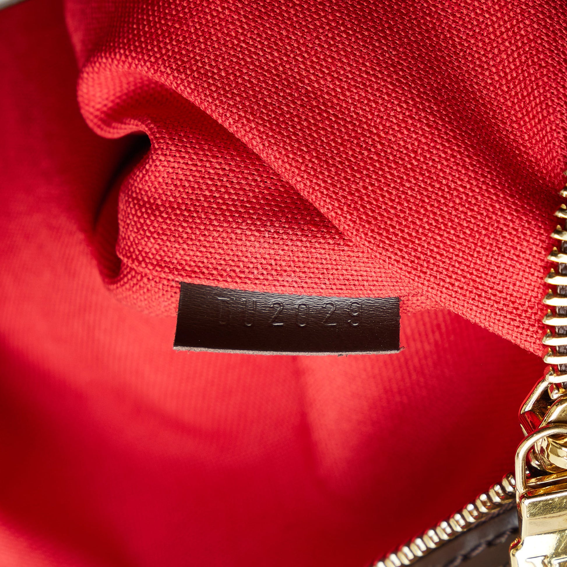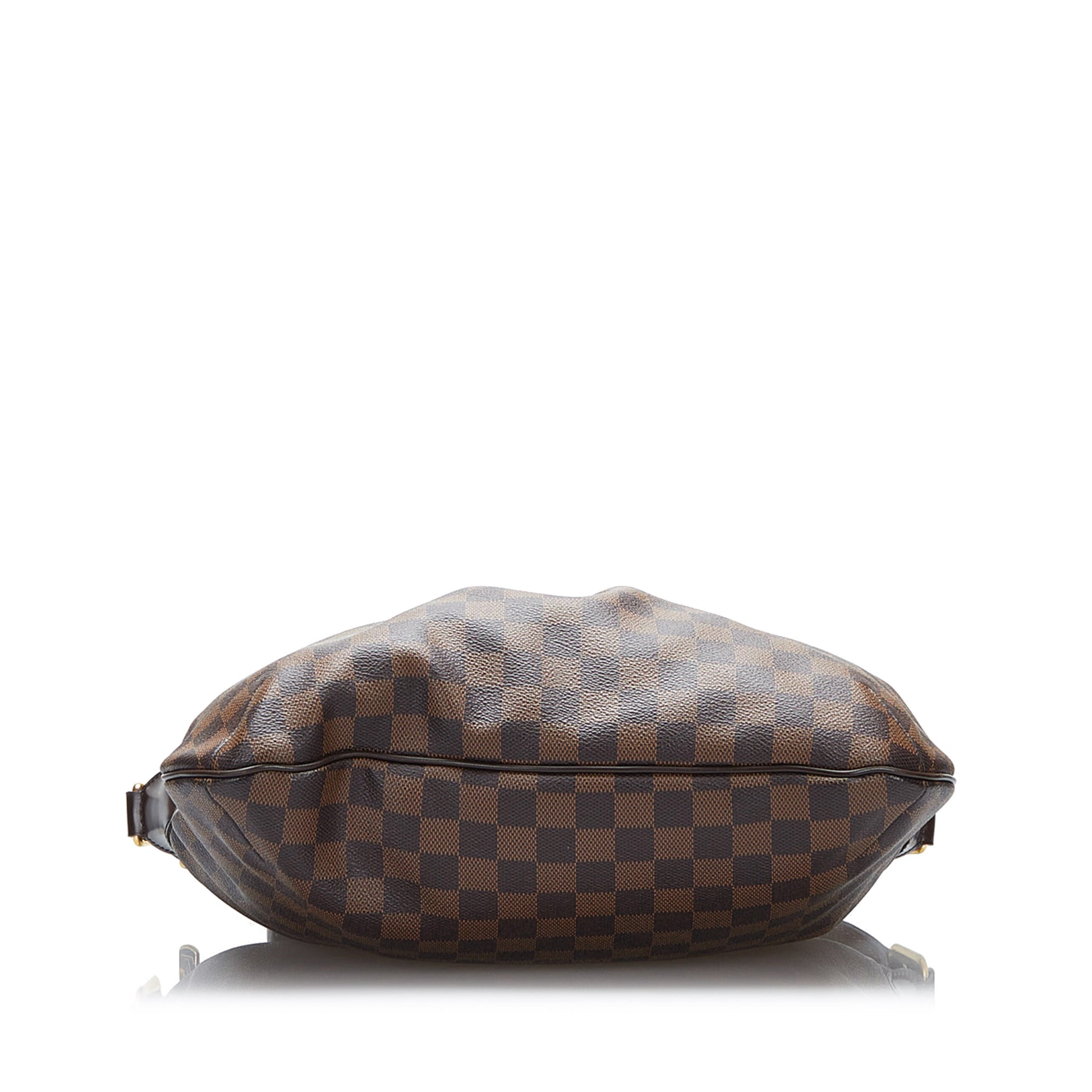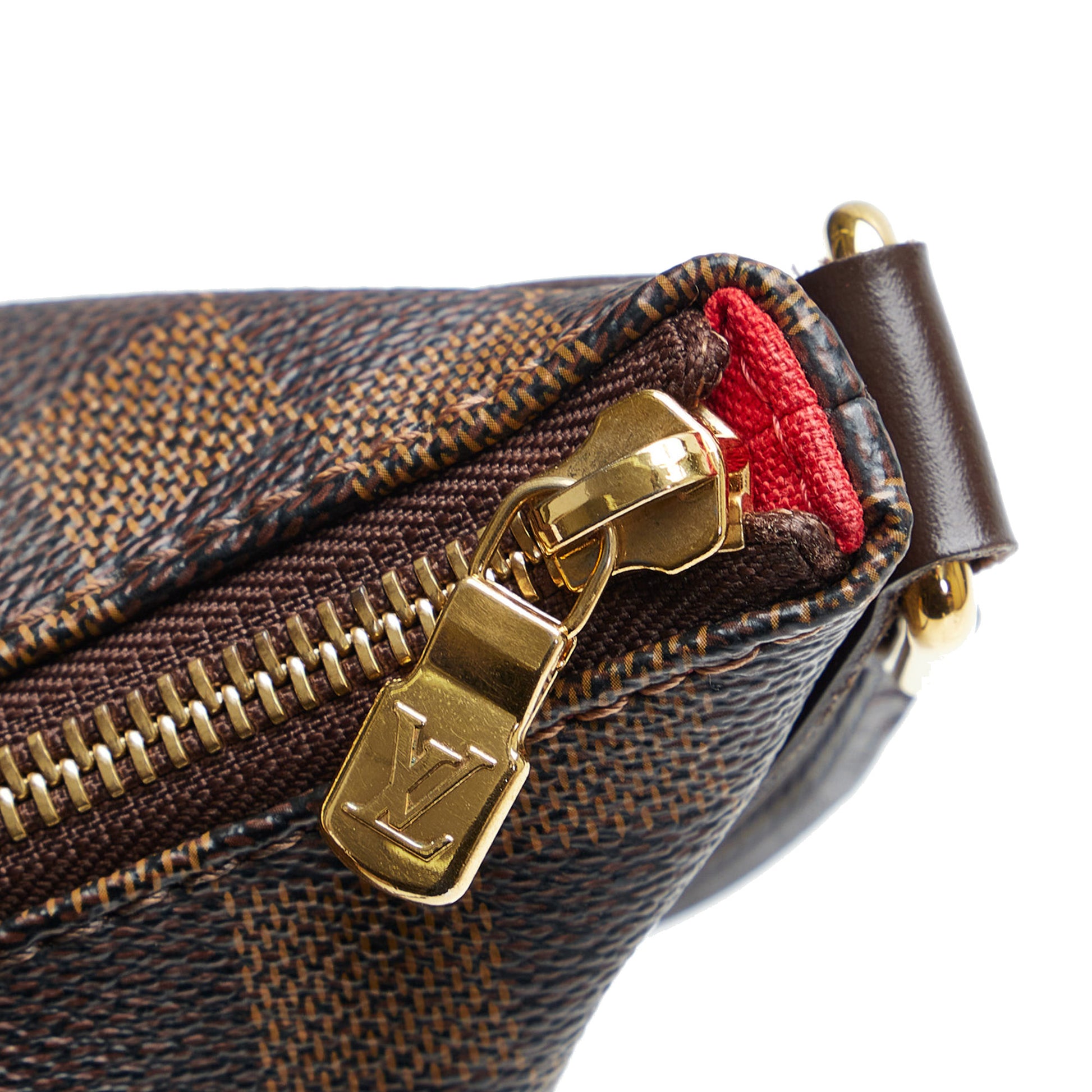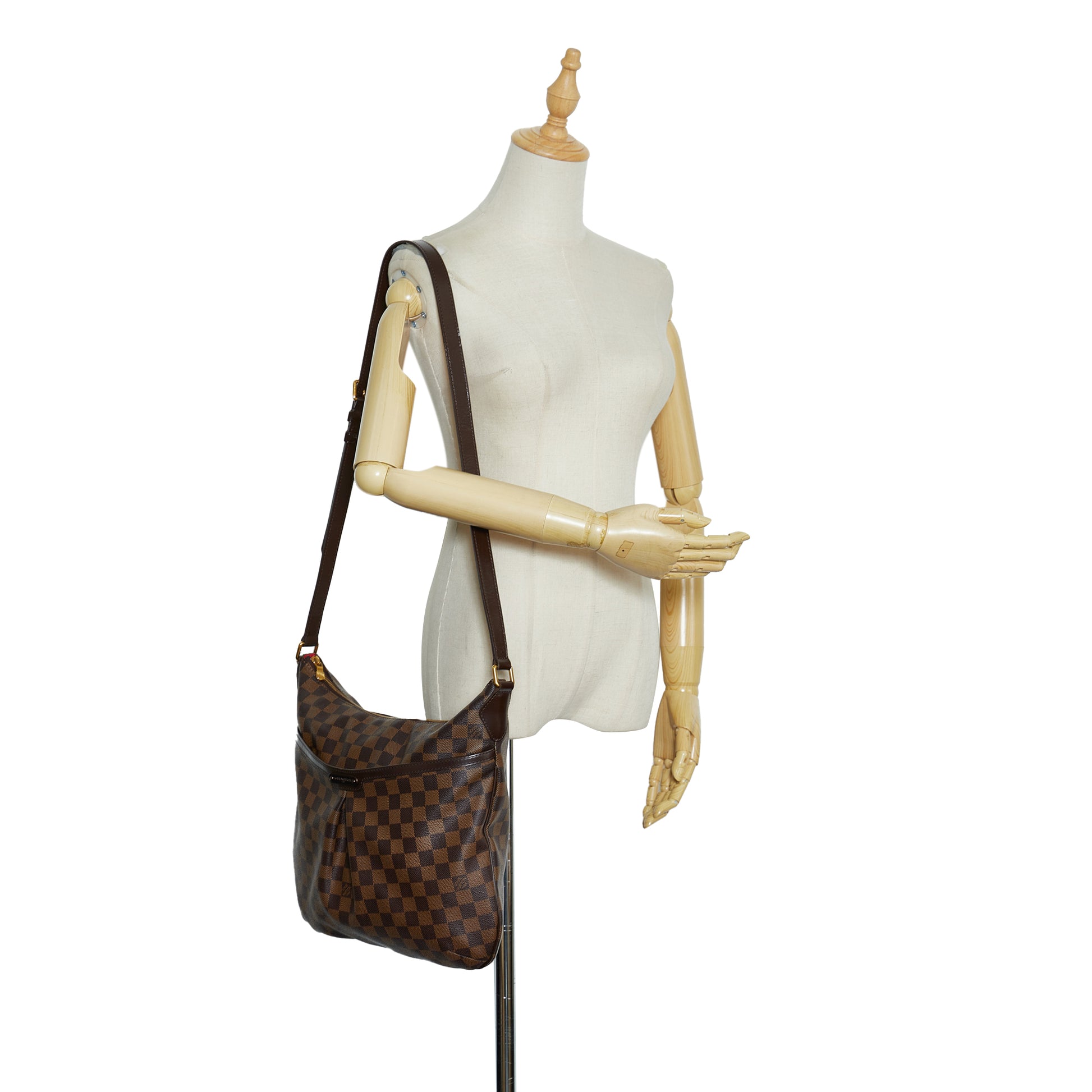 The Bloomsbury GM features a damier canvas body with leather trim, a front exterior slip pocket, a flat leather strap, a top zip closure, and interior slip pockets.