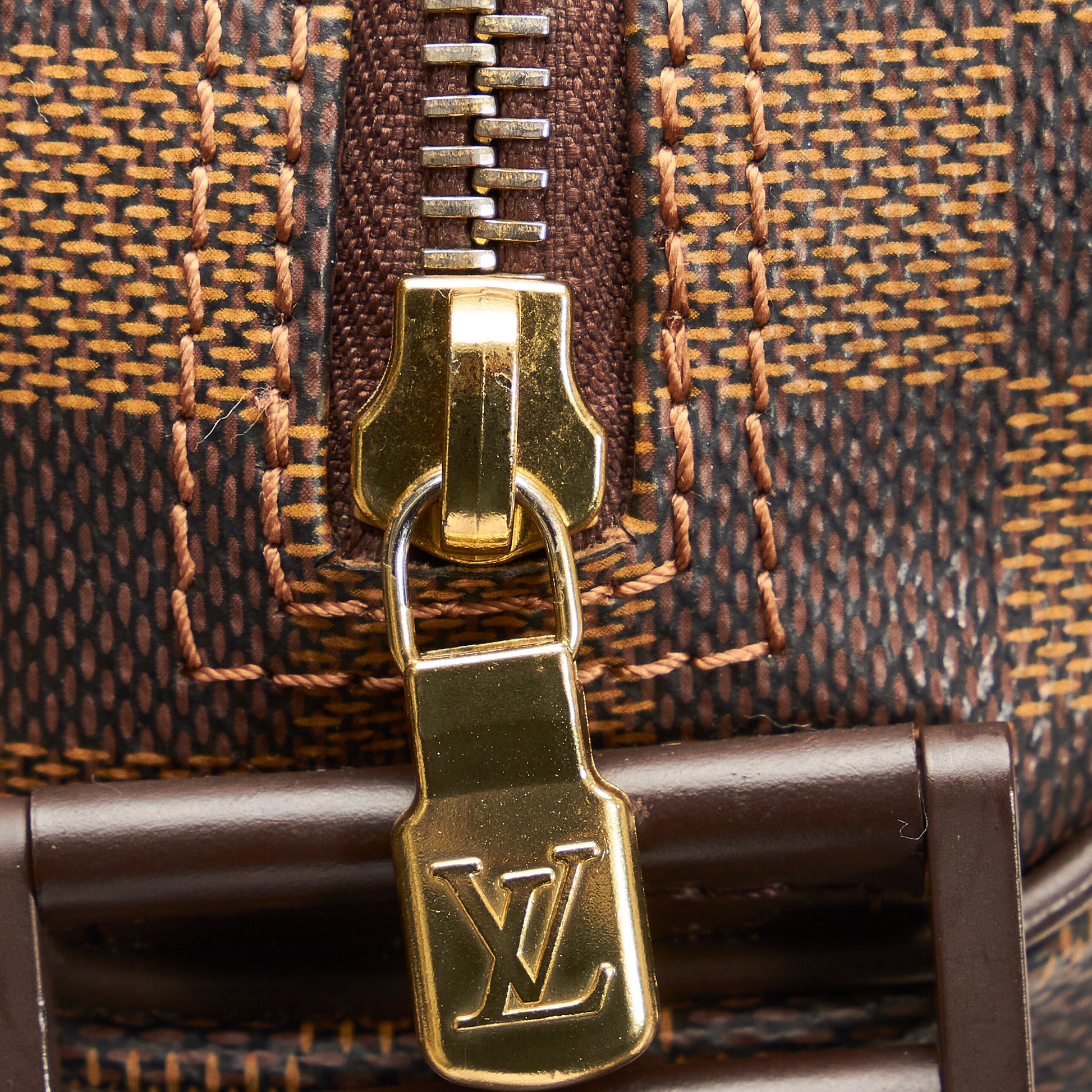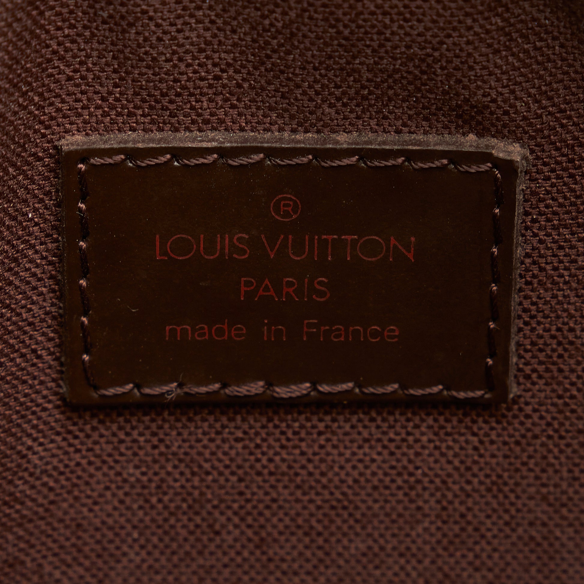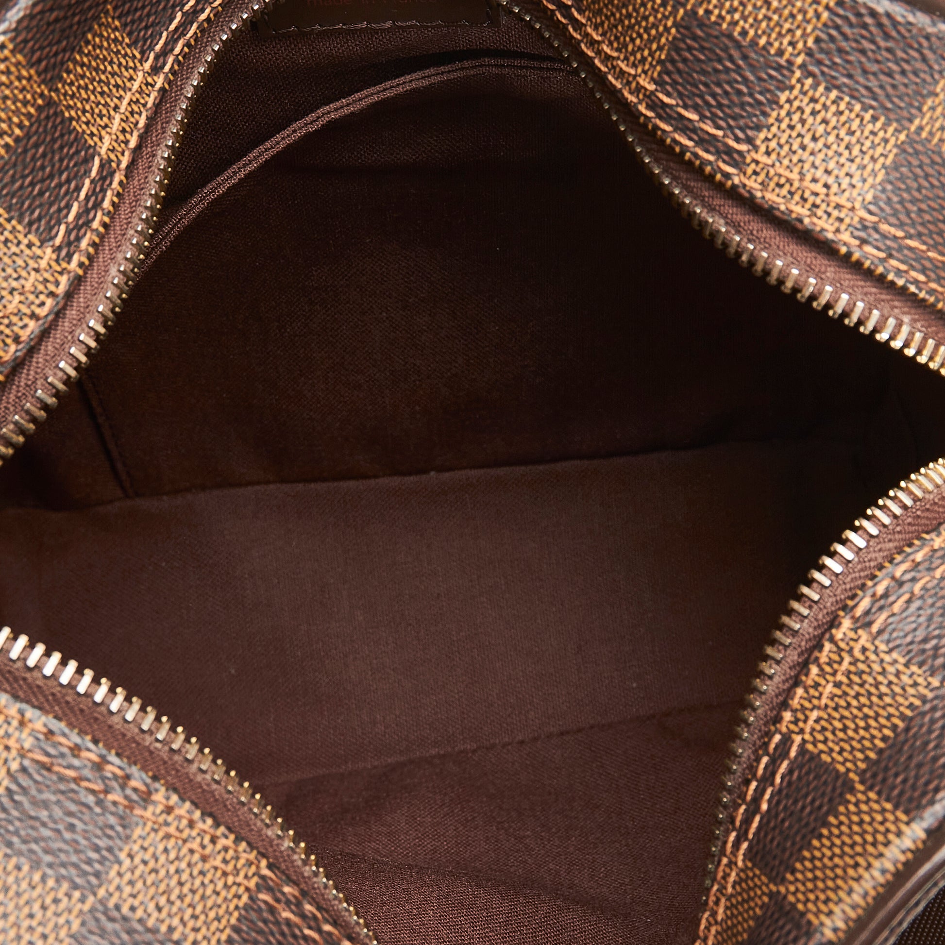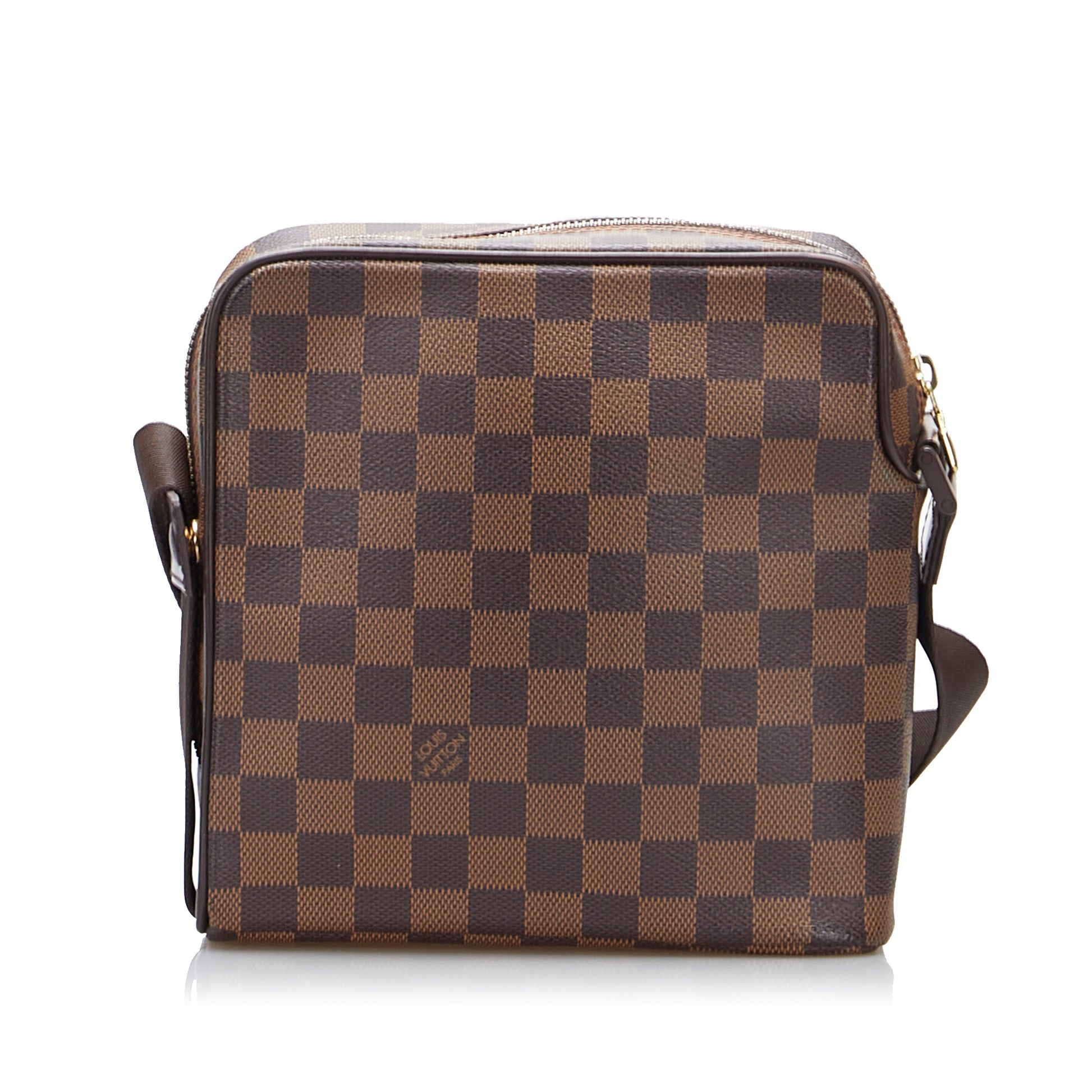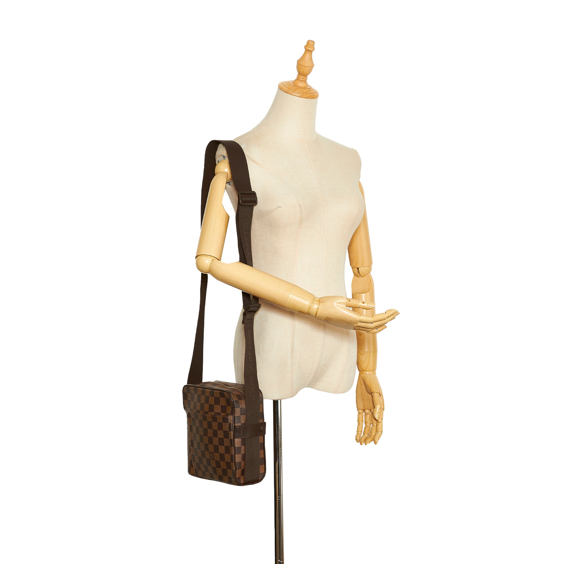 The Olav PM features a damier ebene canvas body, an adjustable flat shoulder strap, a top zip closure, an exterior slip pocket, and an interior slip pocket.