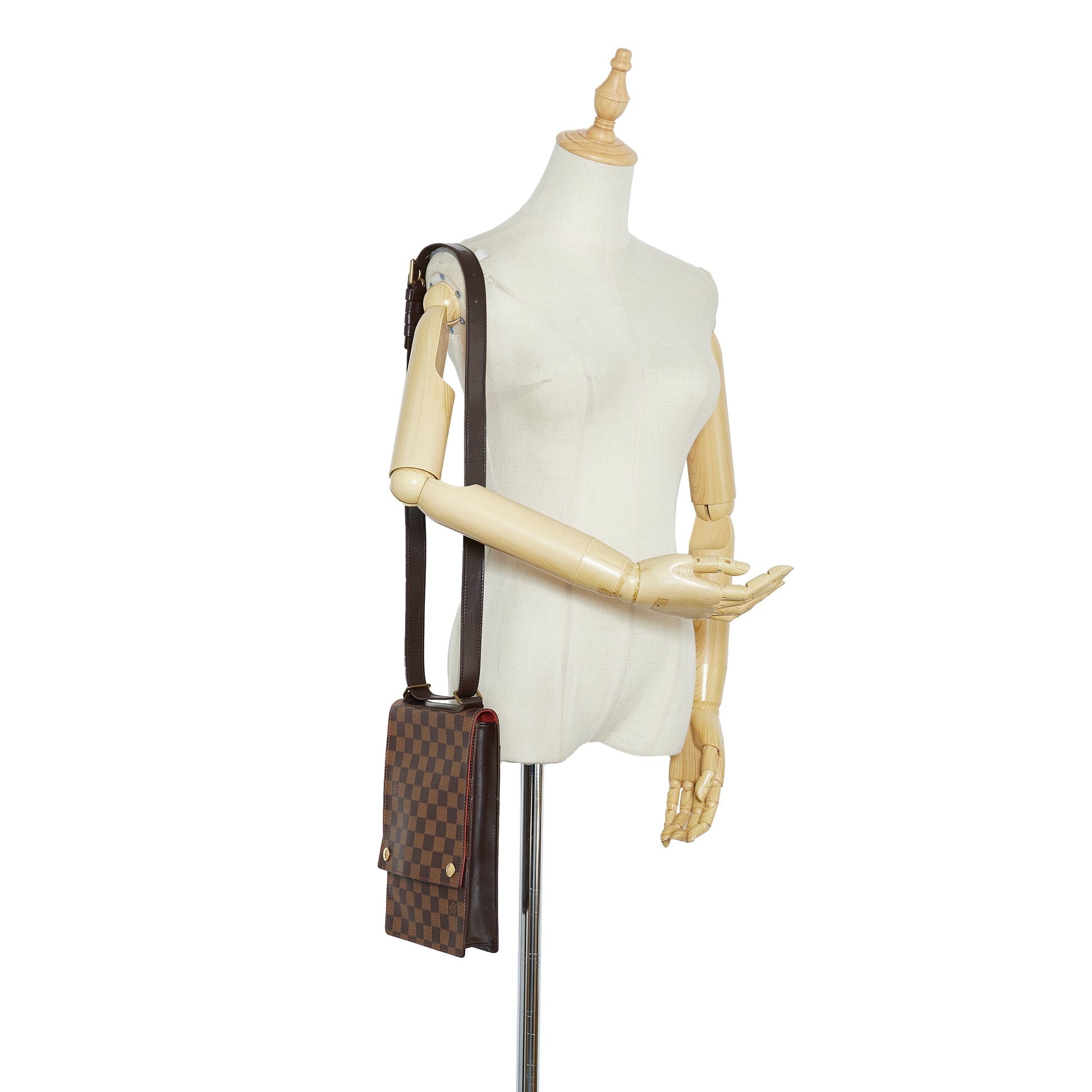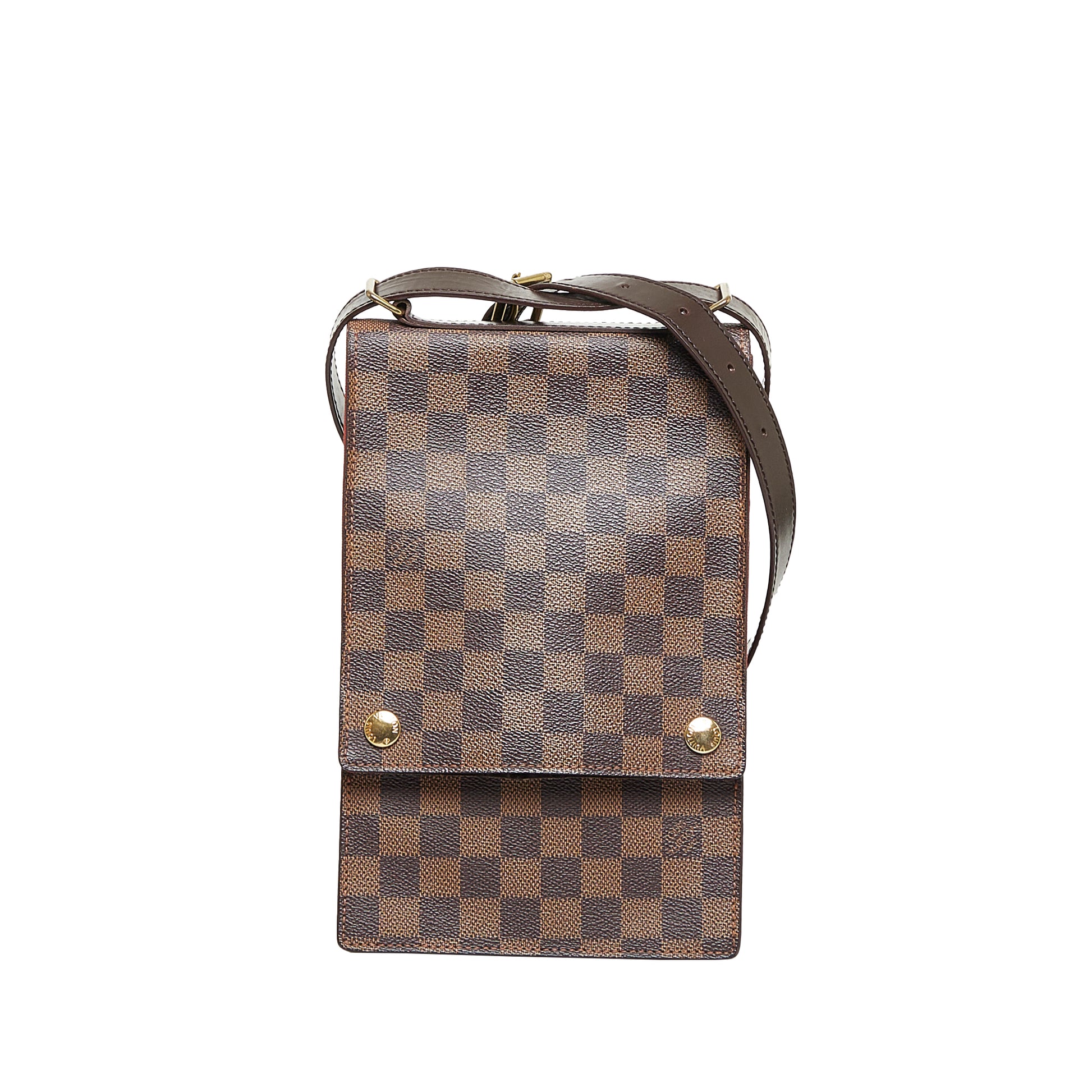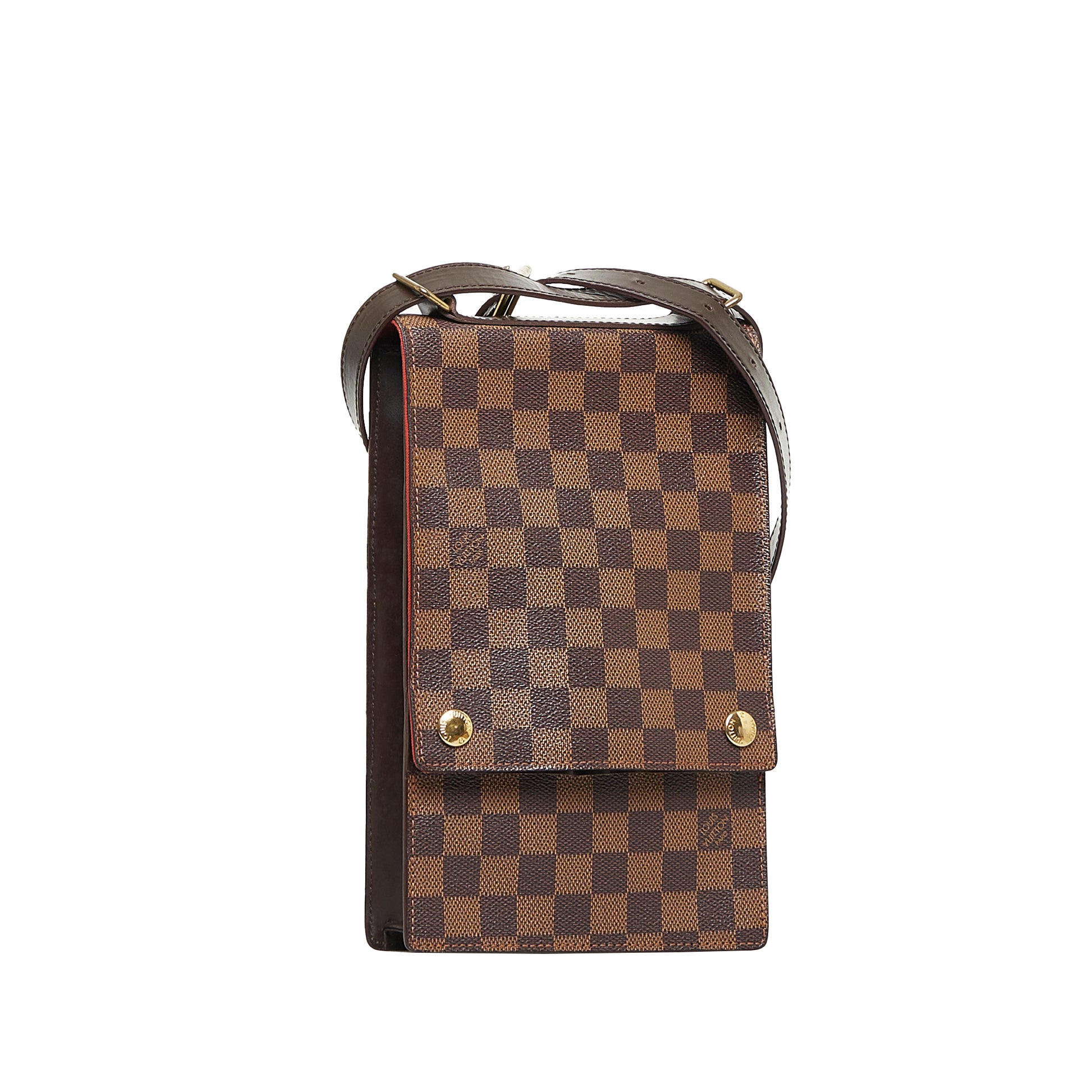 The Portobello features a damier canvas body, flat leather shoulder strap, front flap with snap button closures, and an exterior back slip pocket.