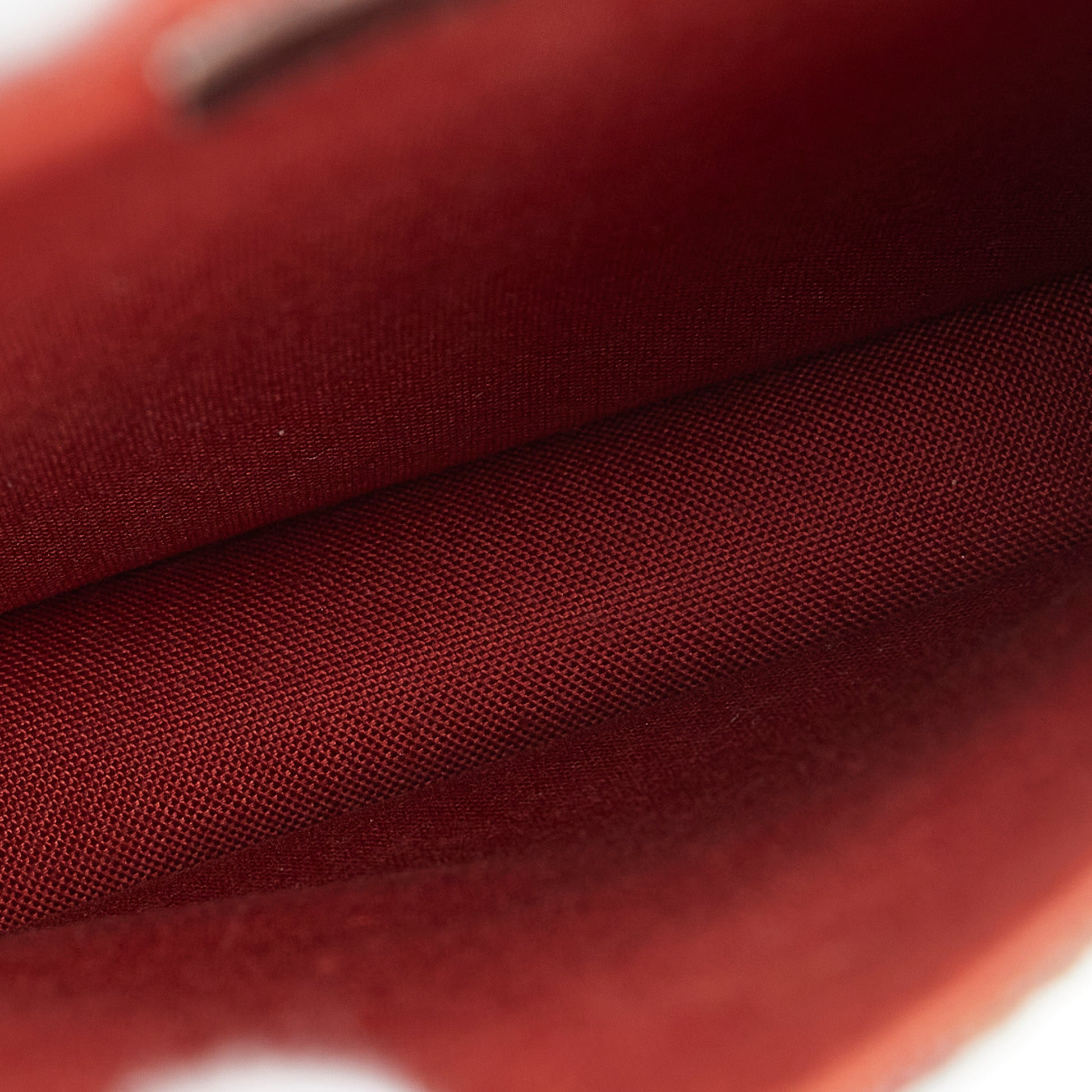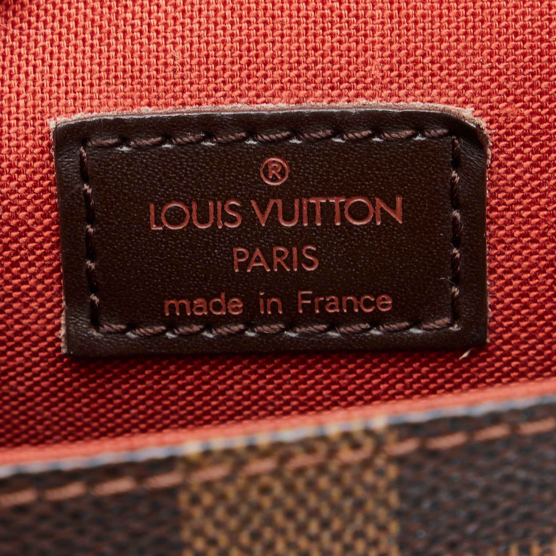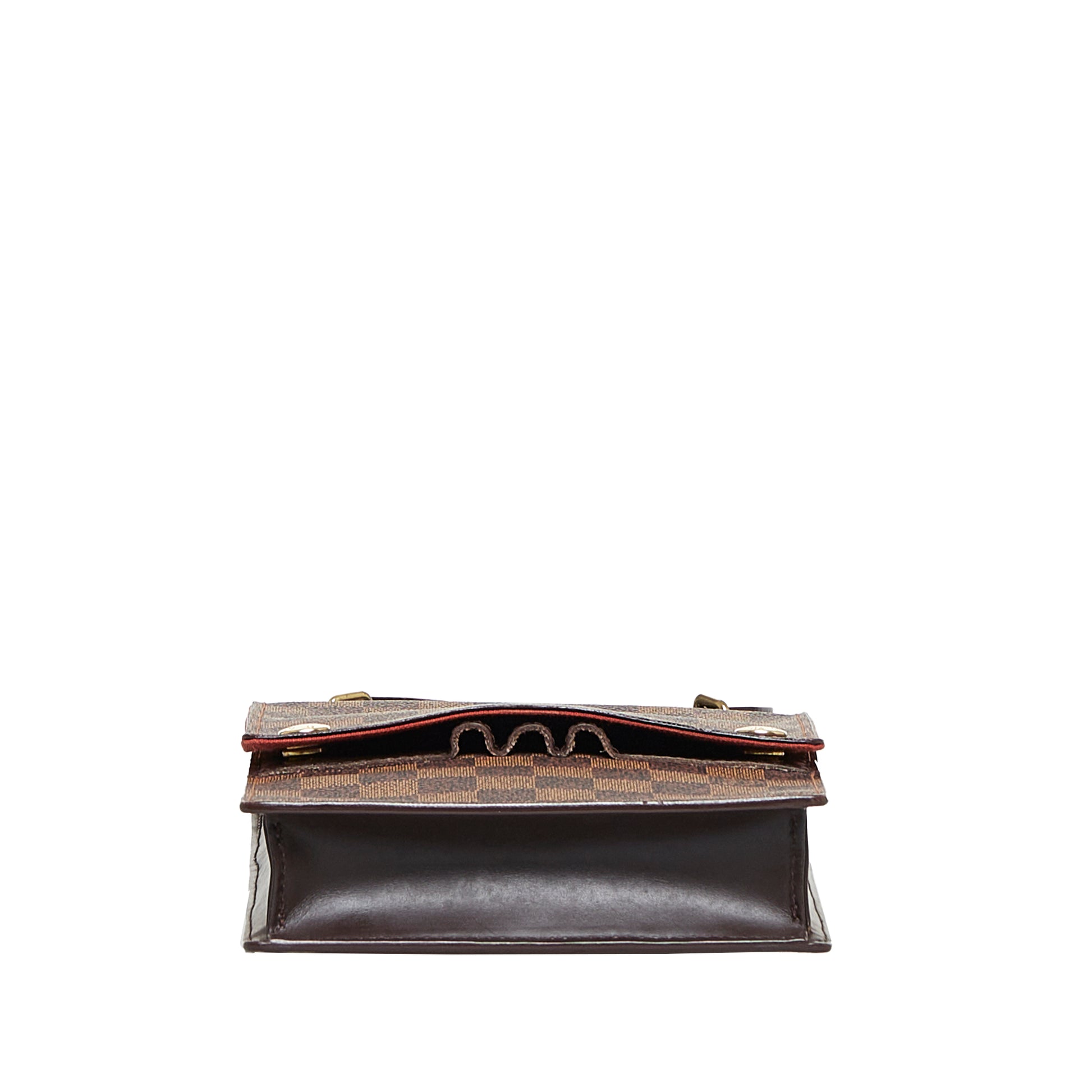 The Portobello features a damier canvas body, flat leather shoulder strap, front flap with snap button closures, and an exterior back slip pocket.