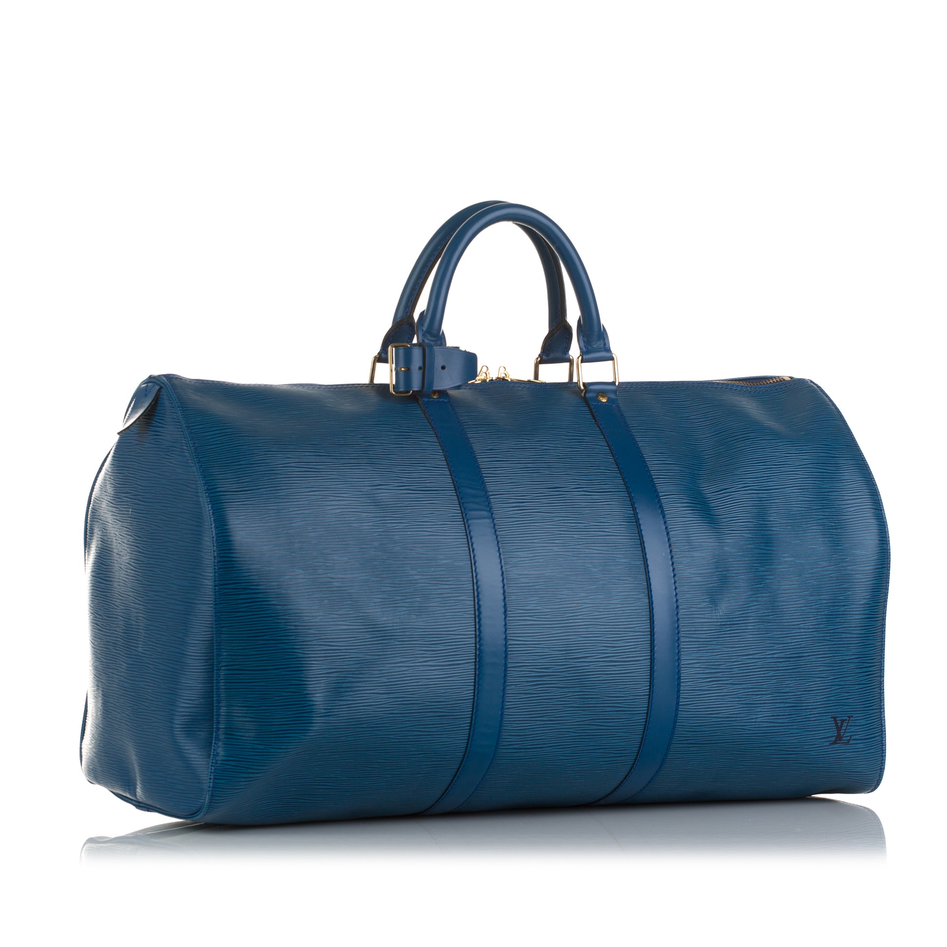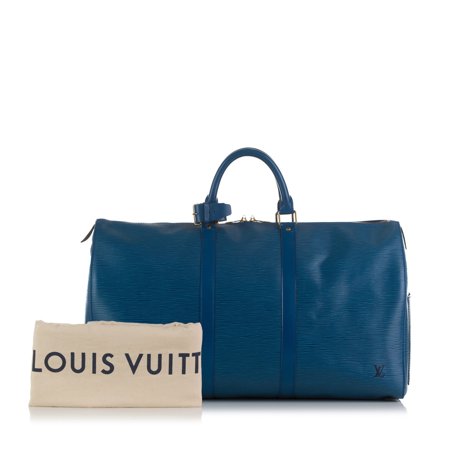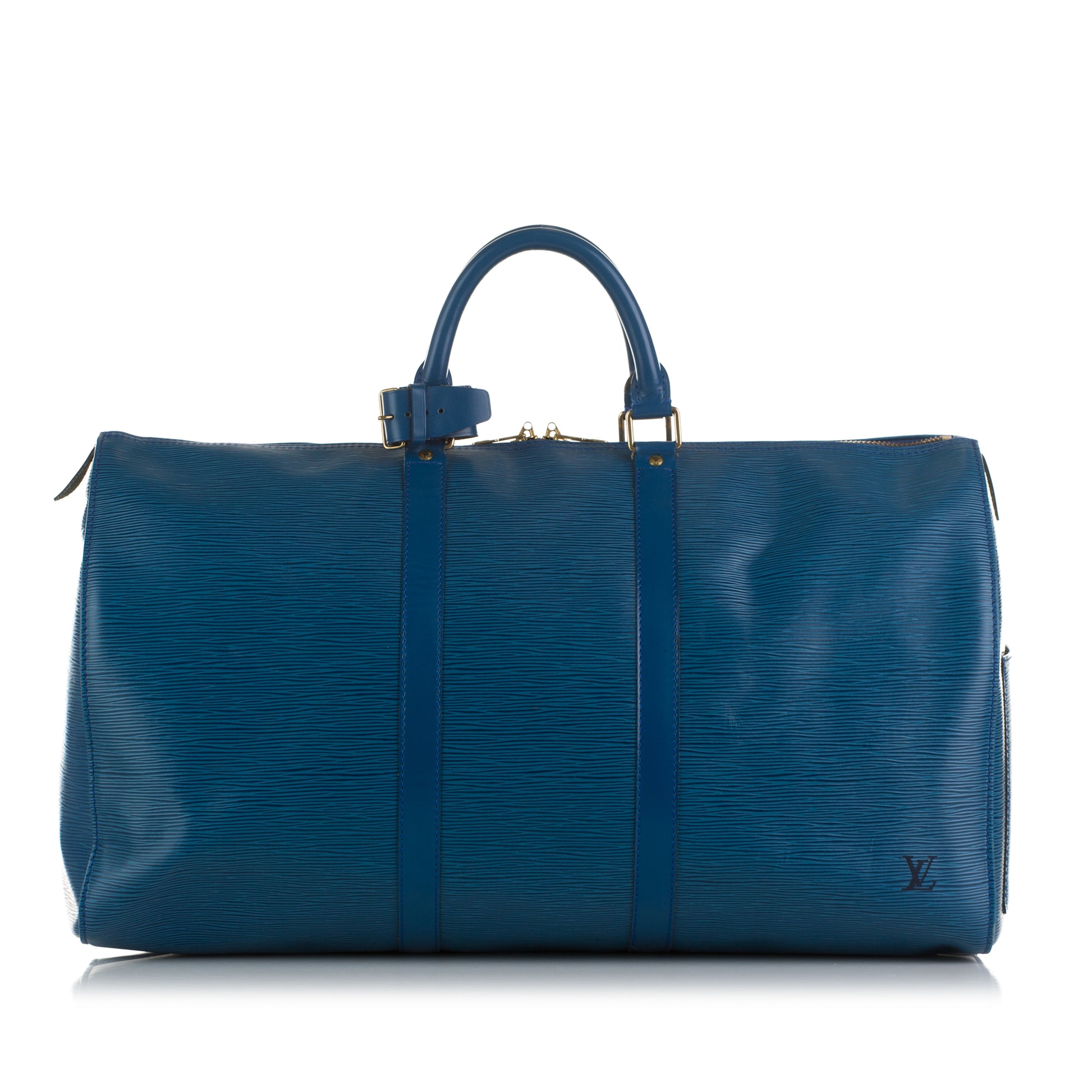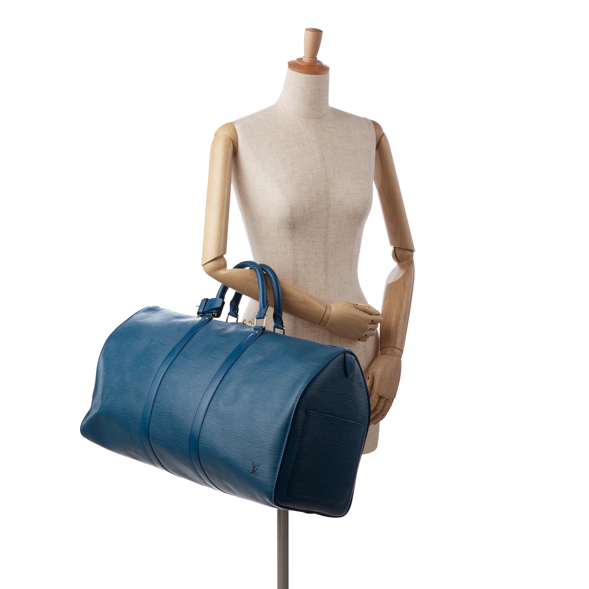 The Keepall 50 features an epi leather body, rolled leather handles, and a top zip closure.