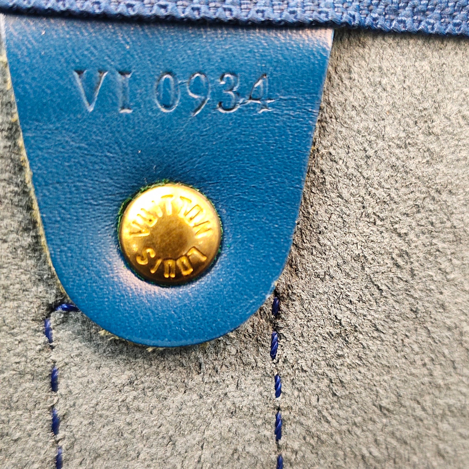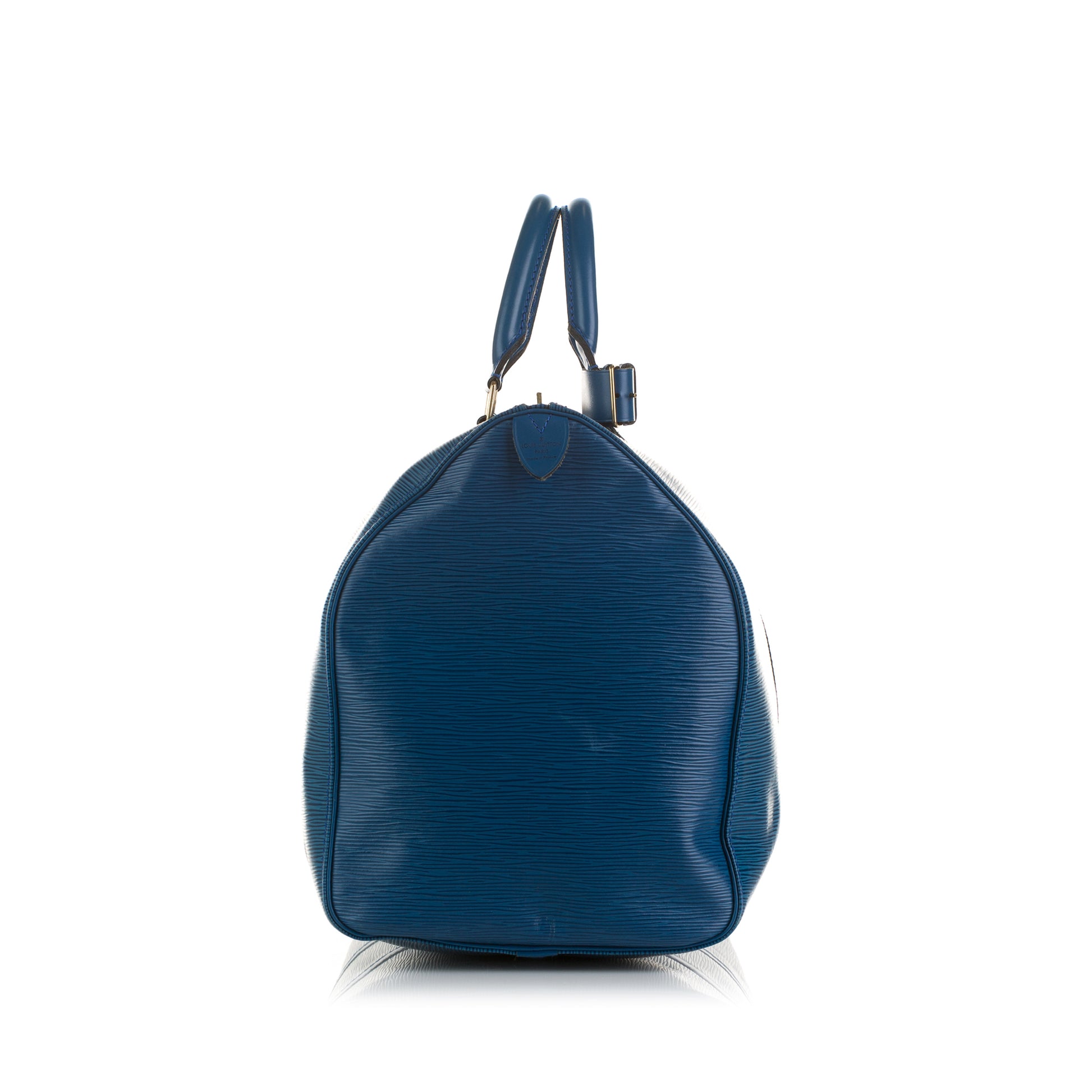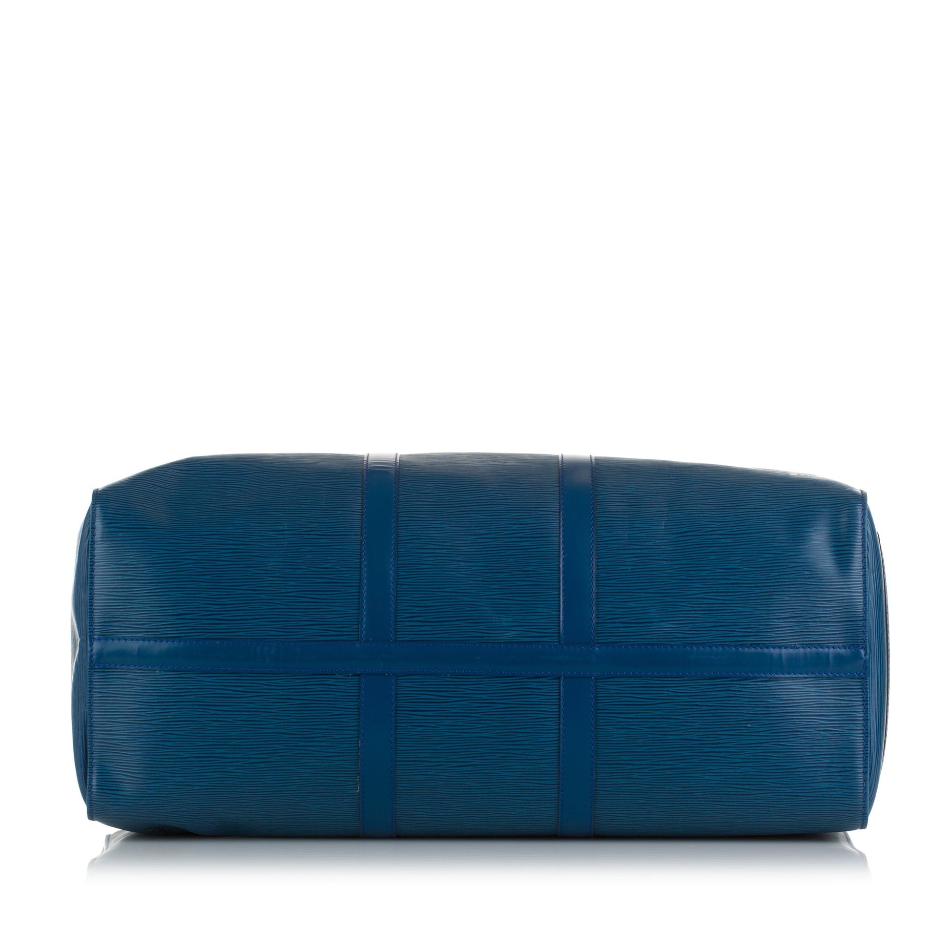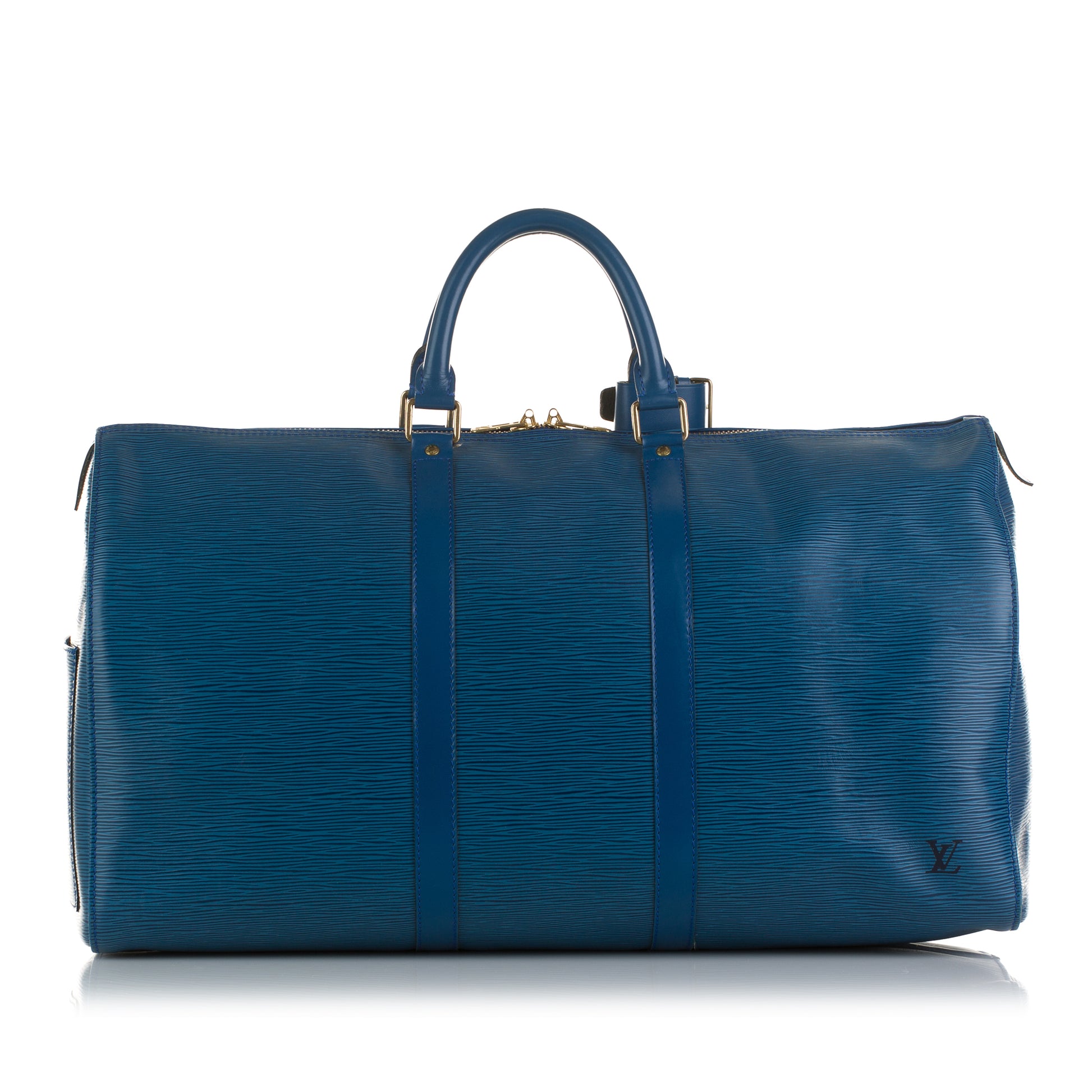 The Keepall 50 features an epi leather body, rolled leather handles, and a top zip closure.