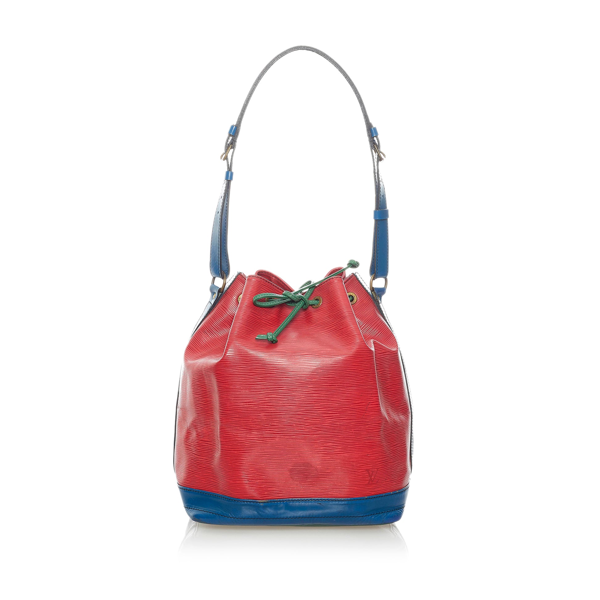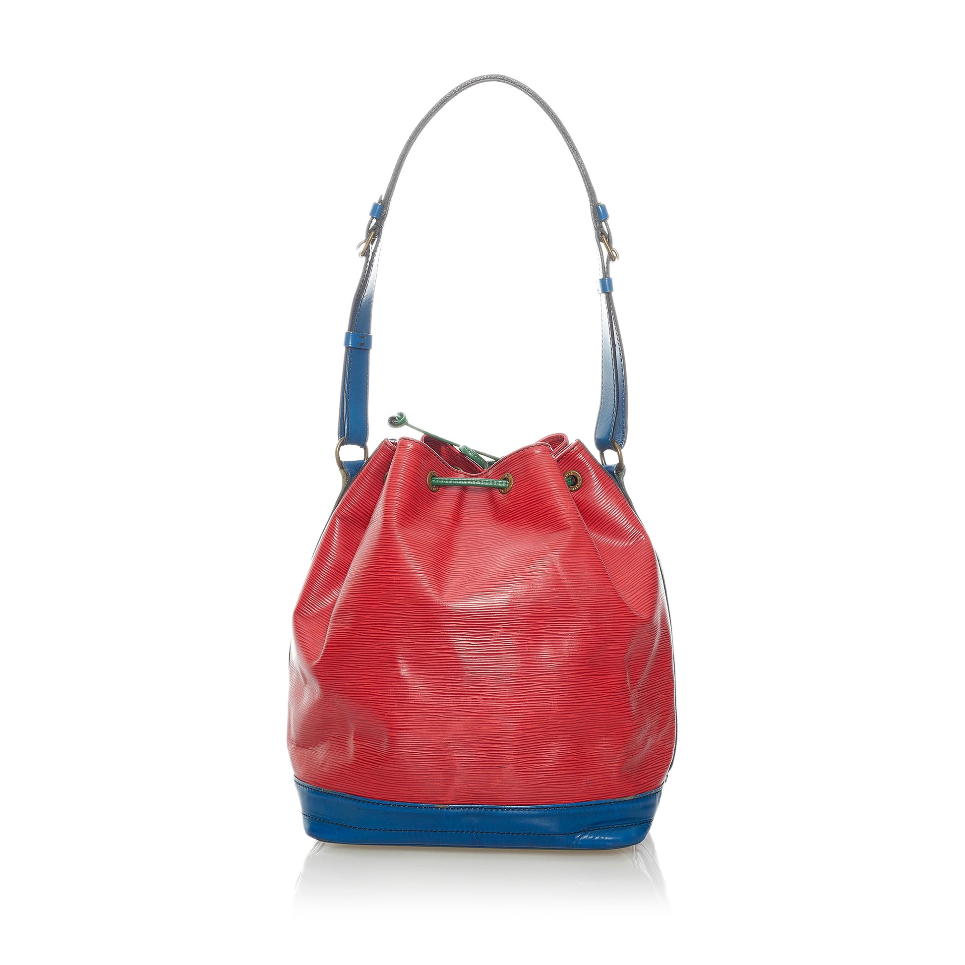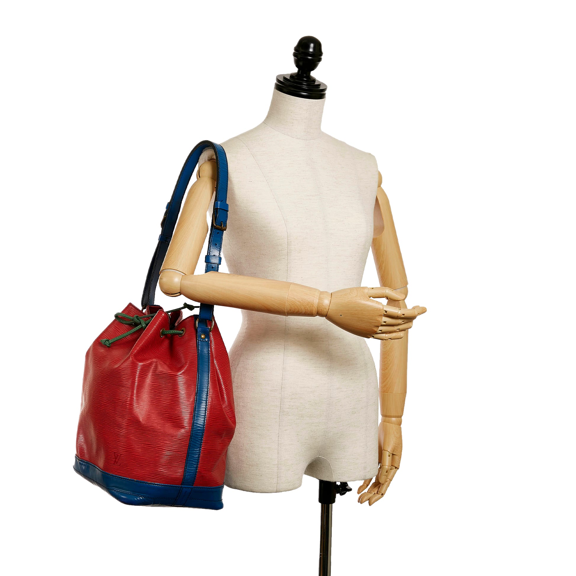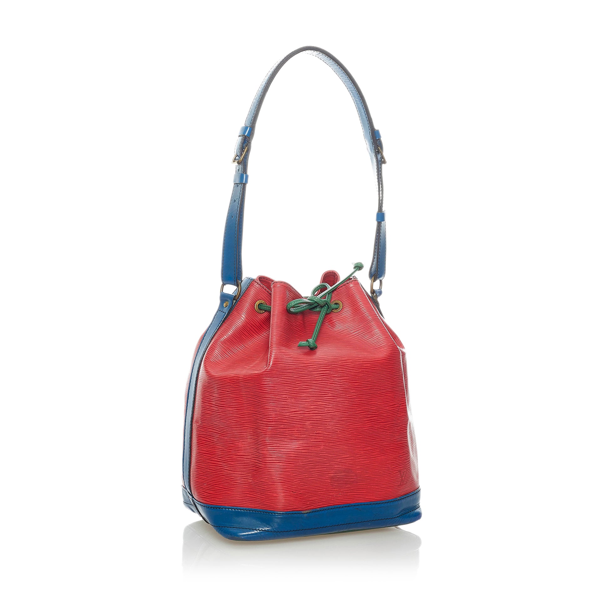 The Noe features an epi leather body, an adjustable flat strap, an open top with a drawstring closure, and Alcantara lining.