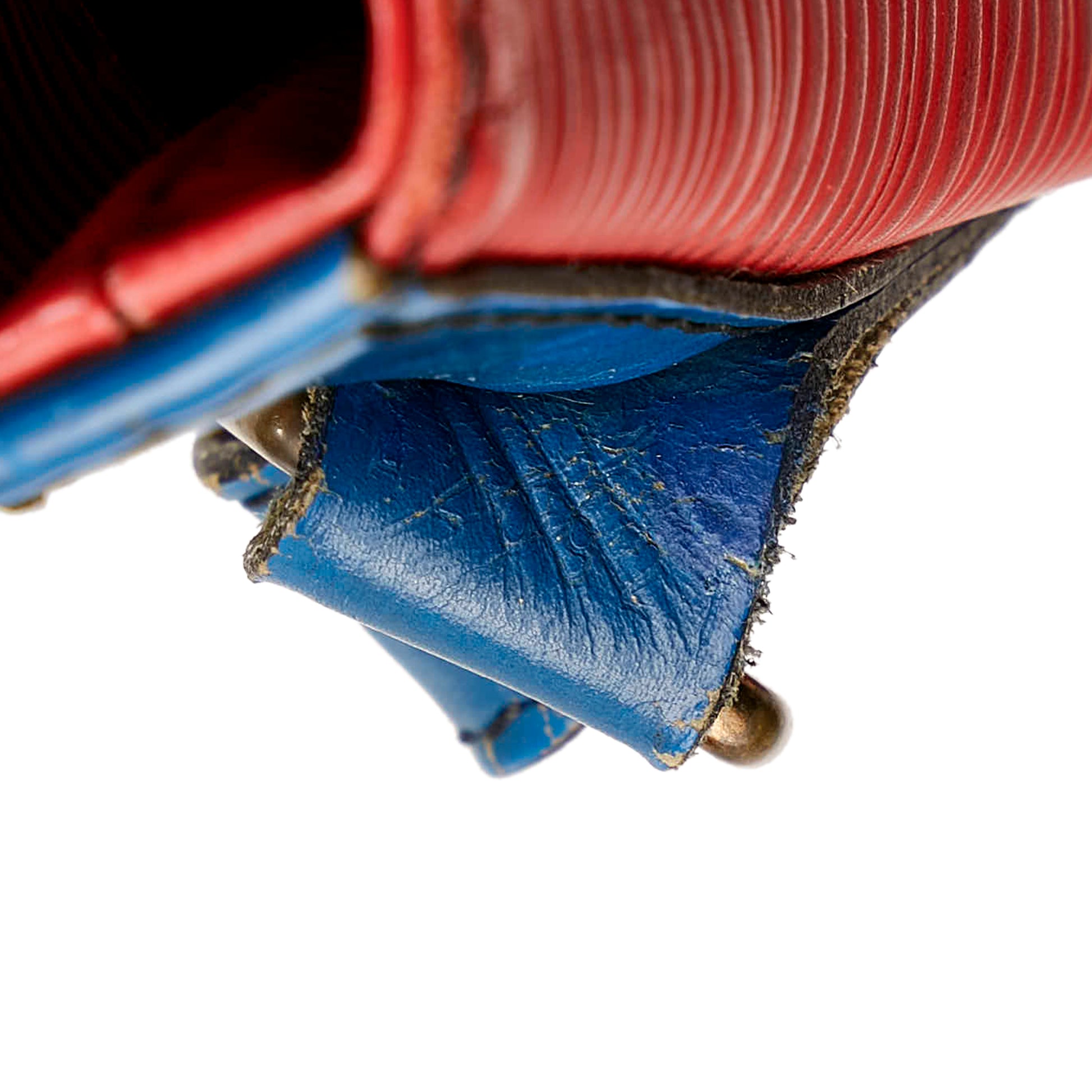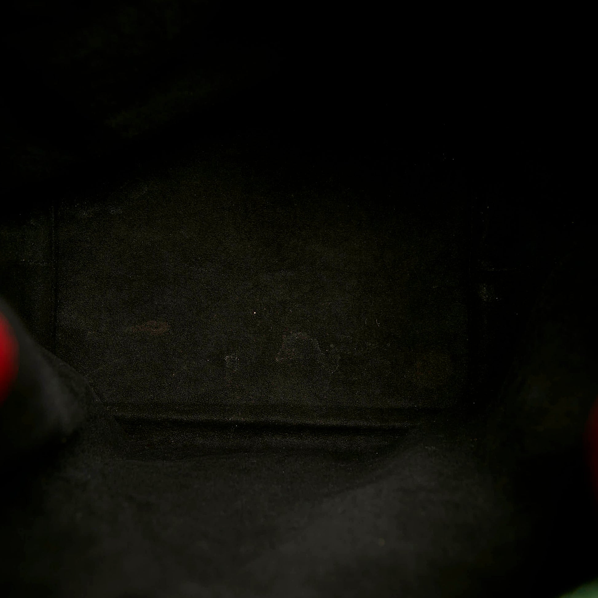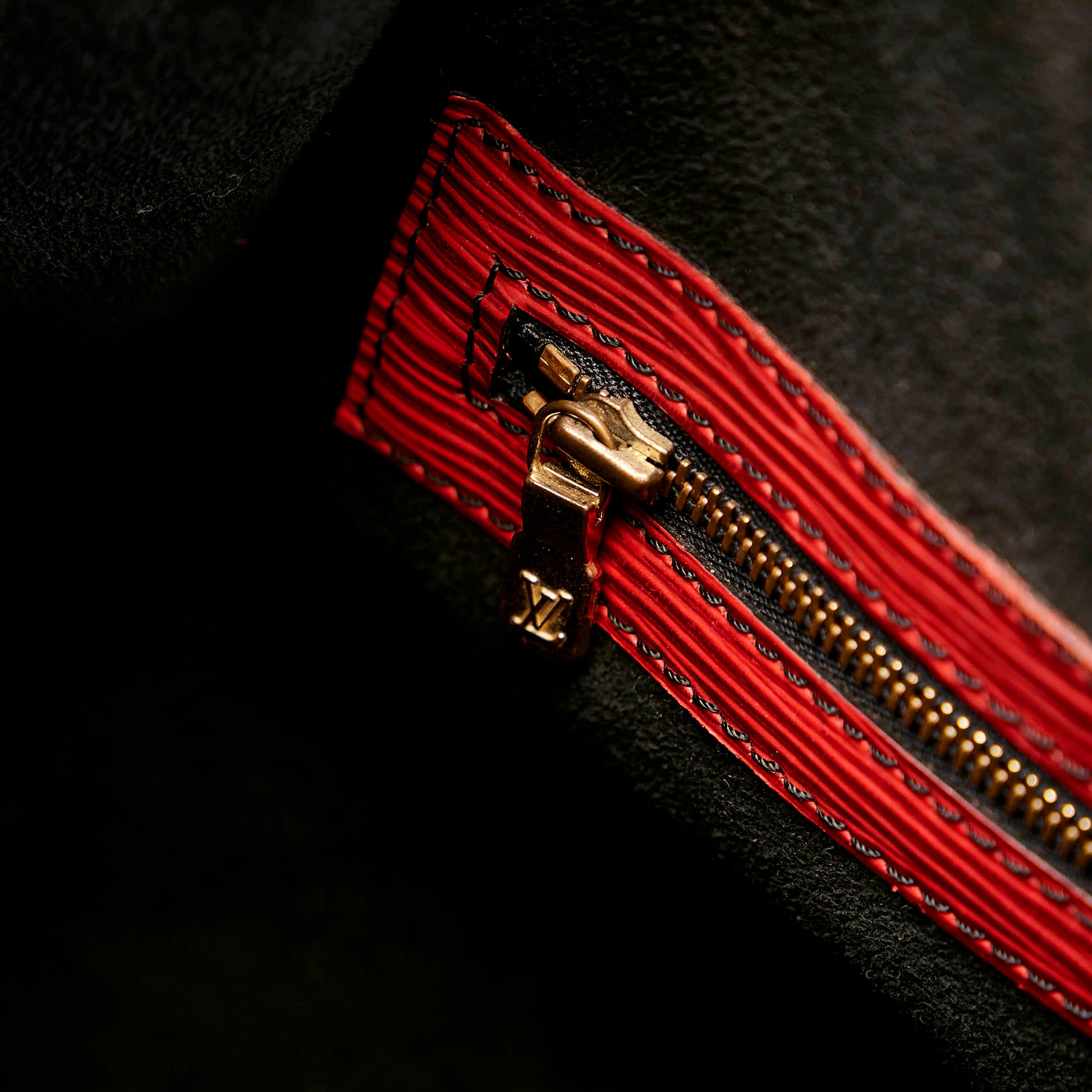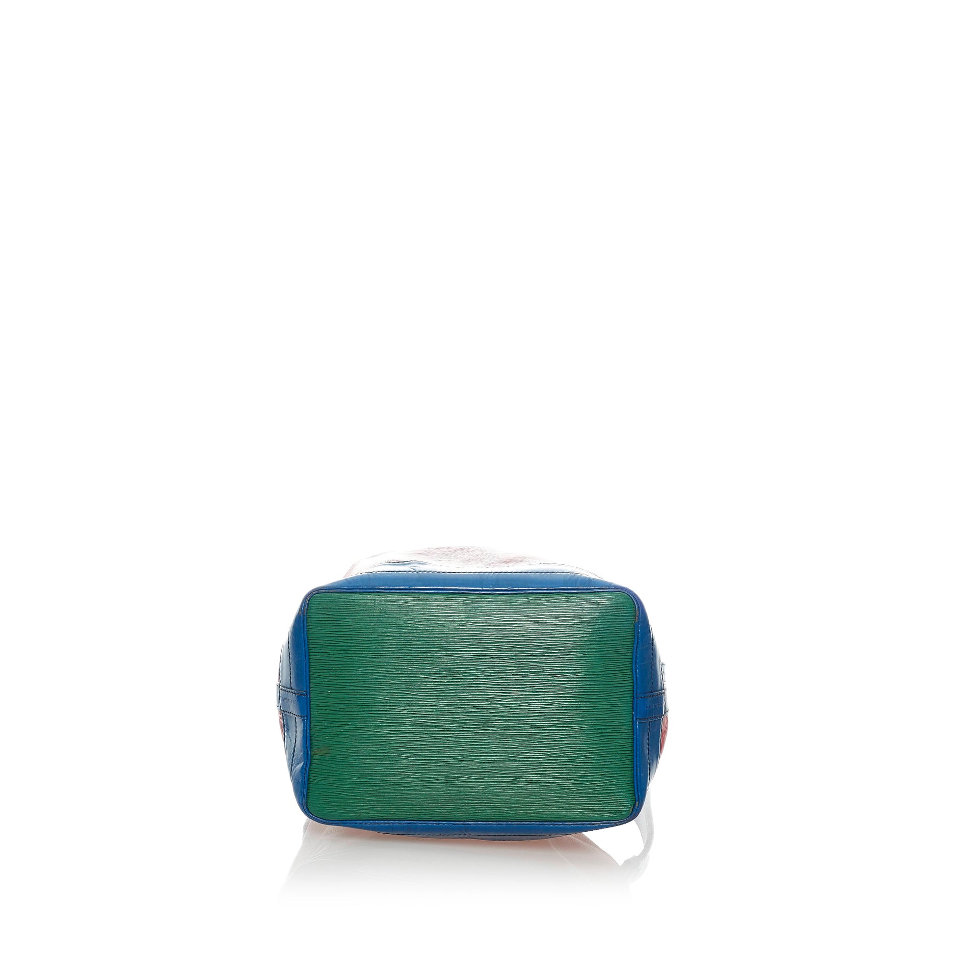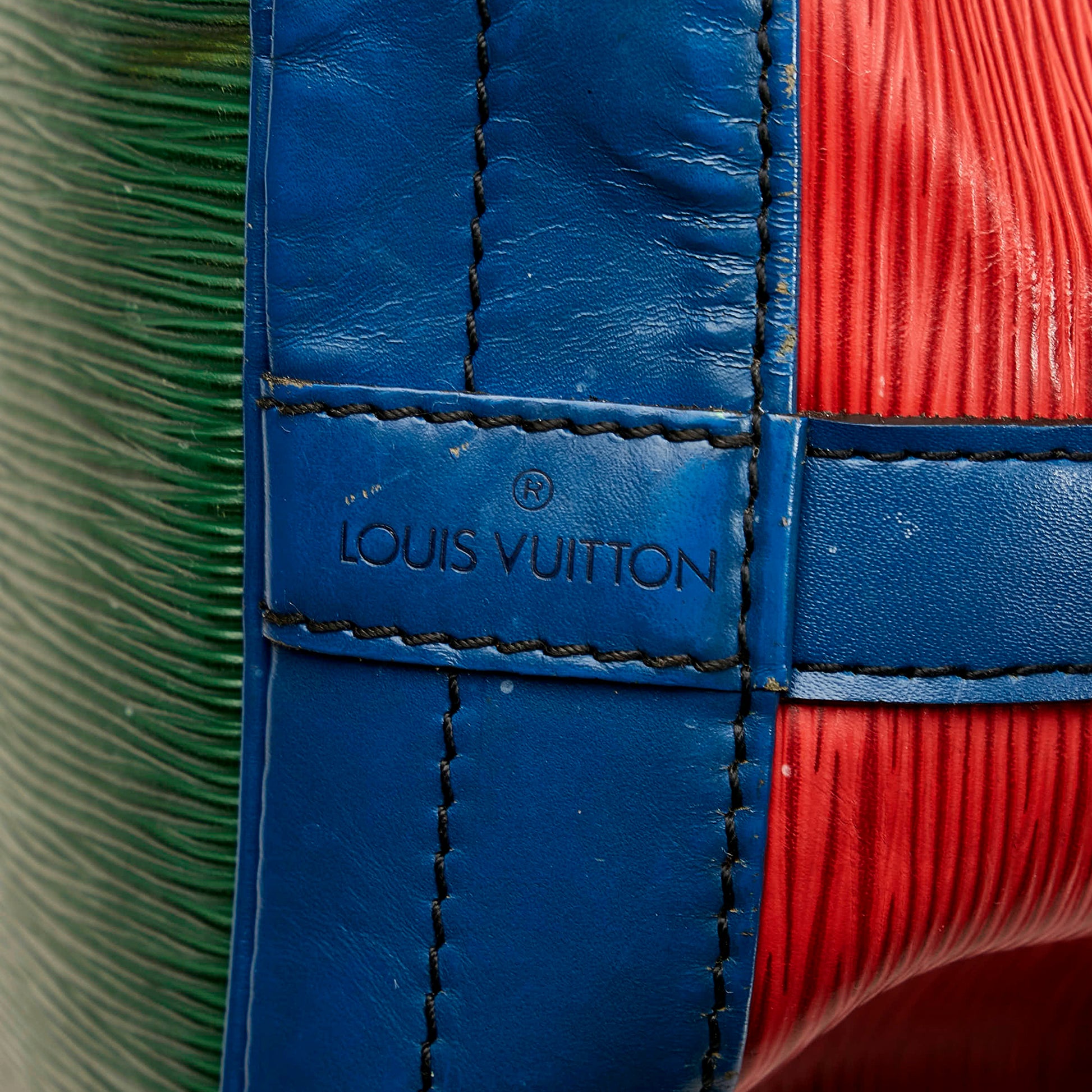 The Noe features an epi leather body, an adjustable flat strap, an open top with a drawstring closure, and Alcantara lining.