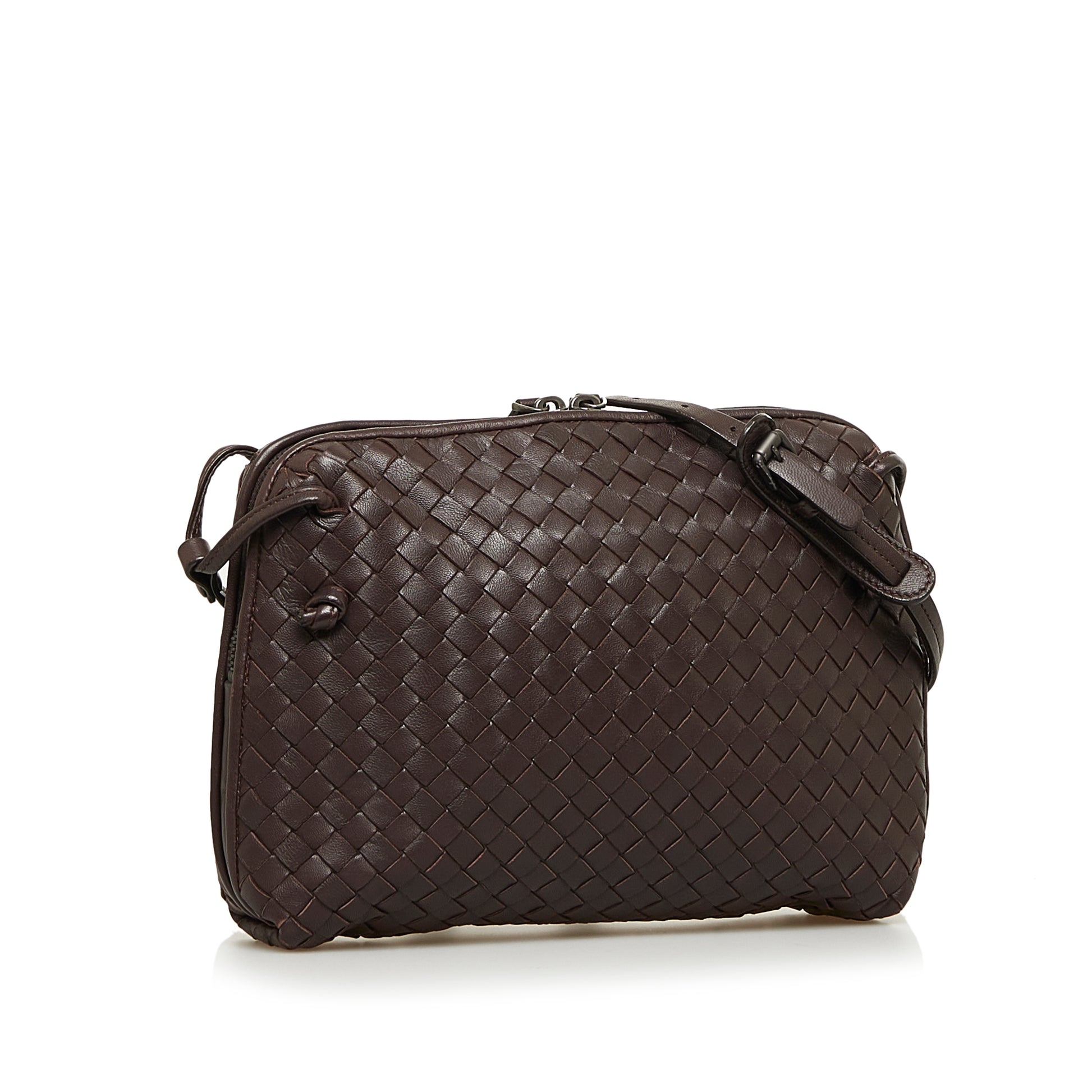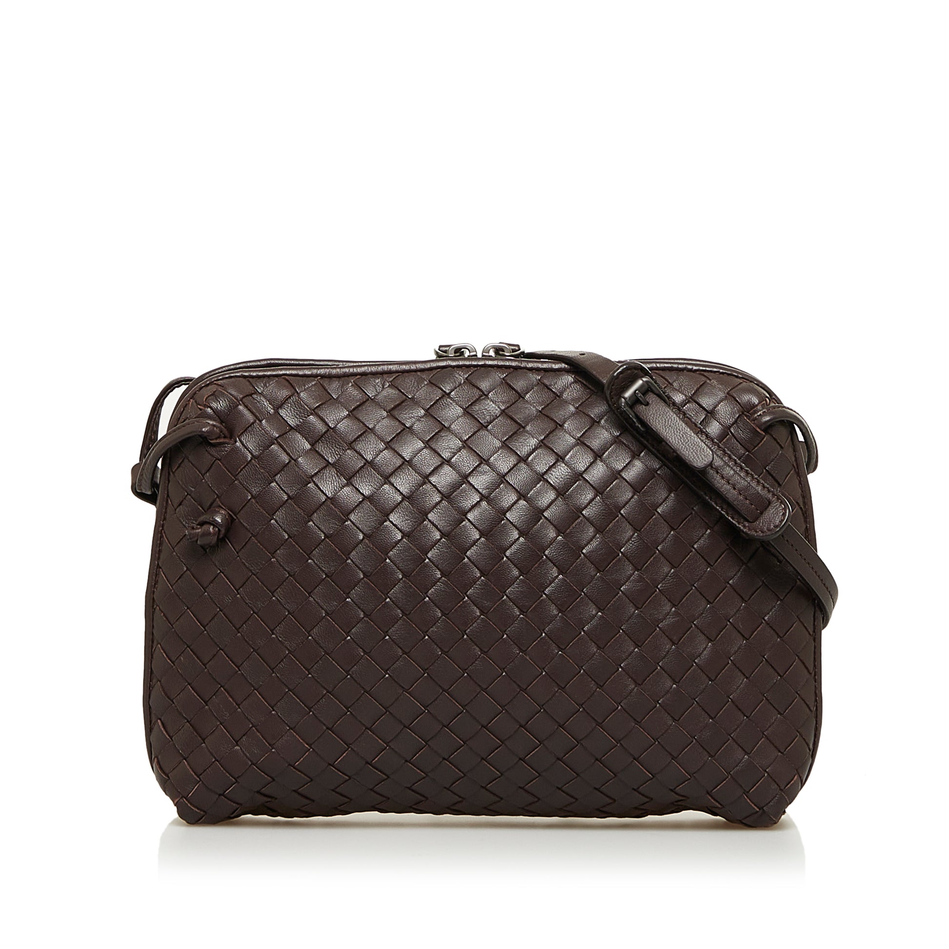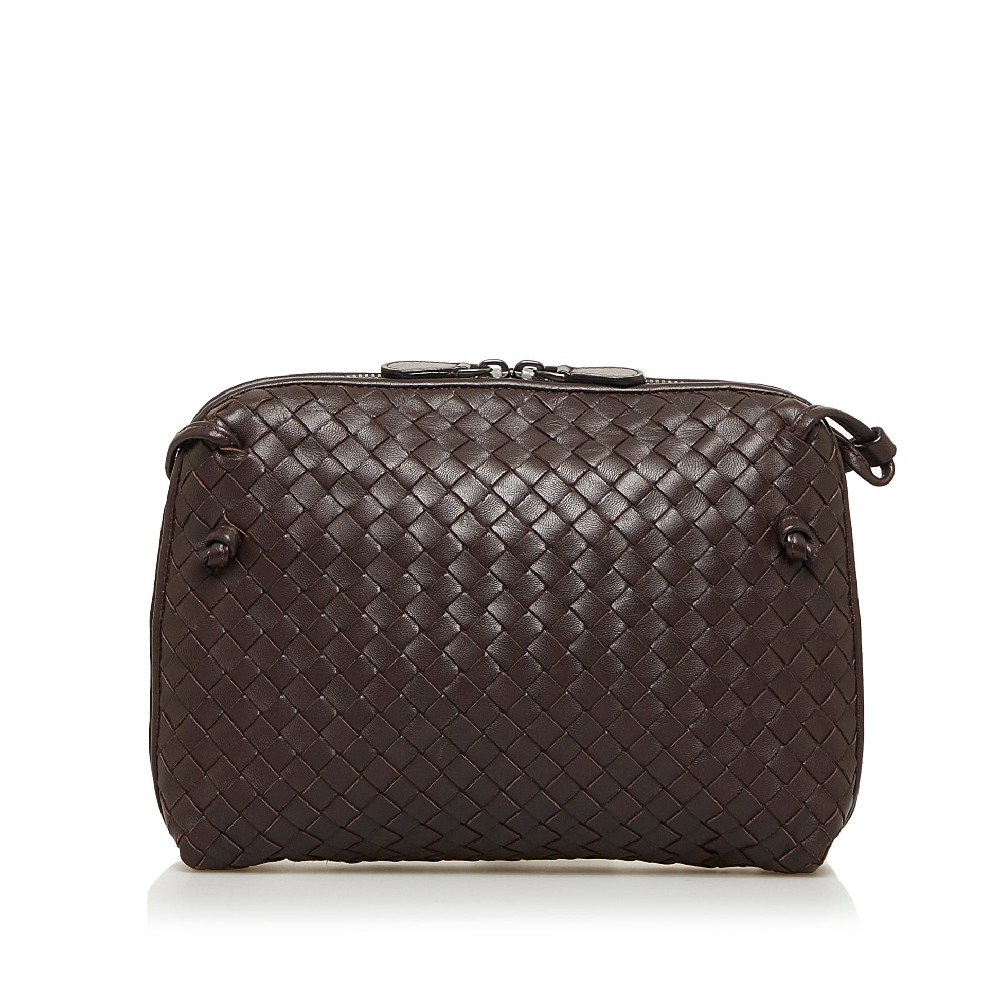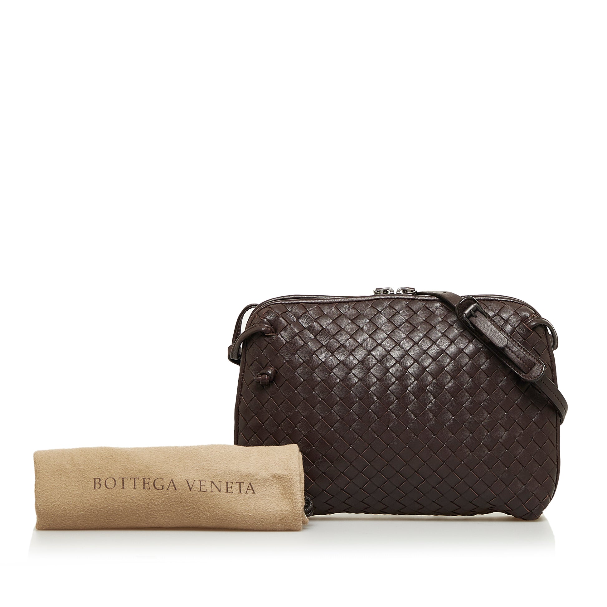 The Intrecciato Nodini crossbody bag features a woven leather body, a flat leather strap, a top zip closure, and interior zip and slip pockets.
