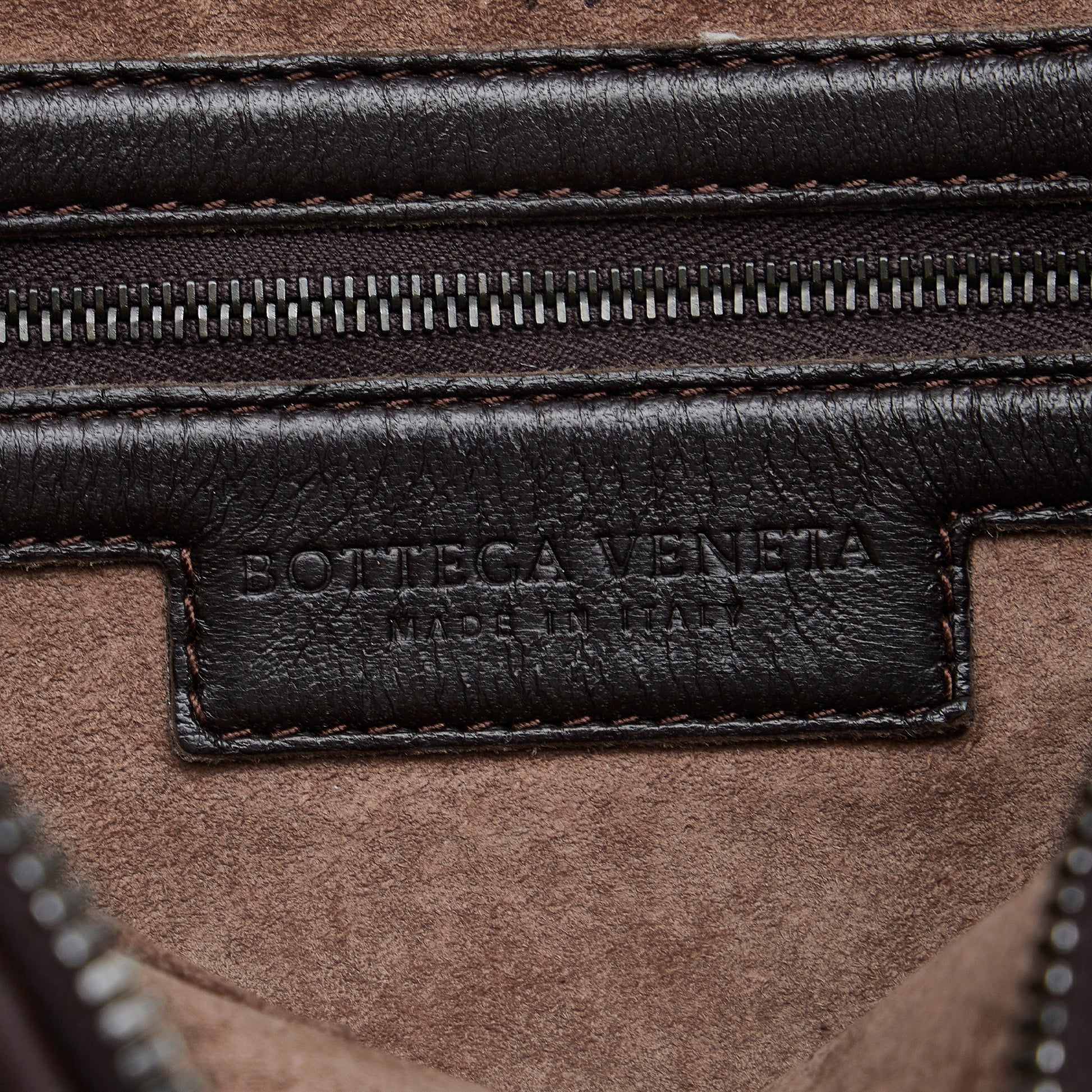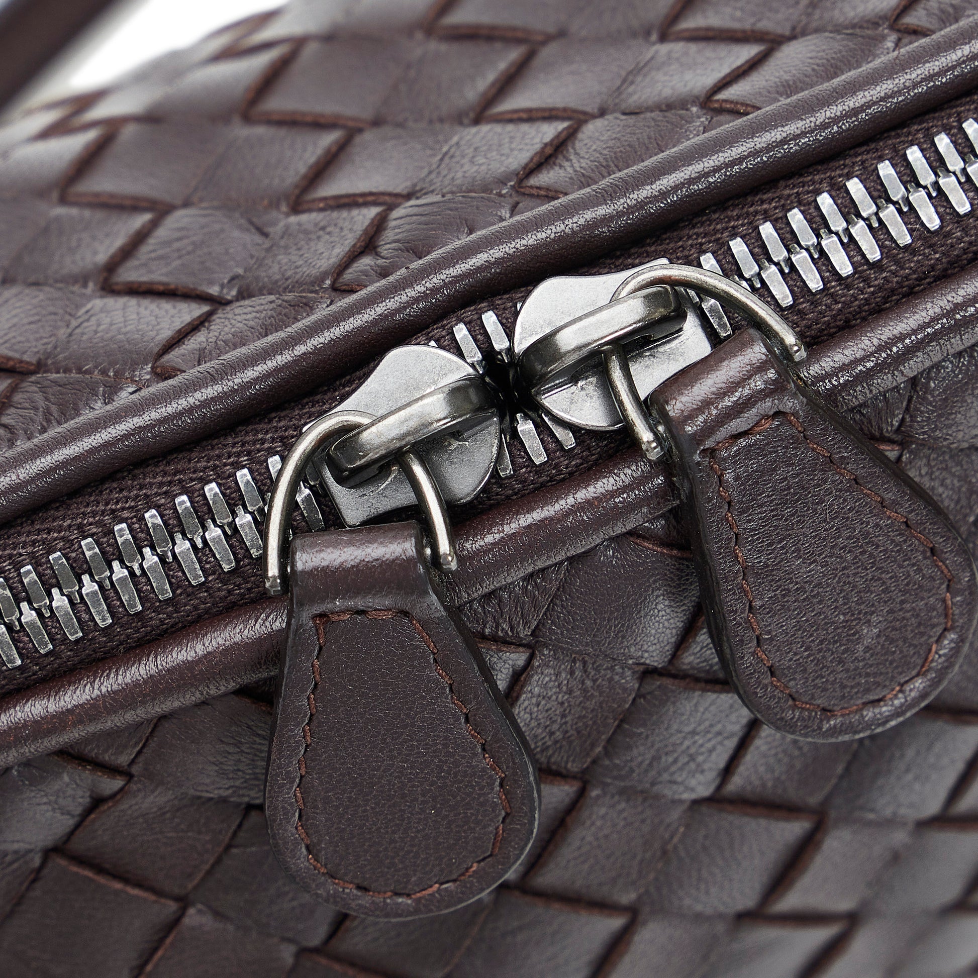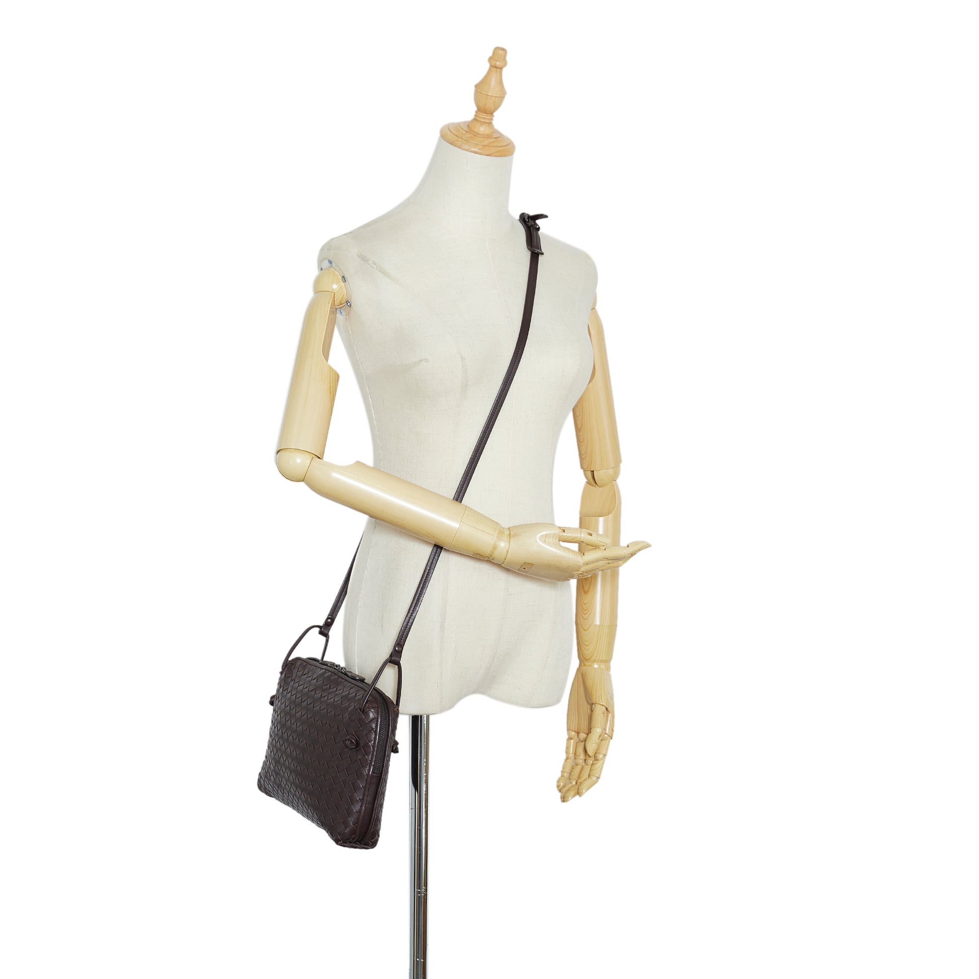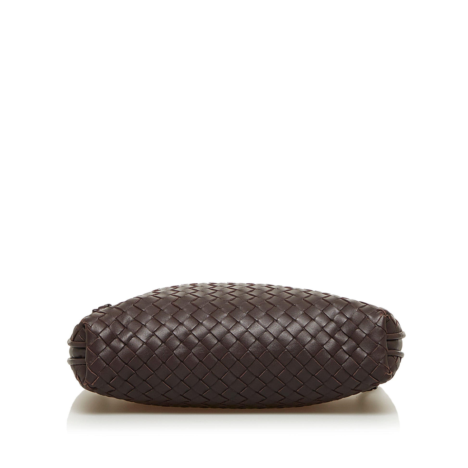 The Intrecciato Nodini crossbody bag features a woven leather body, a flat leather strap, a top zip closure, and interior zip and slip pockets.