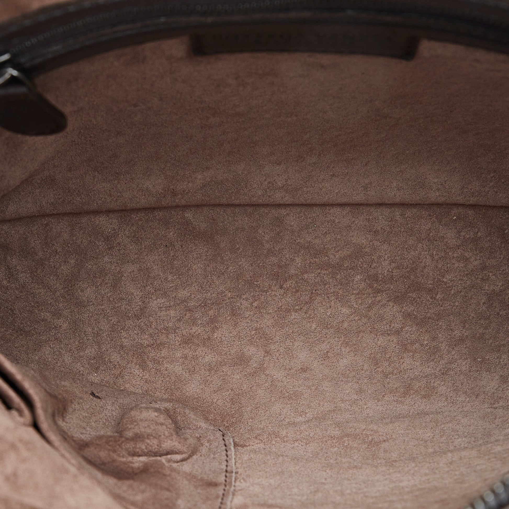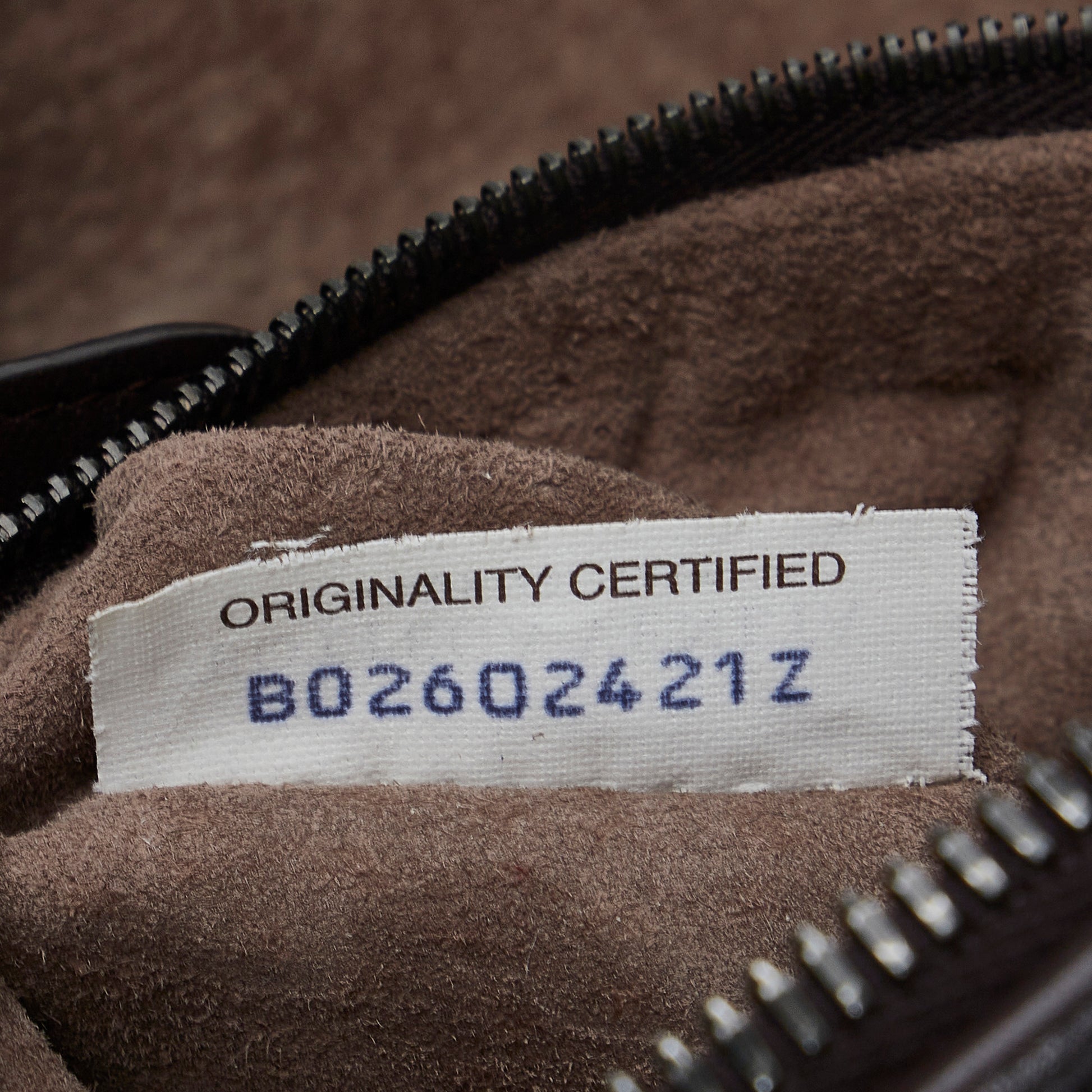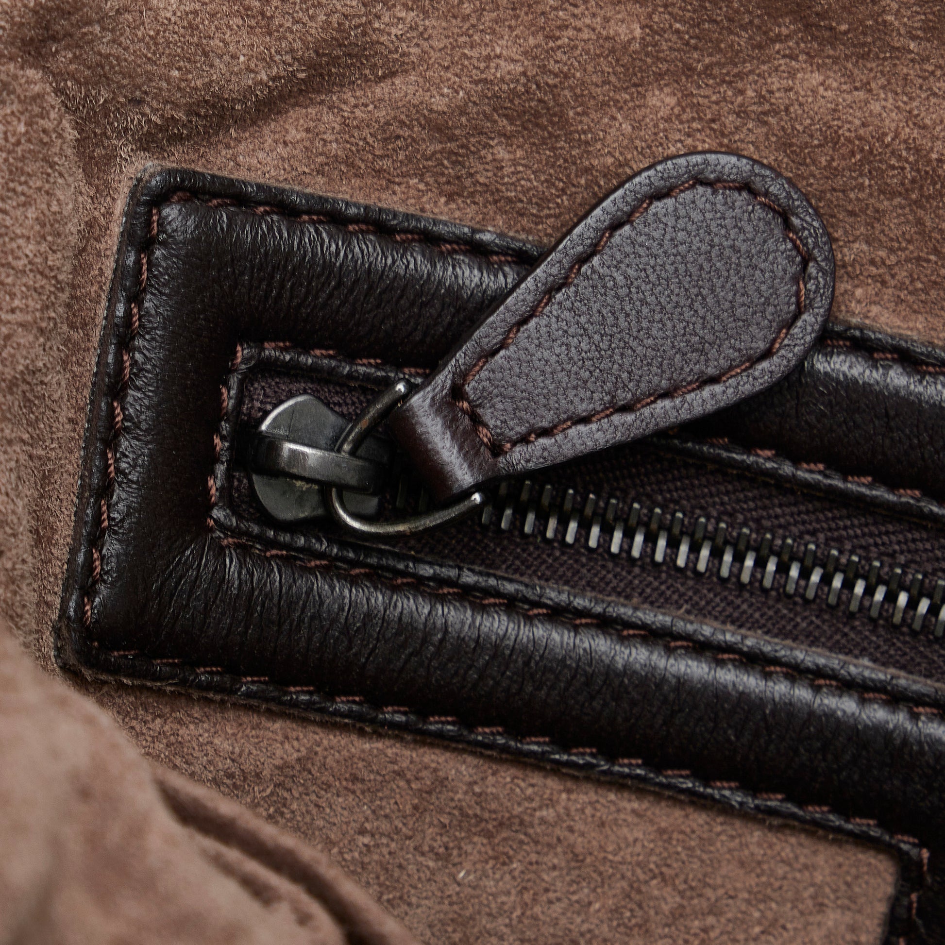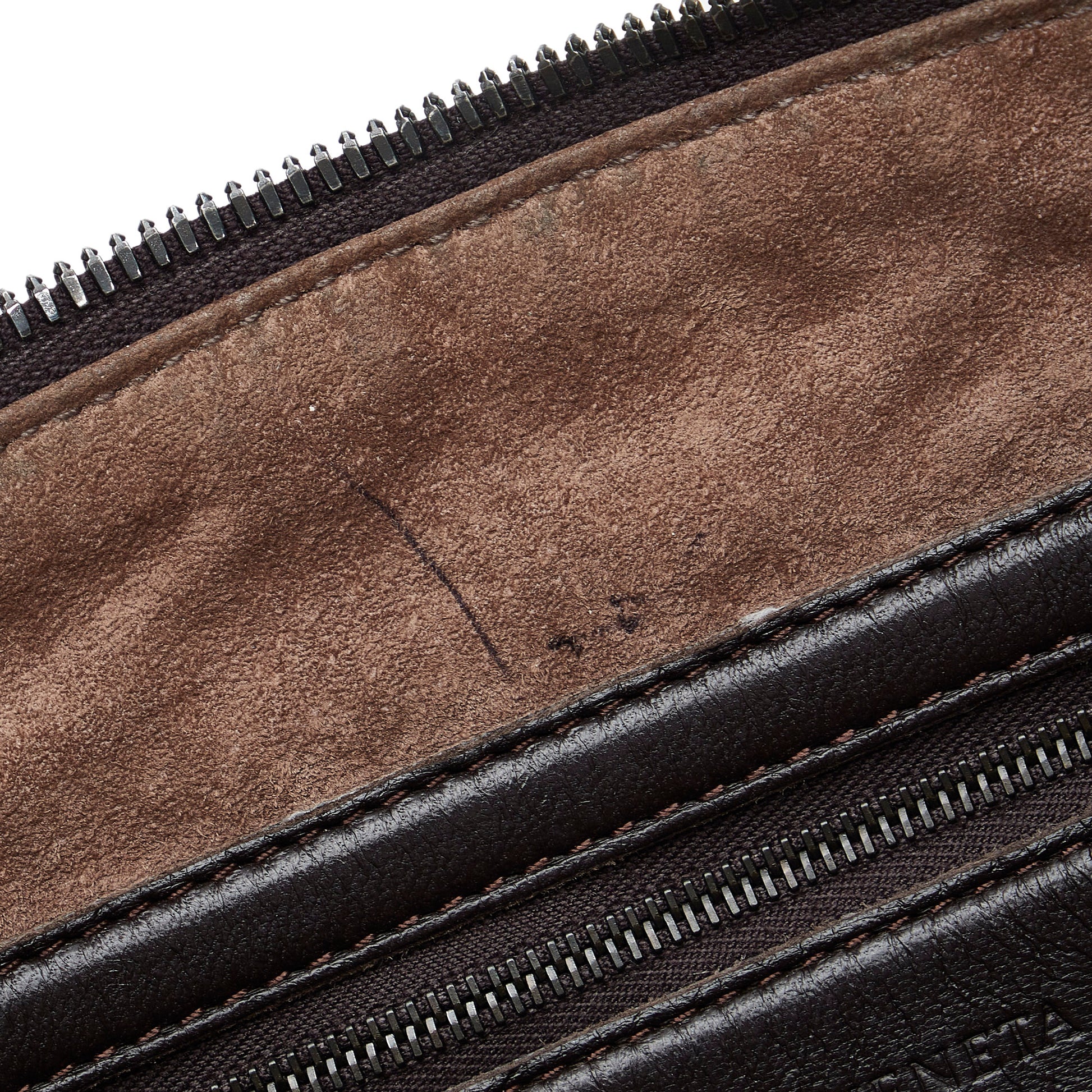 The Intrecciato Nodini crossbody bag features a woven leather body, a flat leather strap, a top zip closure, and interior zip and slip pockets.