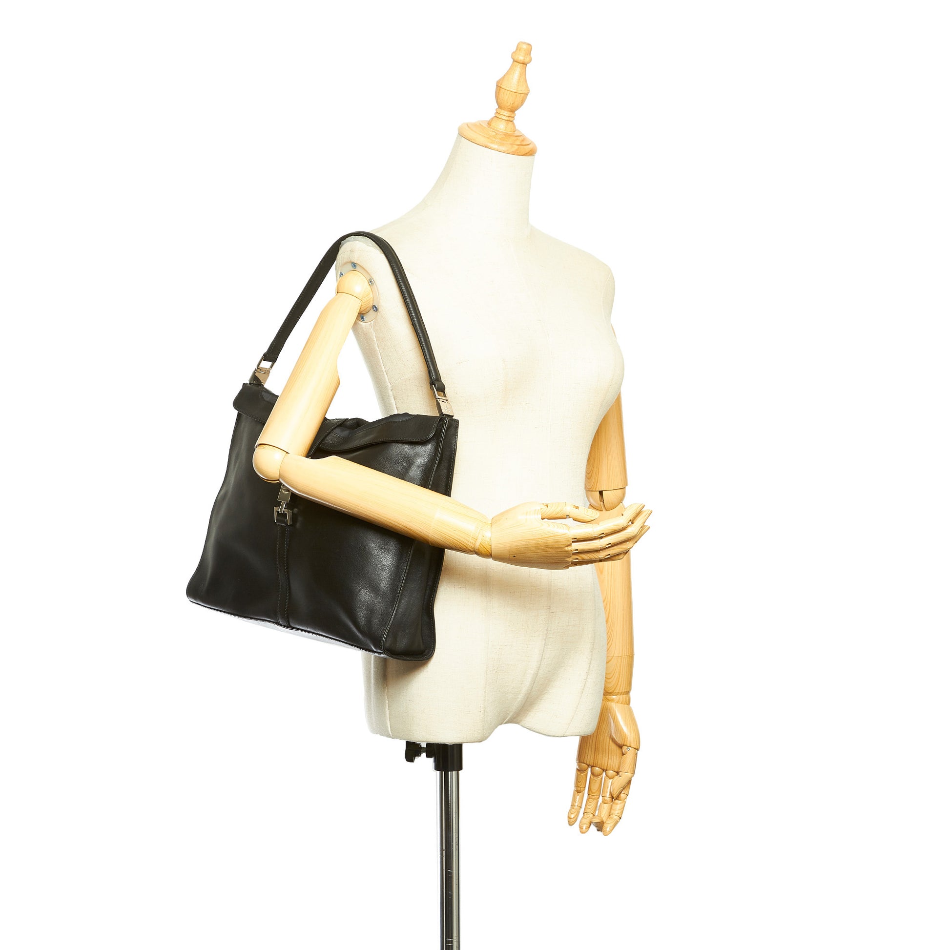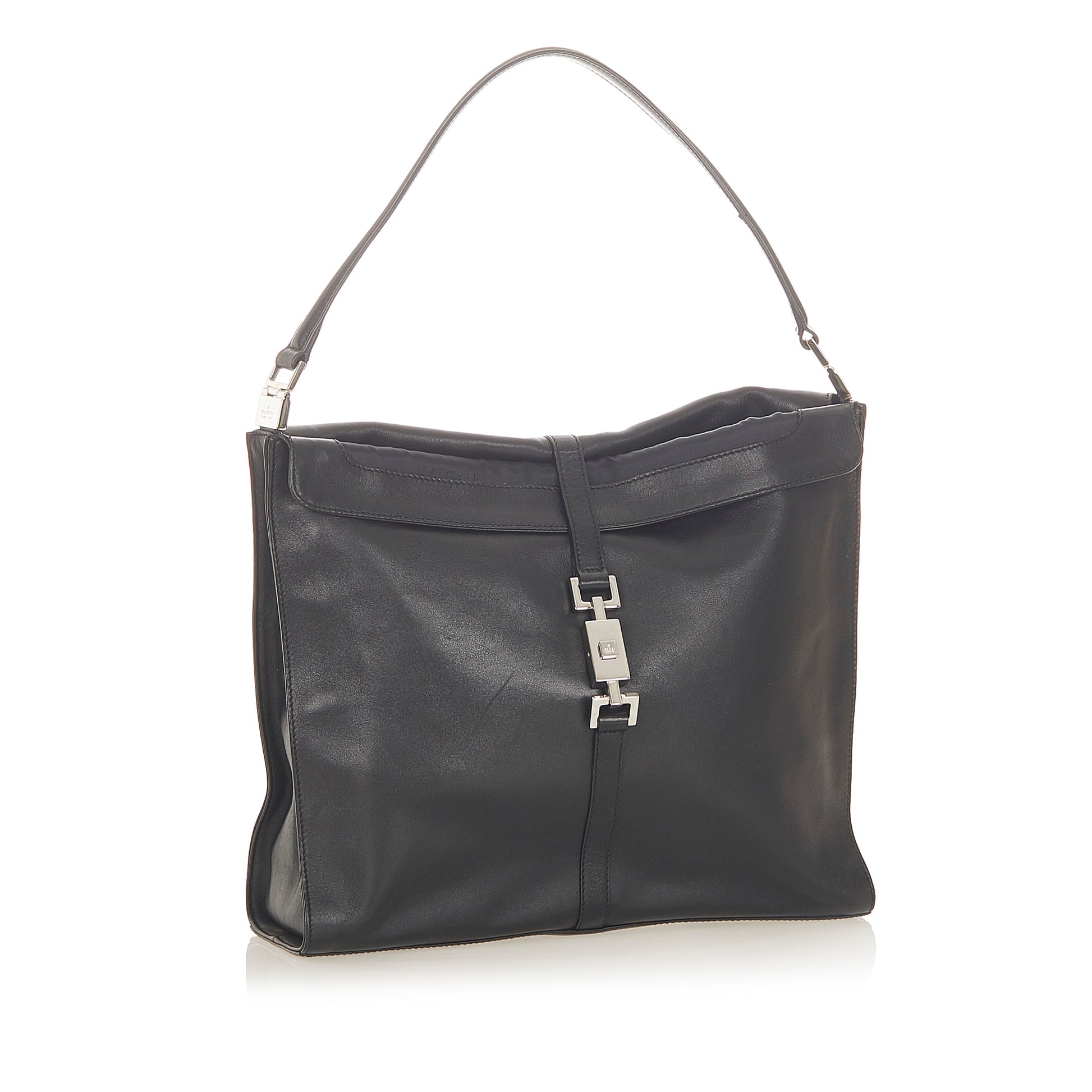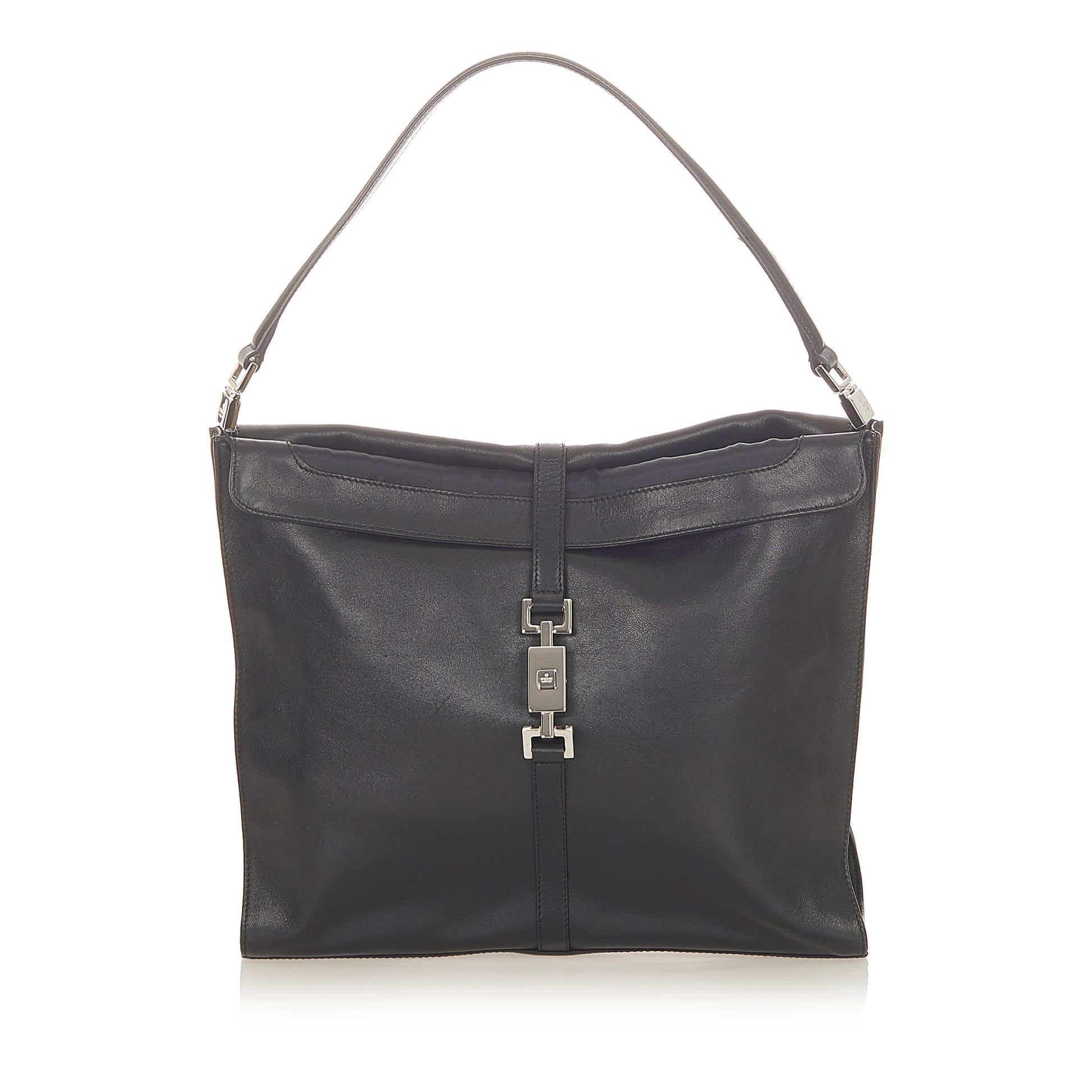 The Jackie shoulder bag features a leather body, a flat leather strap, a front flap with a push lock closure, and an interior zip pocket.