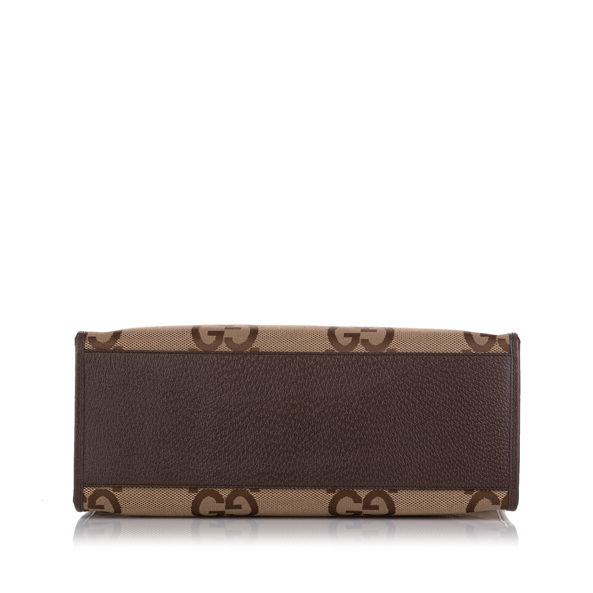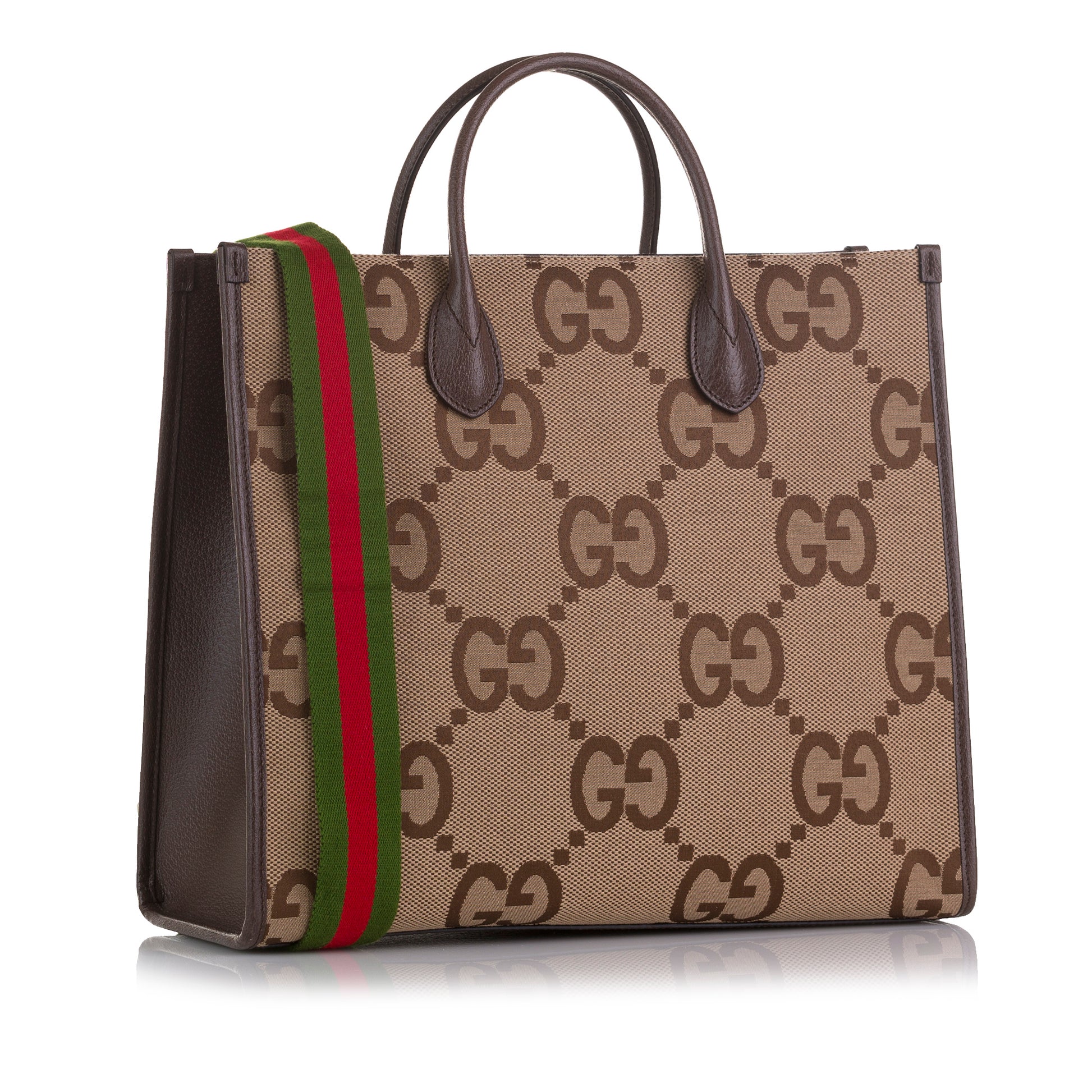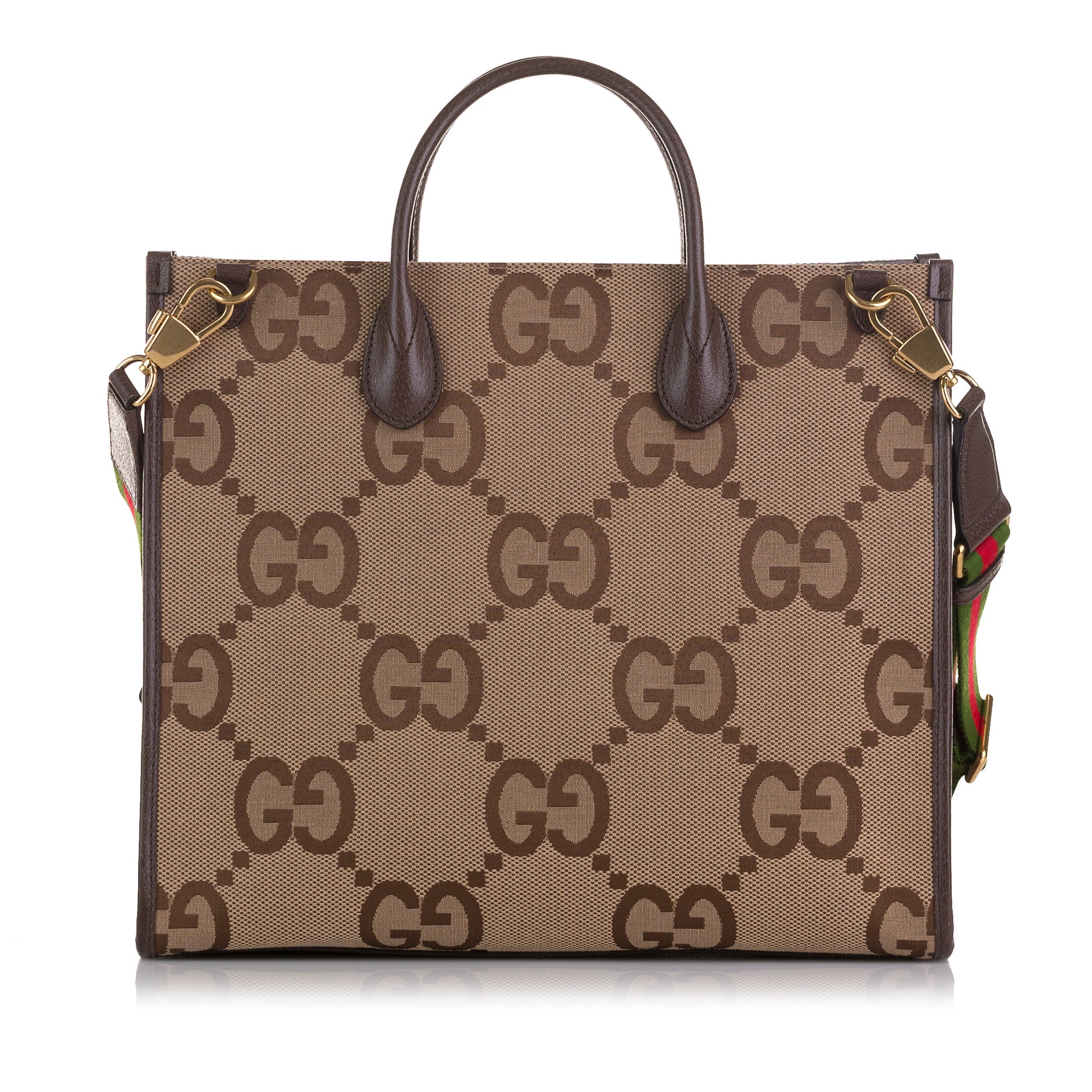This tote bag features a canvas body with leather trim, rolled leather handles, a detachable flat nylon web strap, an open top with hook closure, and an interior zip pocket.