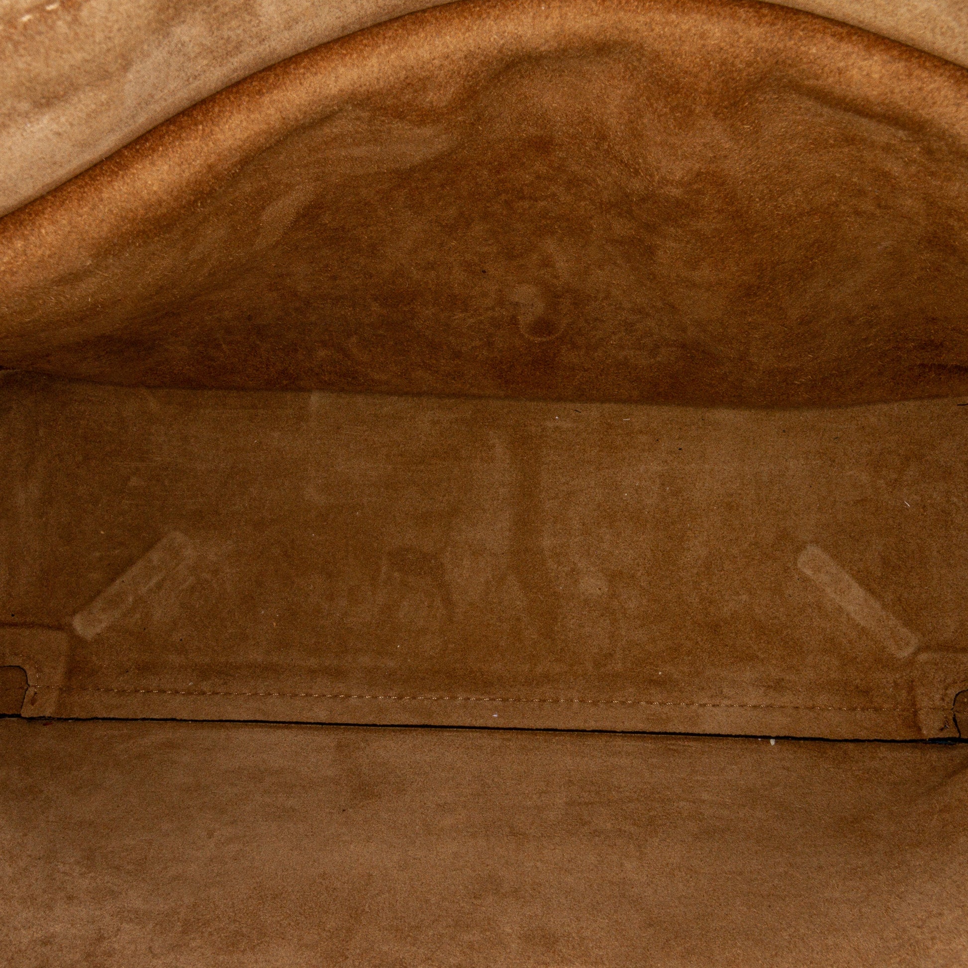 This satchel features a leather body, flat leather handles, a detachable strap, zip around closure, and an interior slip pocket.