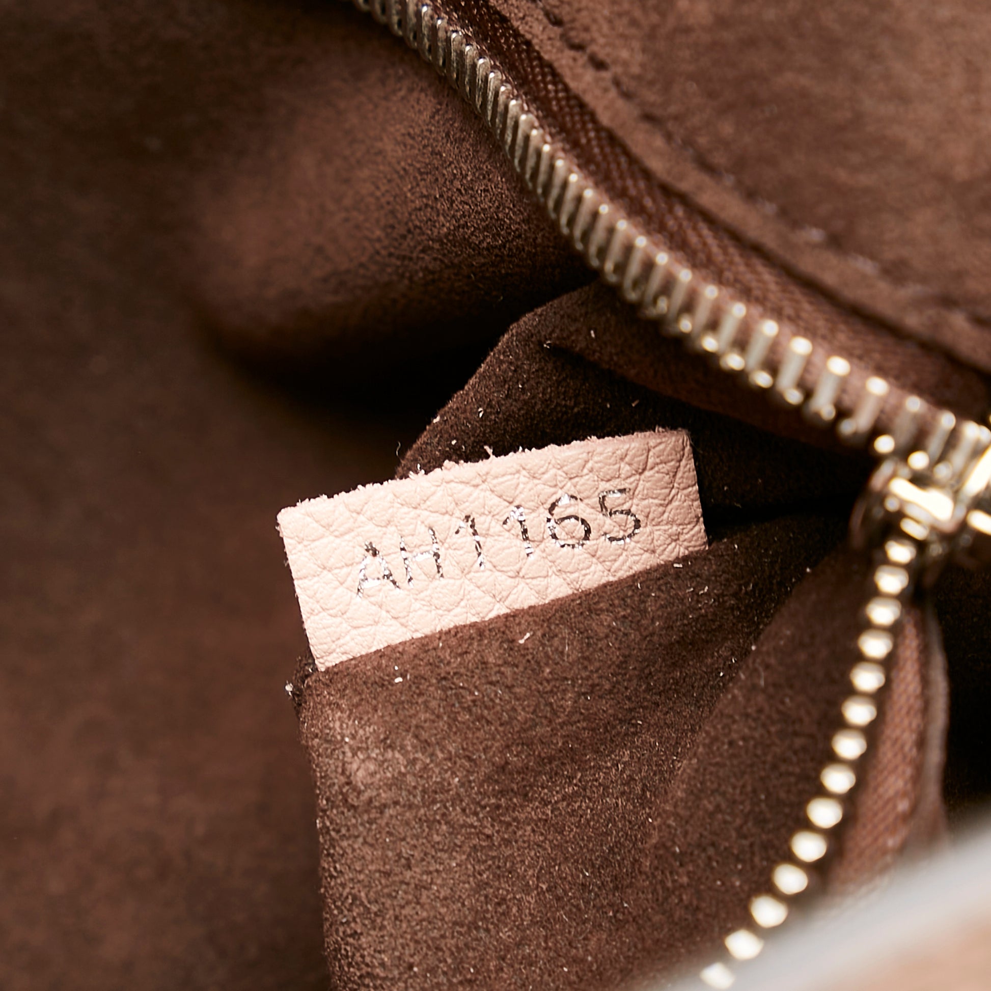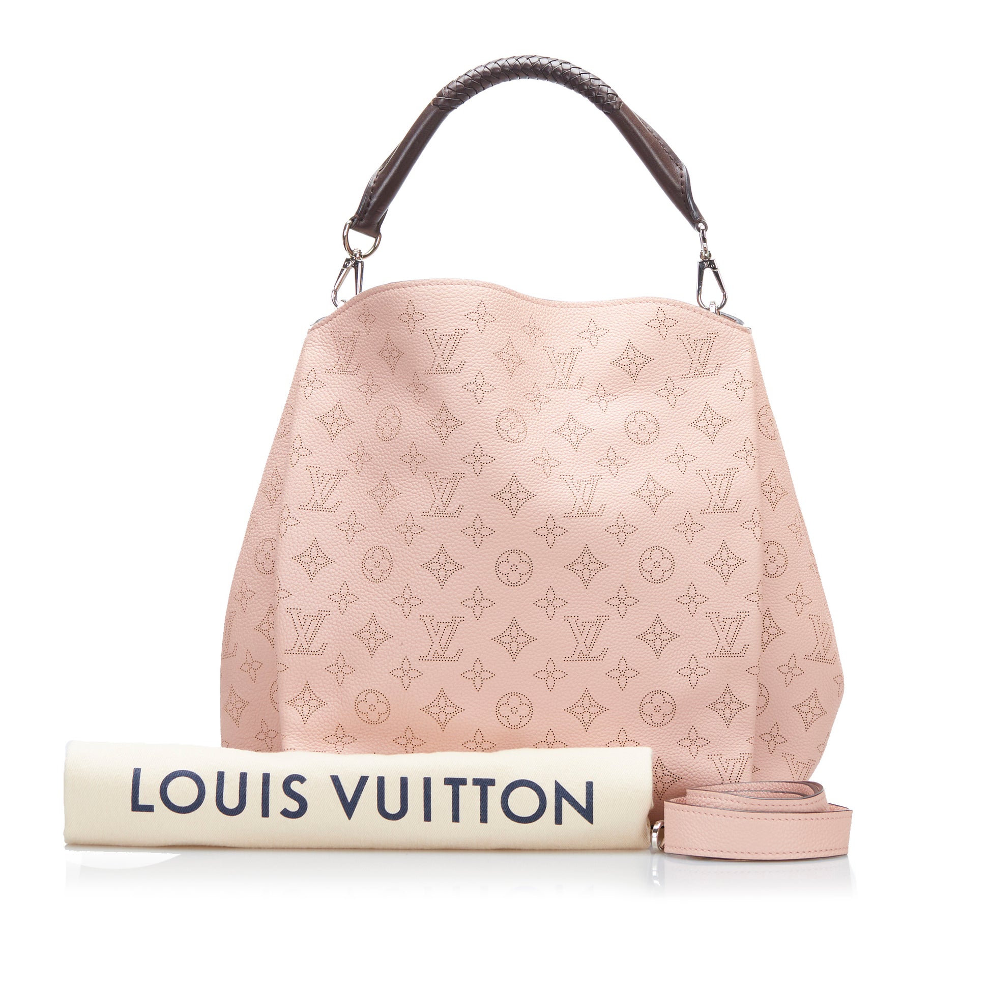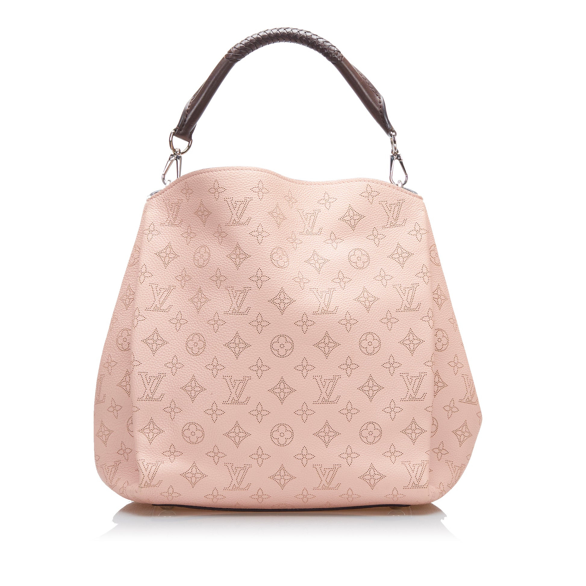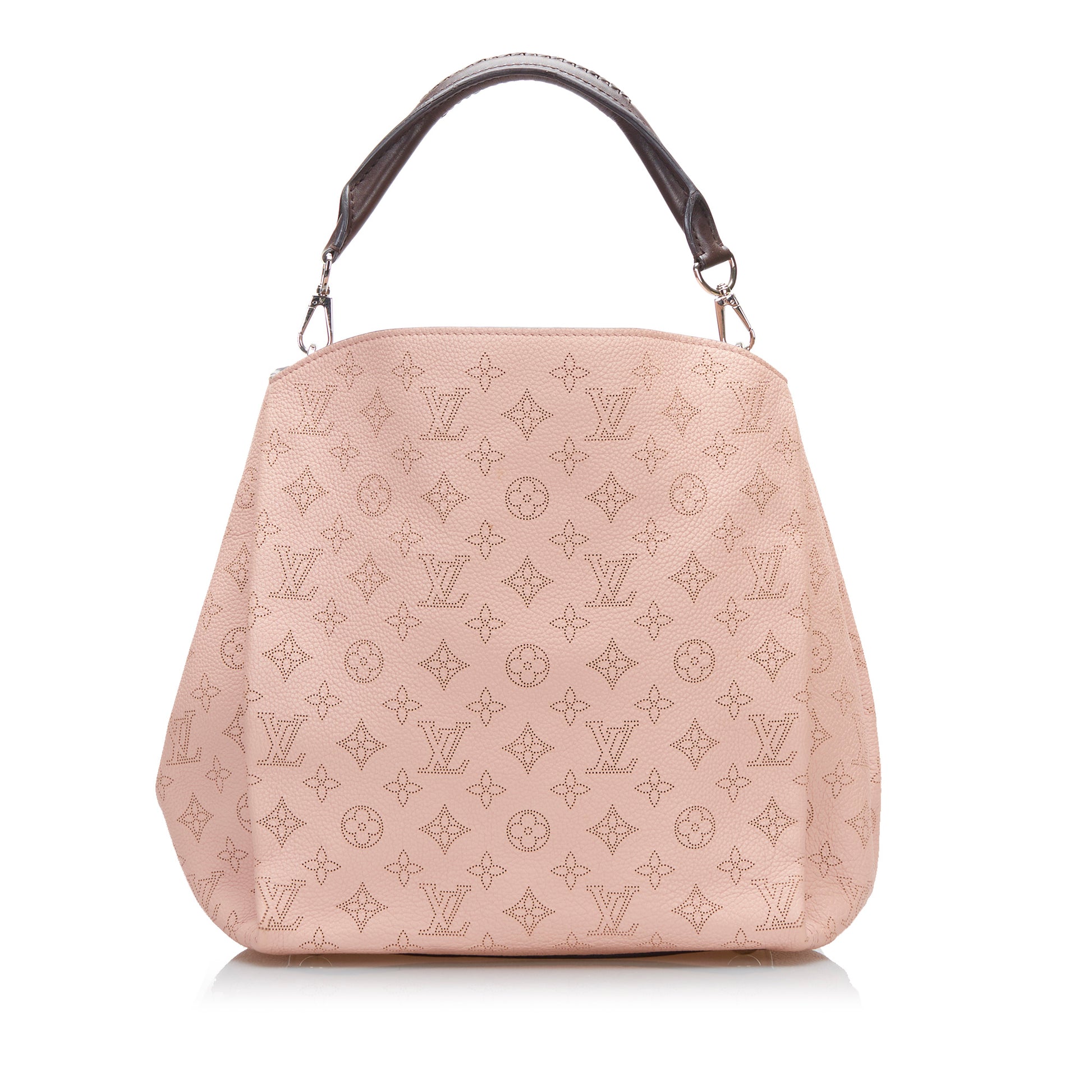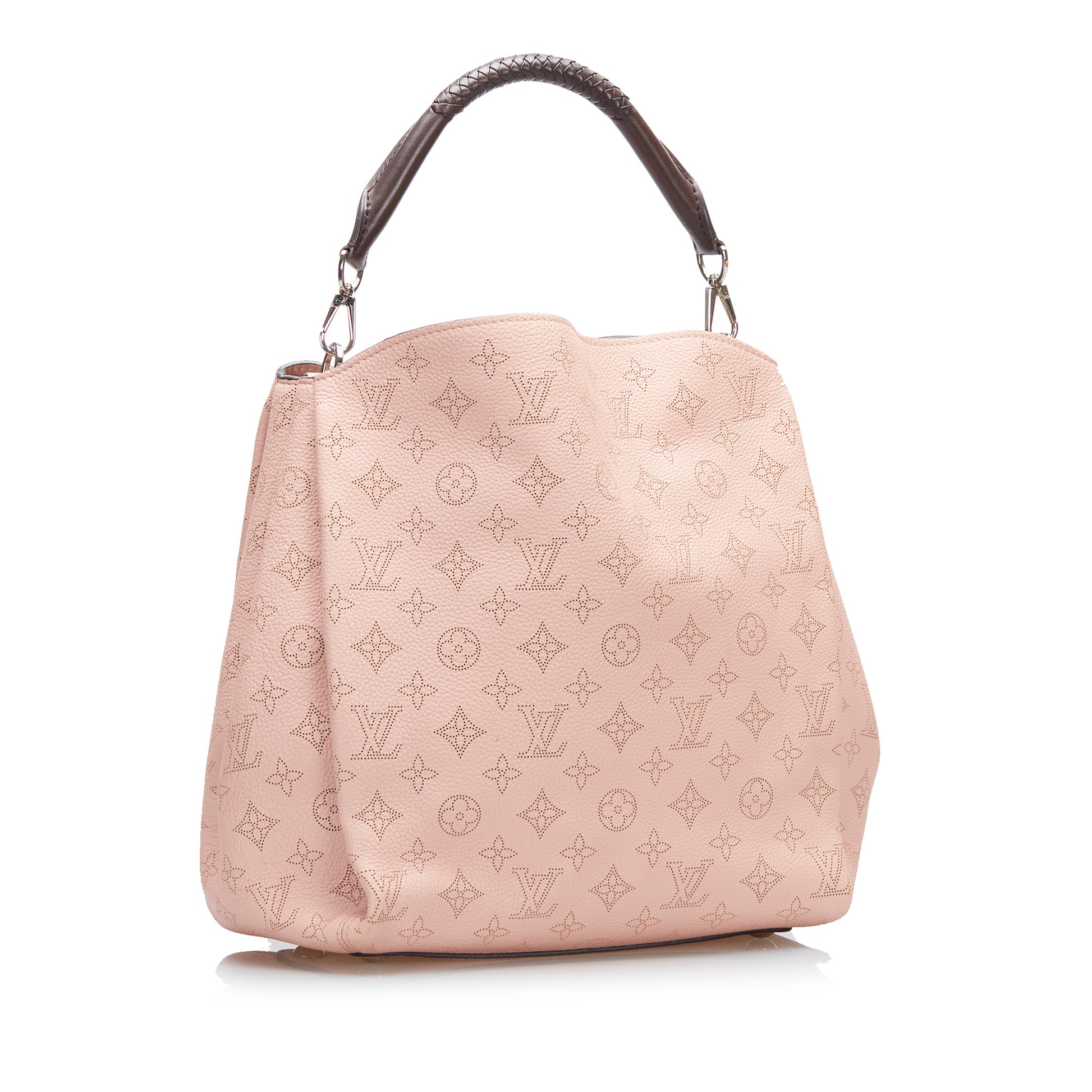 The Babylone PM features a mahina leather body, a rolled leather handle, a detachable flat shoulder strap, an open top, and an interior zip pocket.