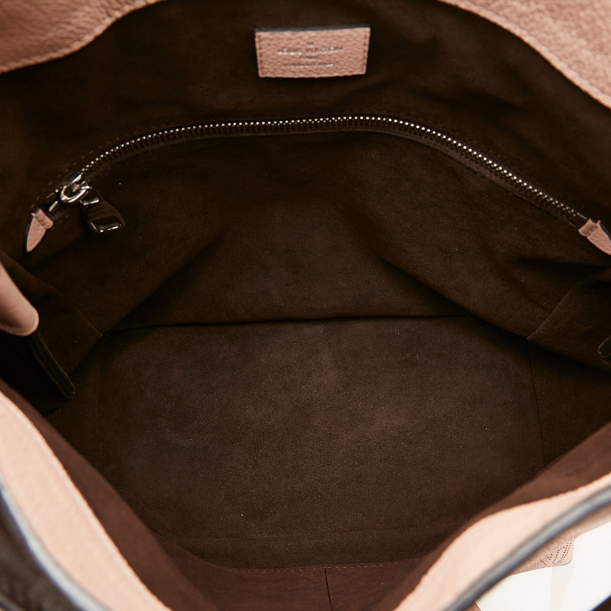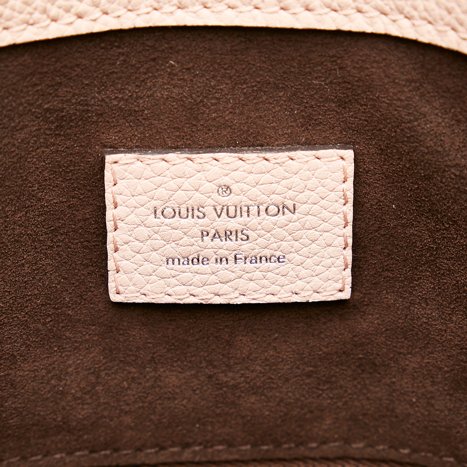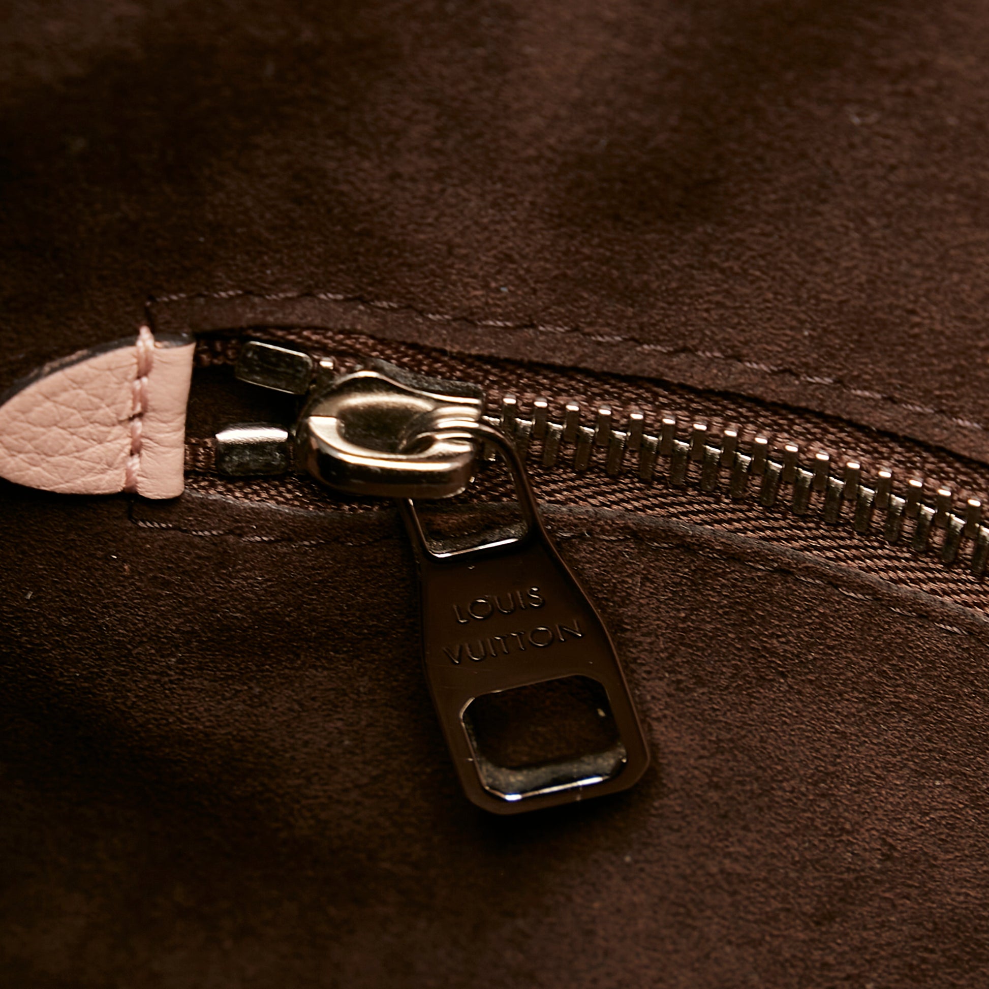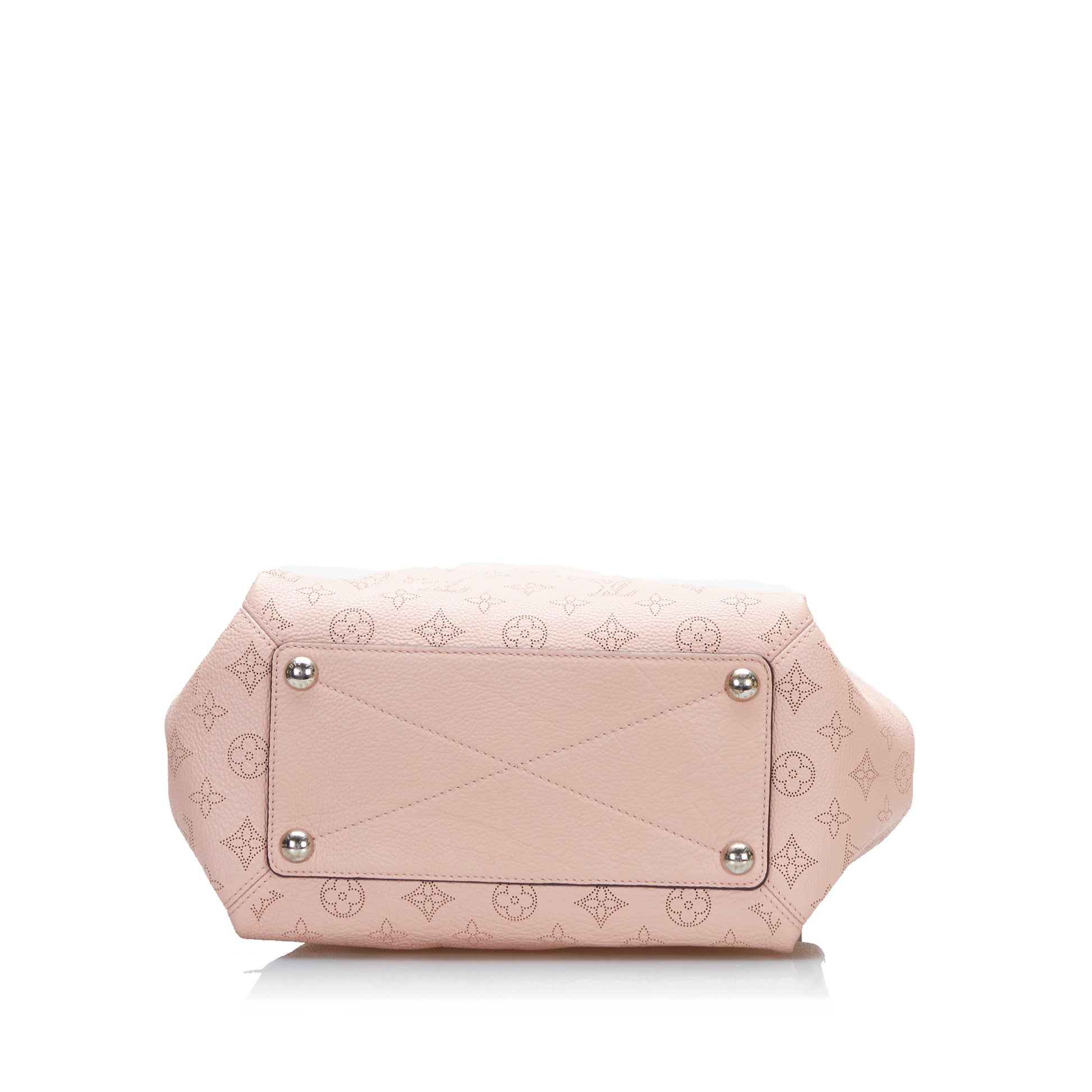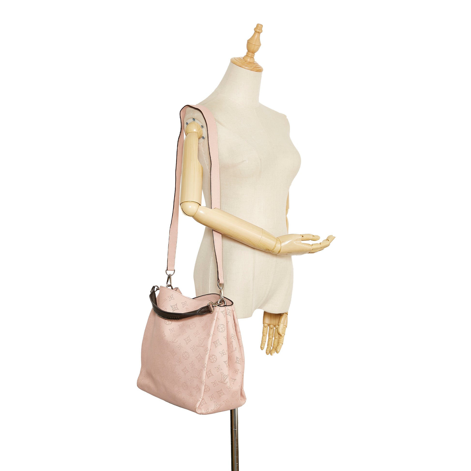 The Babylone PM features a mahina leather body, a rolled leather handle, a detachable flat shoulder strap, an open top, and an interior zip pocket.