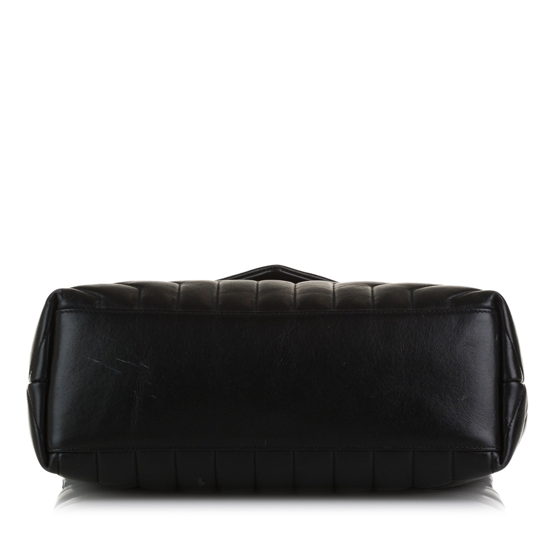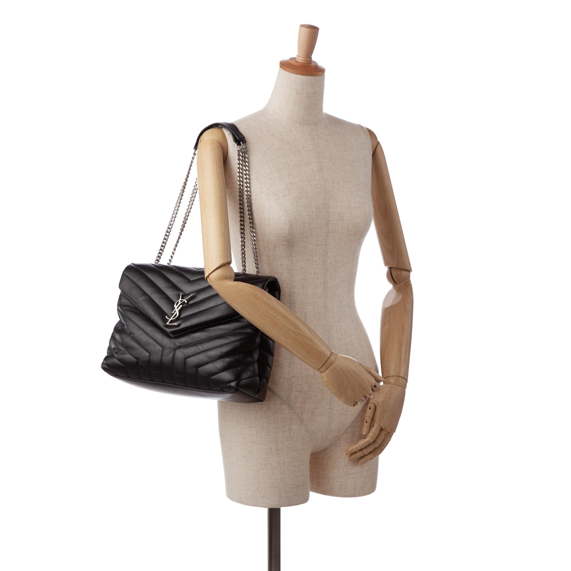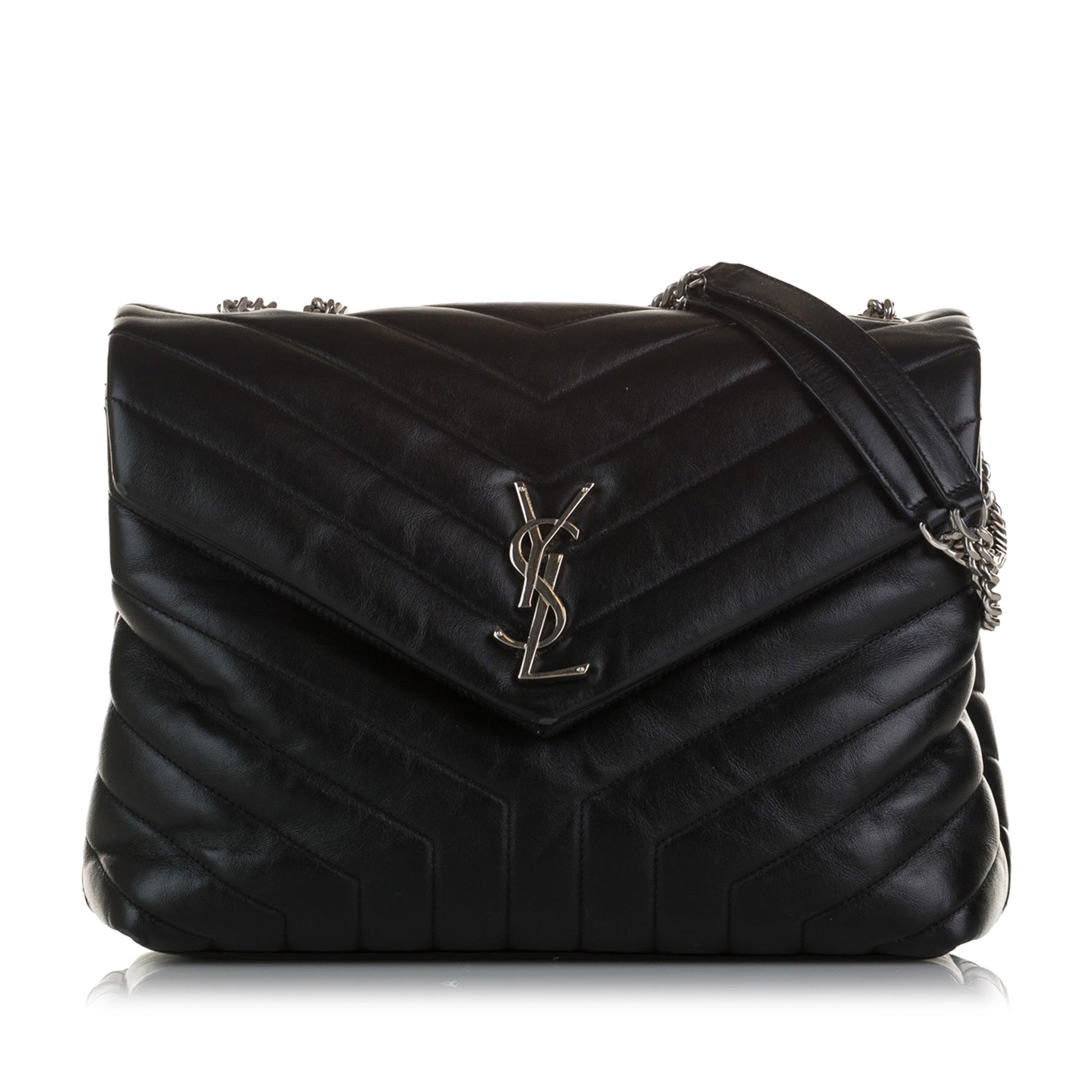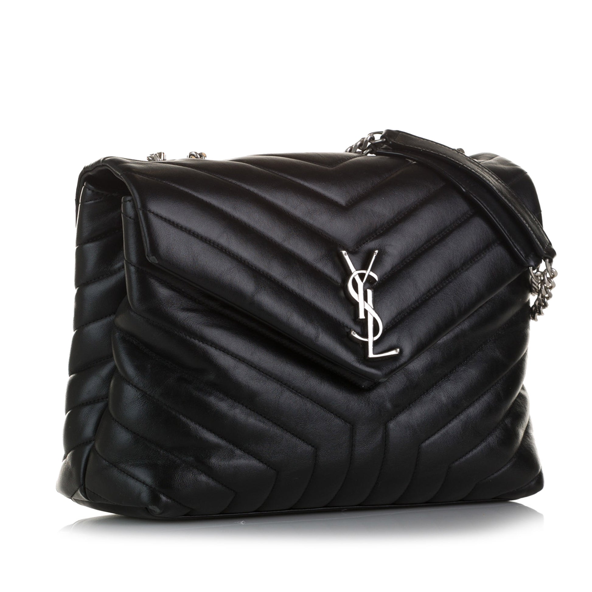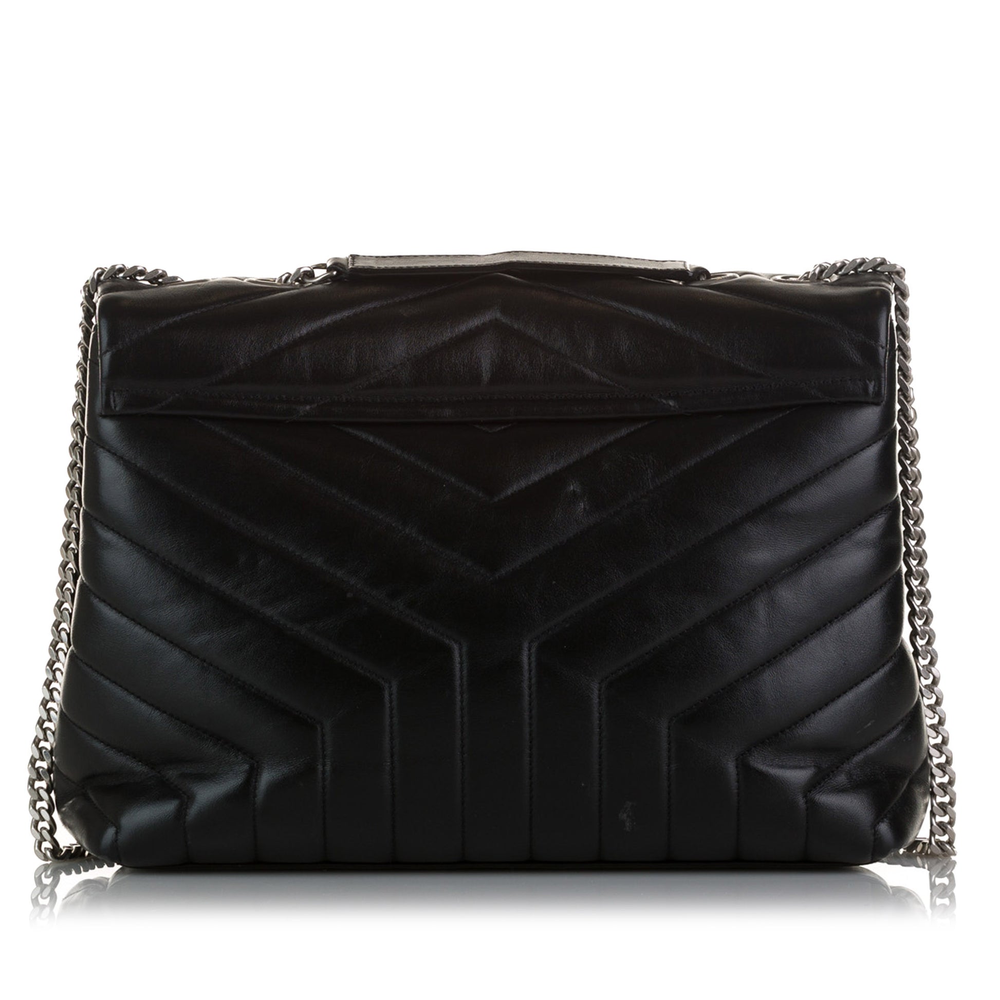 The LouLou features a quilted leather body, curb chain straps, a front flap with a magnetic snap button closure, an interior zip compartment, and an interior zip pocket.