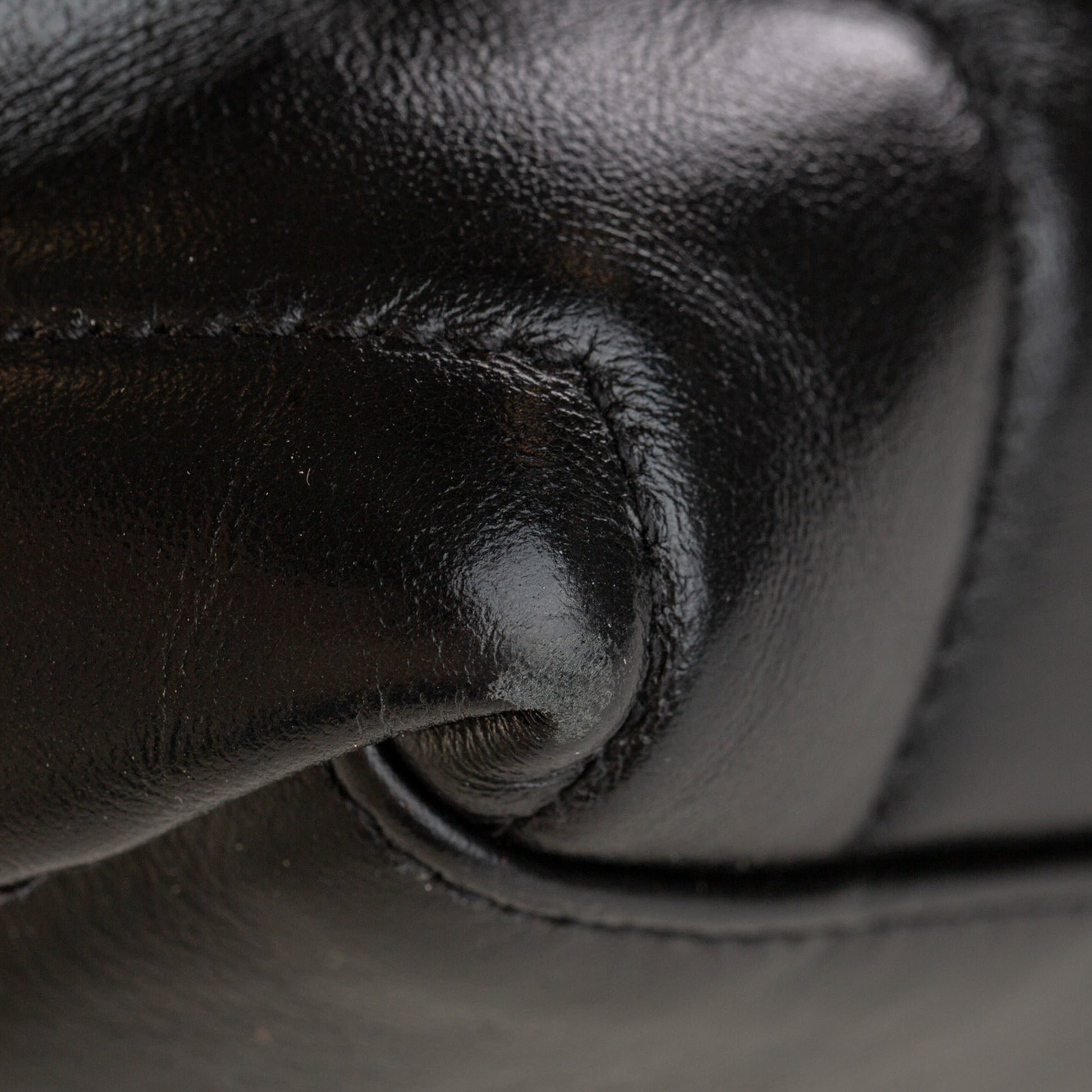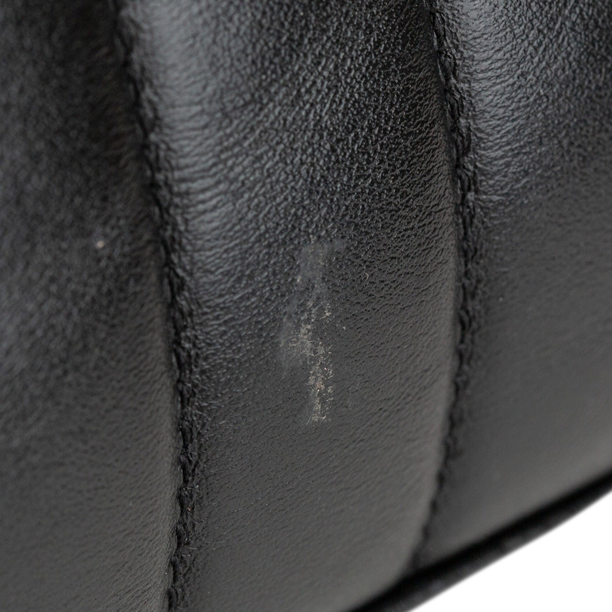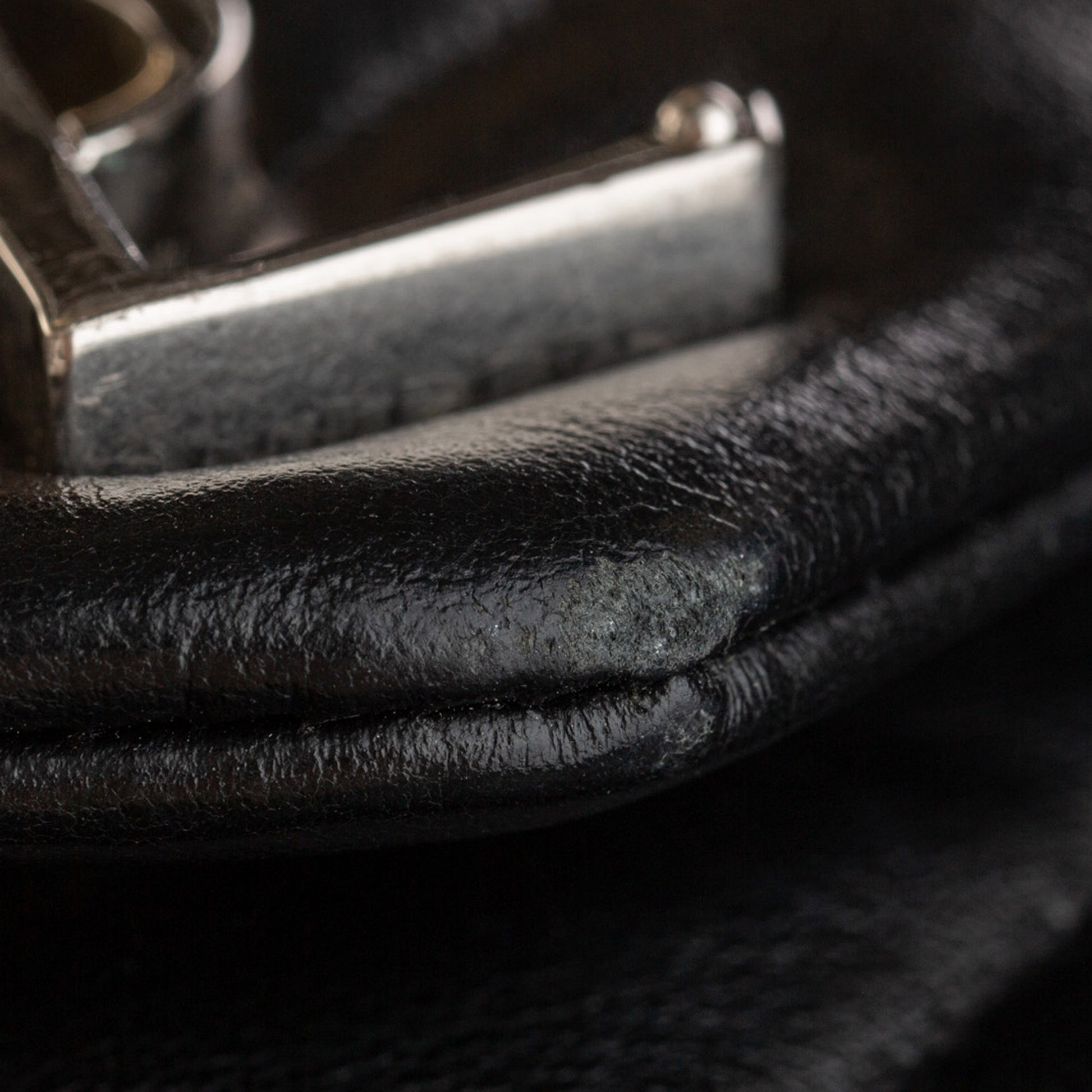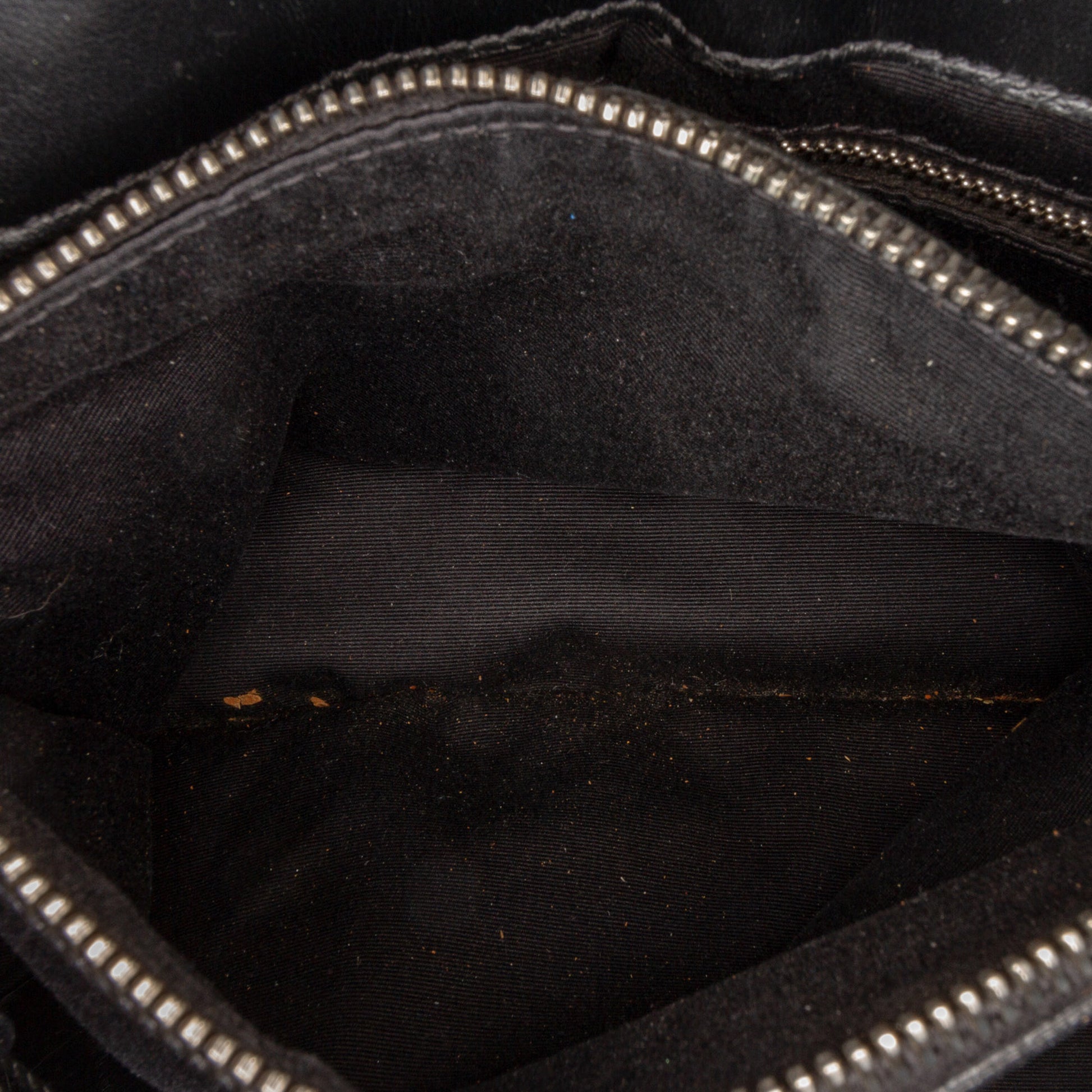 The LouLou features a quilted leather body, curb chain straps, a front flap with a magnetic snap button closure, an interior zip compartment, and an interior zip pocket.