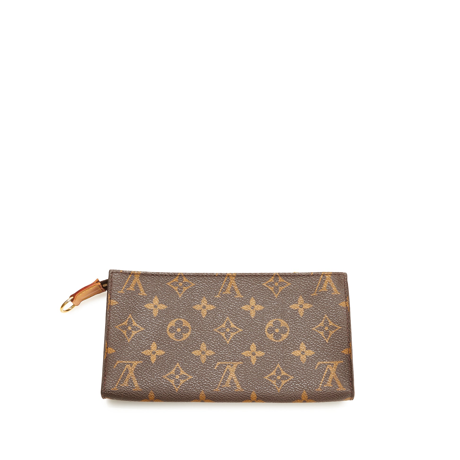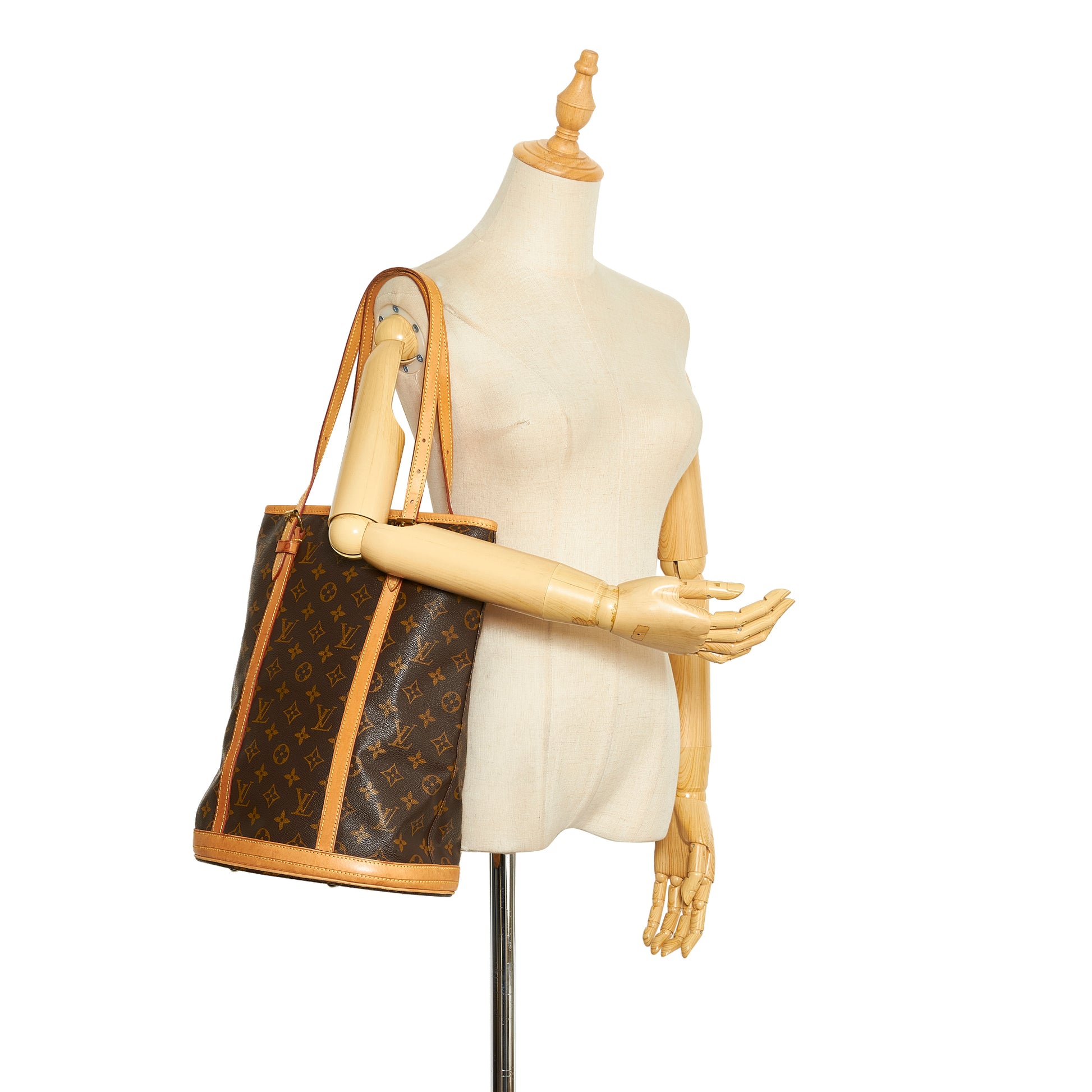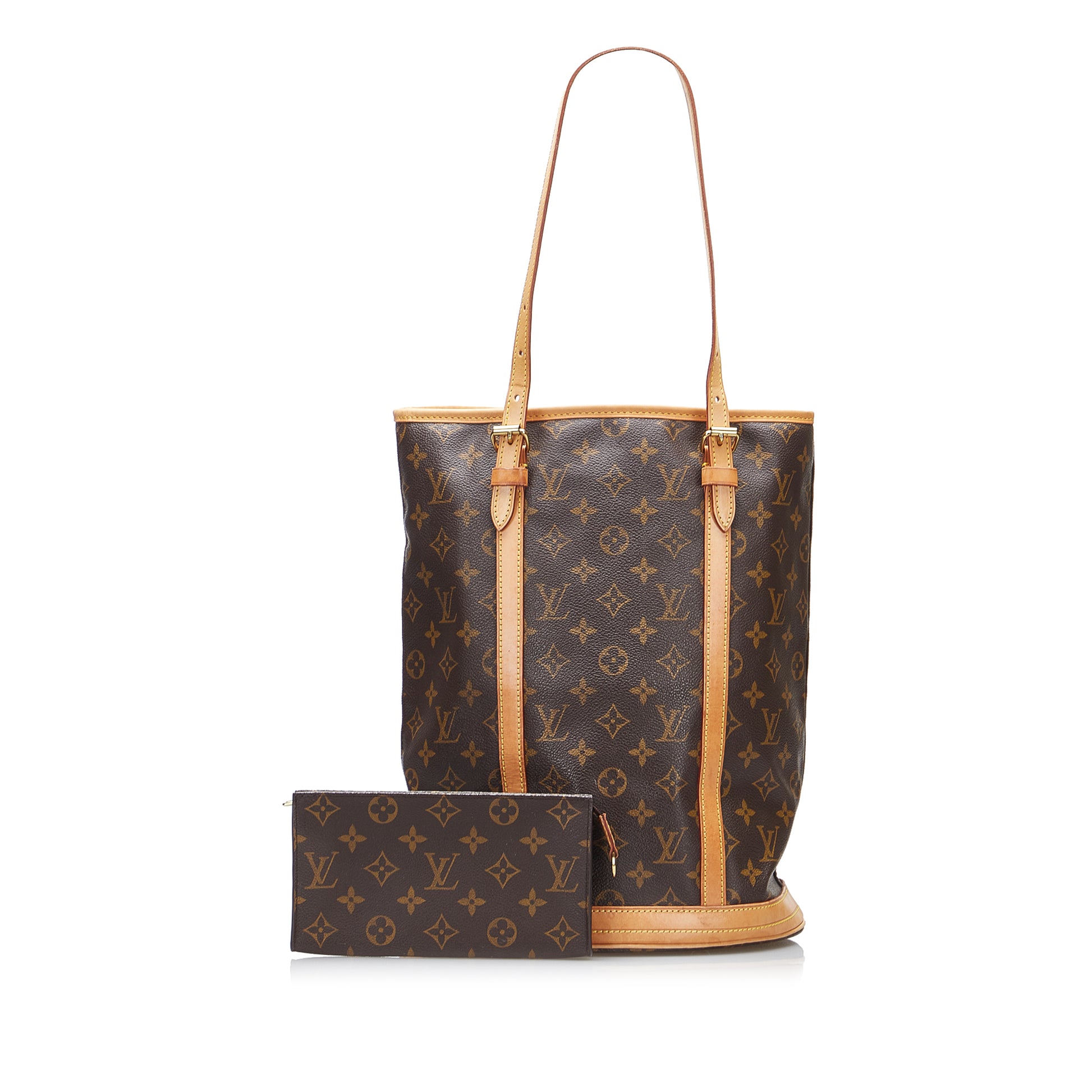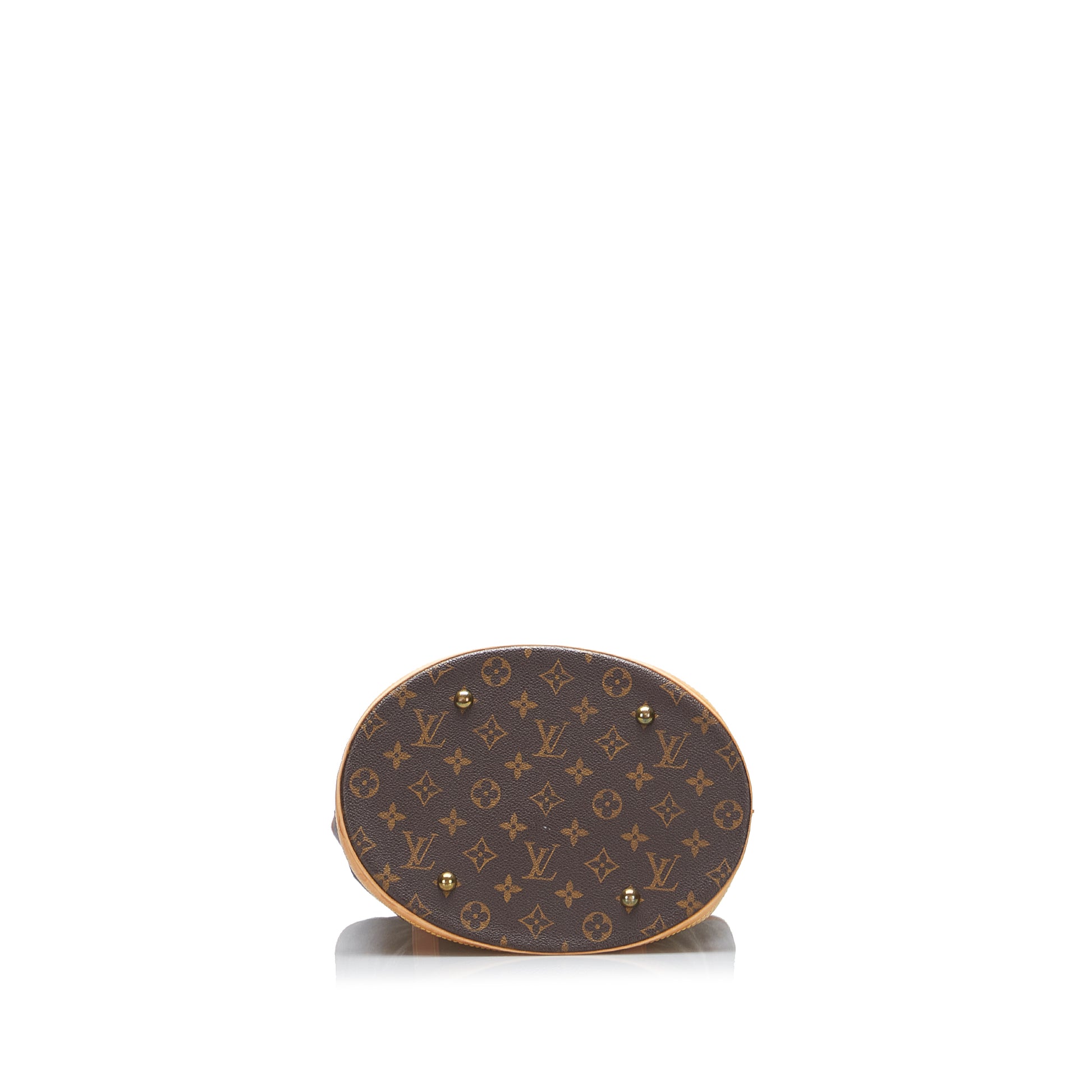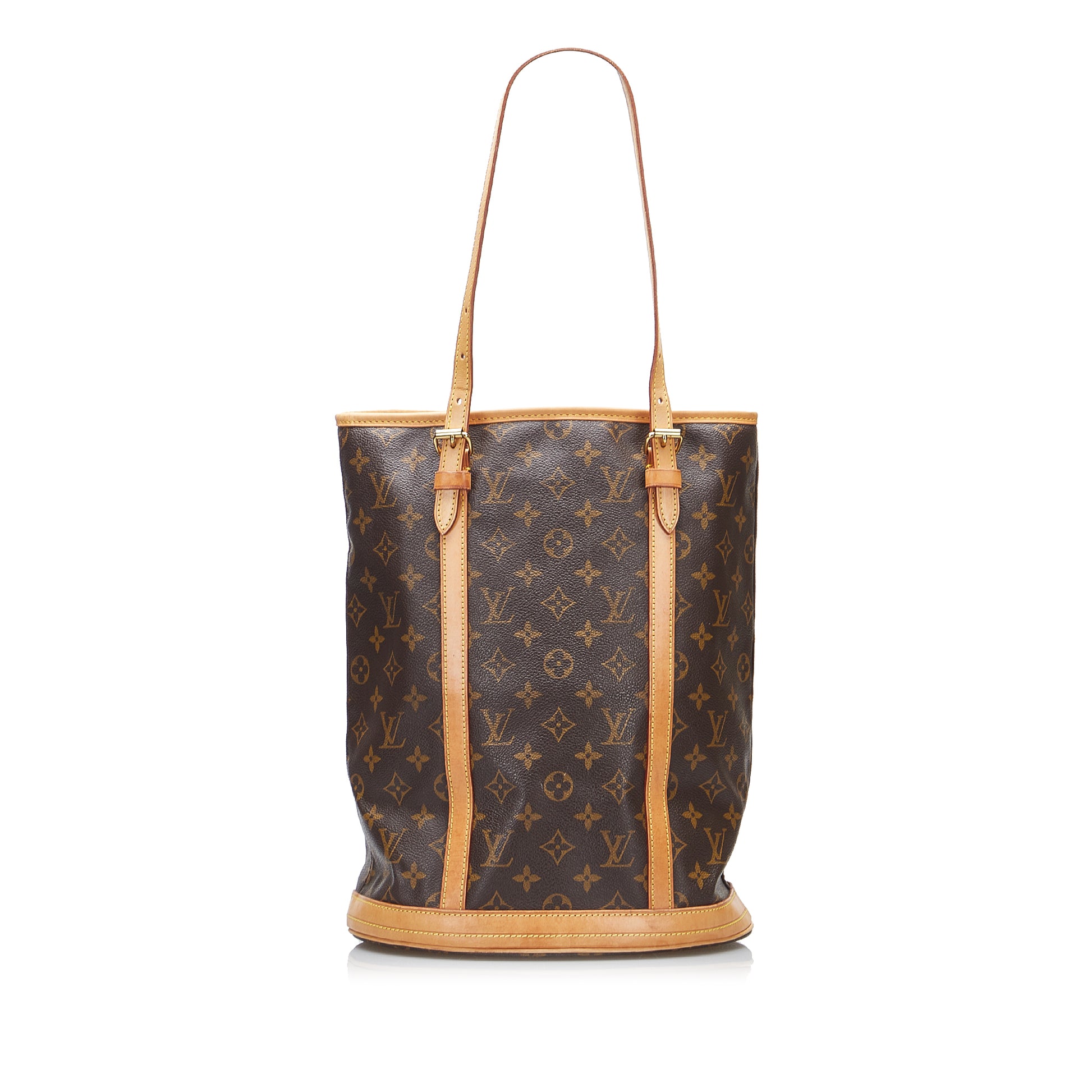 The Bucket GM features a monogram canvas body, flat leather straps, an open top, and an interior zip pocket.