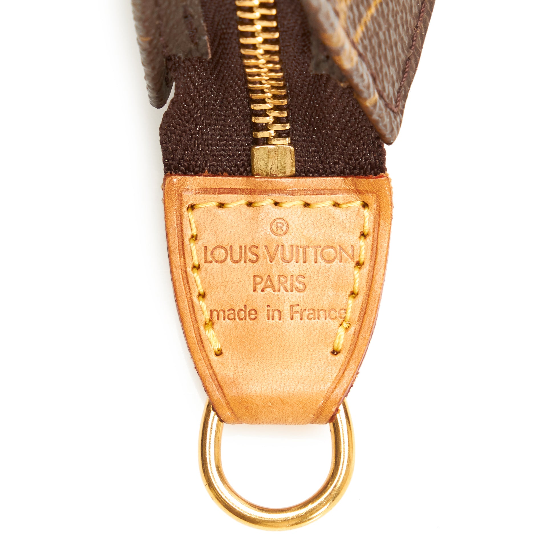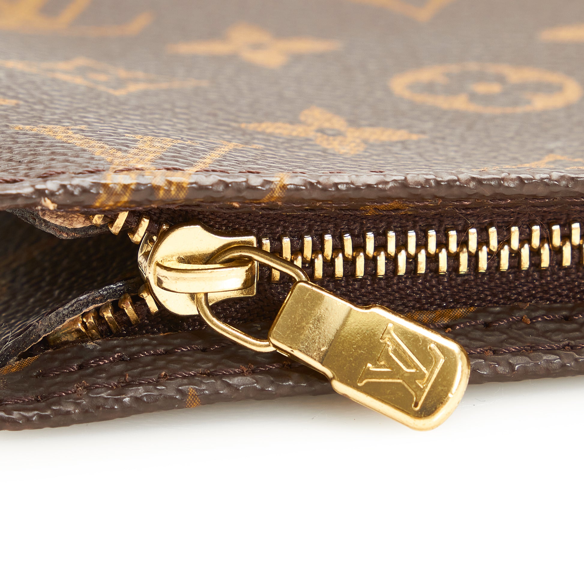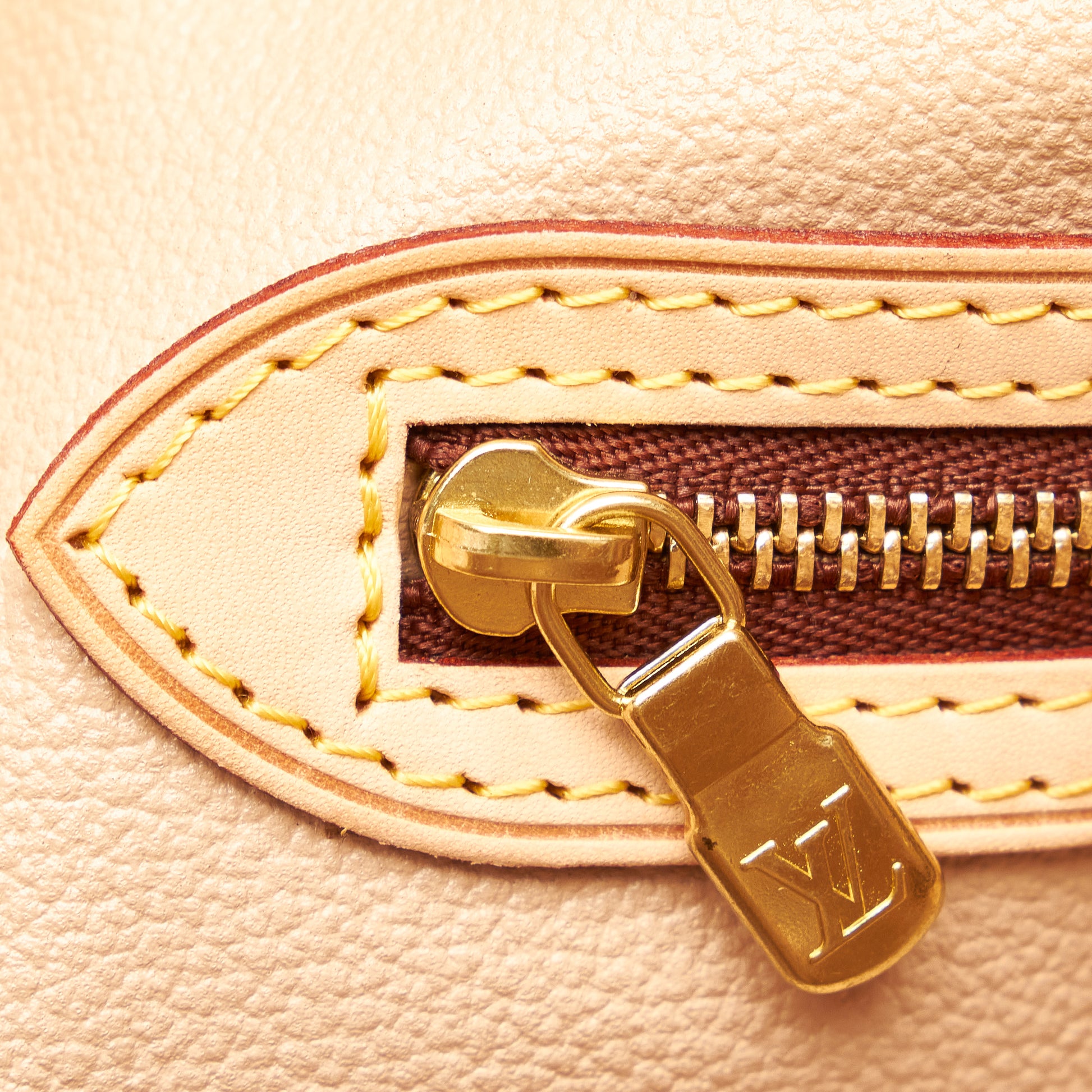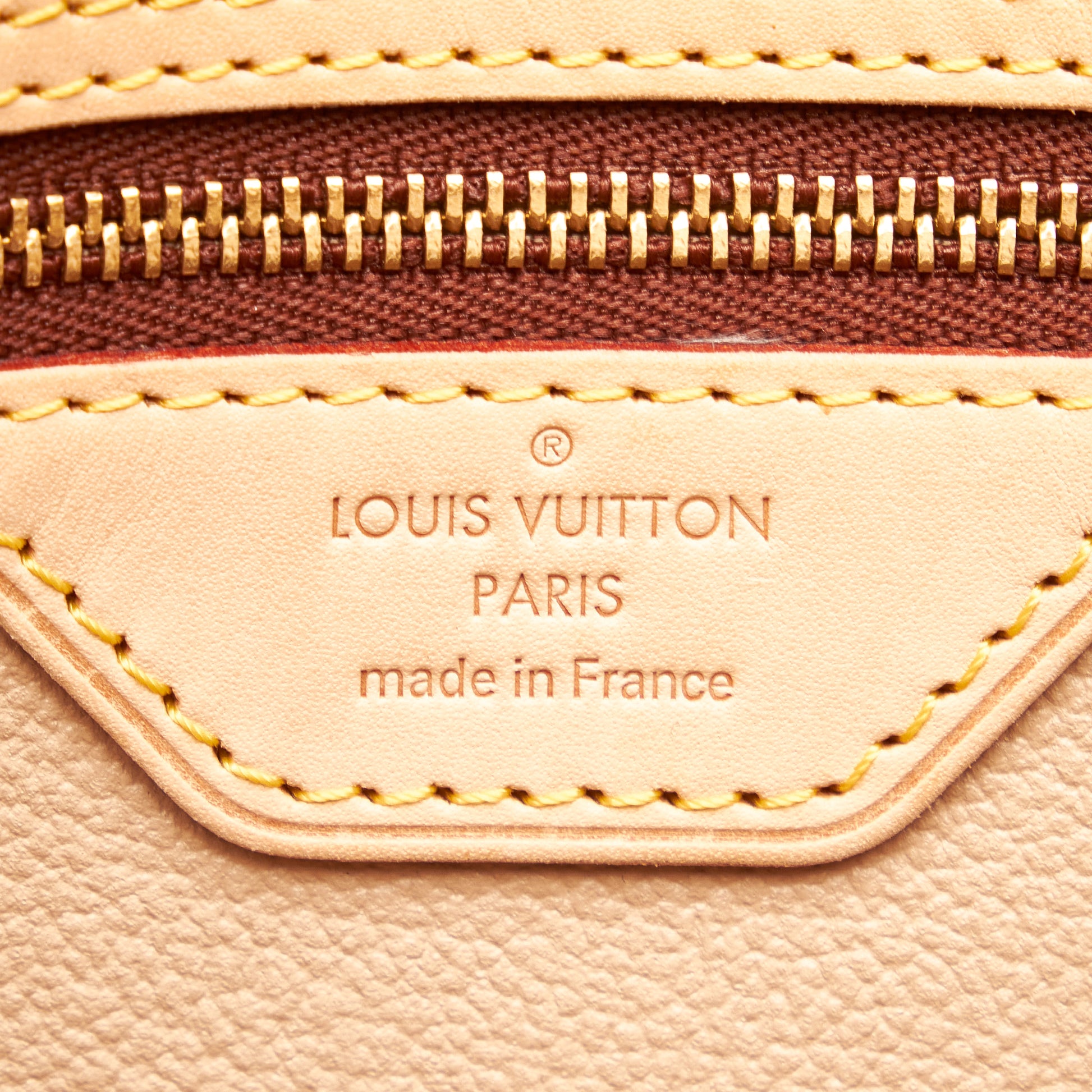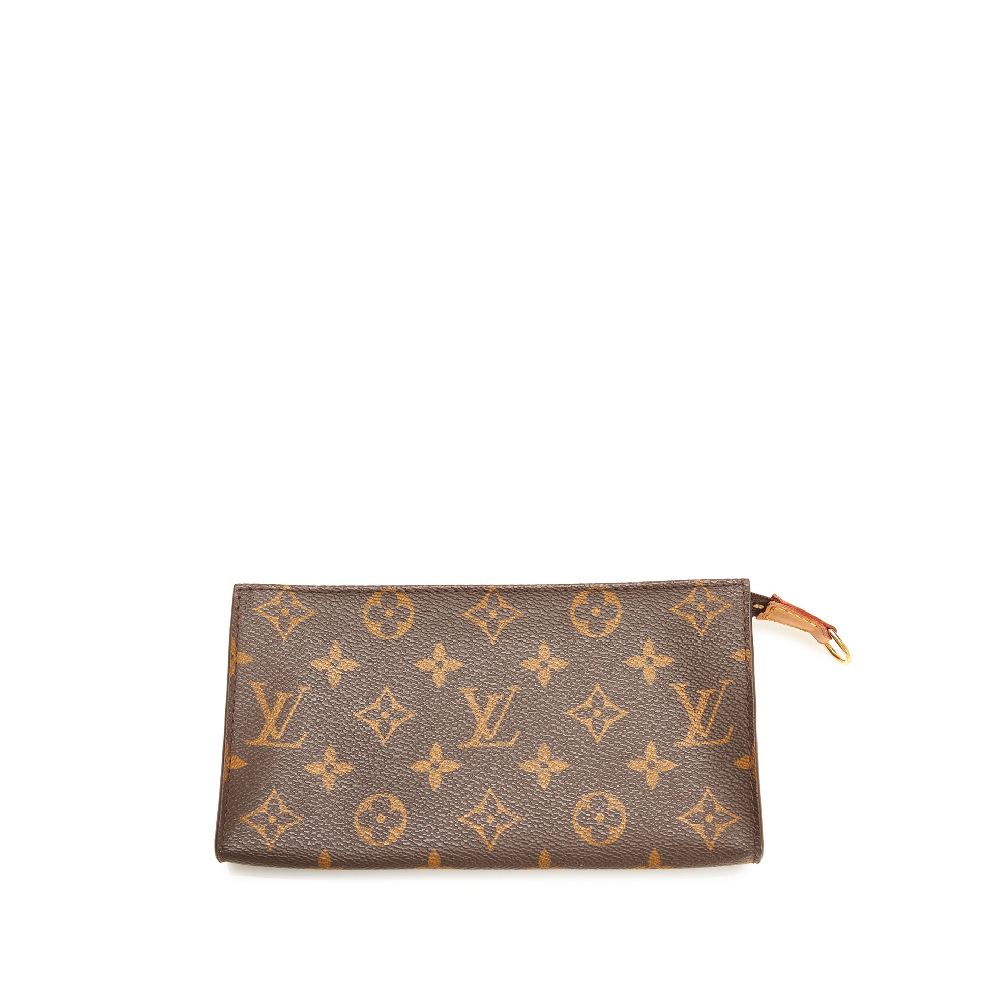 The Bucket GM features a monogram canvas body, flat leather straps, an open top, and an interior zip pocket.