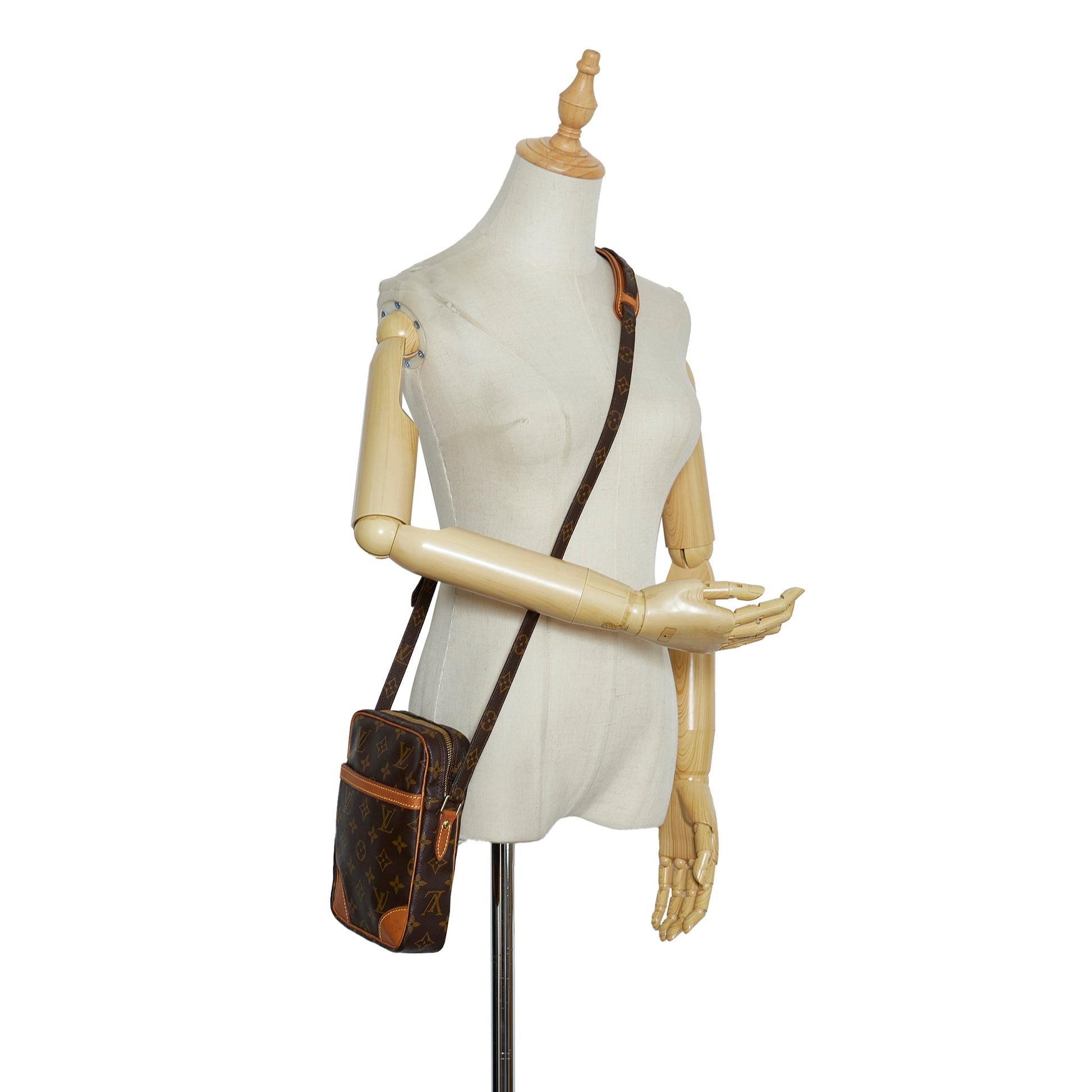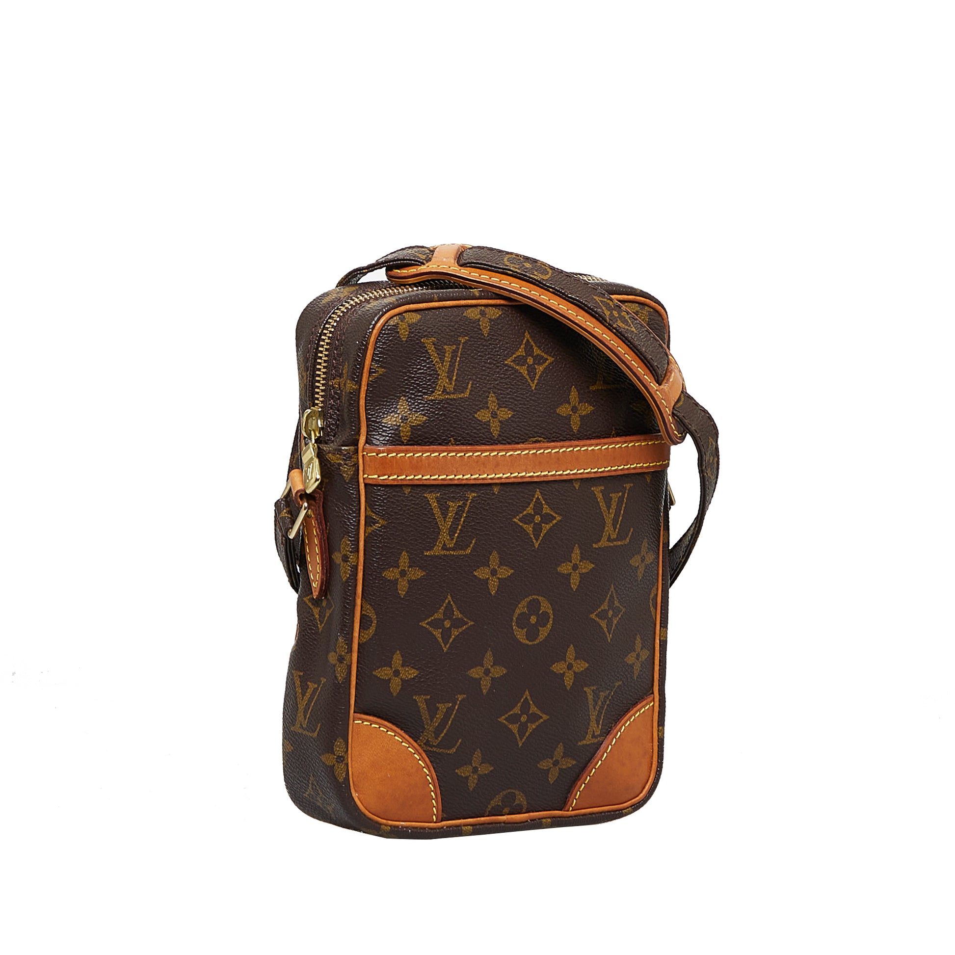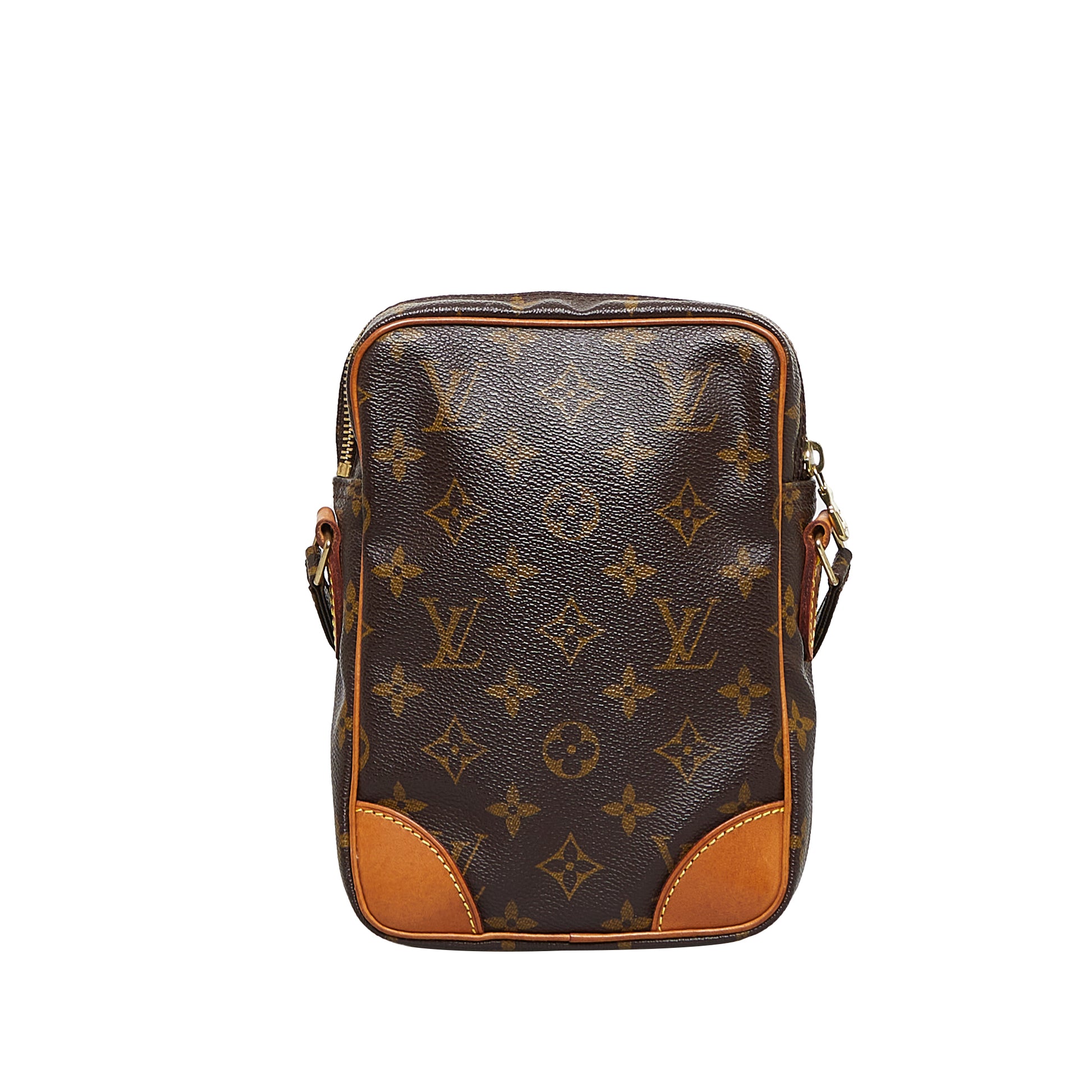 The Danube features a monogram canvas body, an adjustable shoulder strap with leather details, an exterior front slip pocket, and a top zip closure.