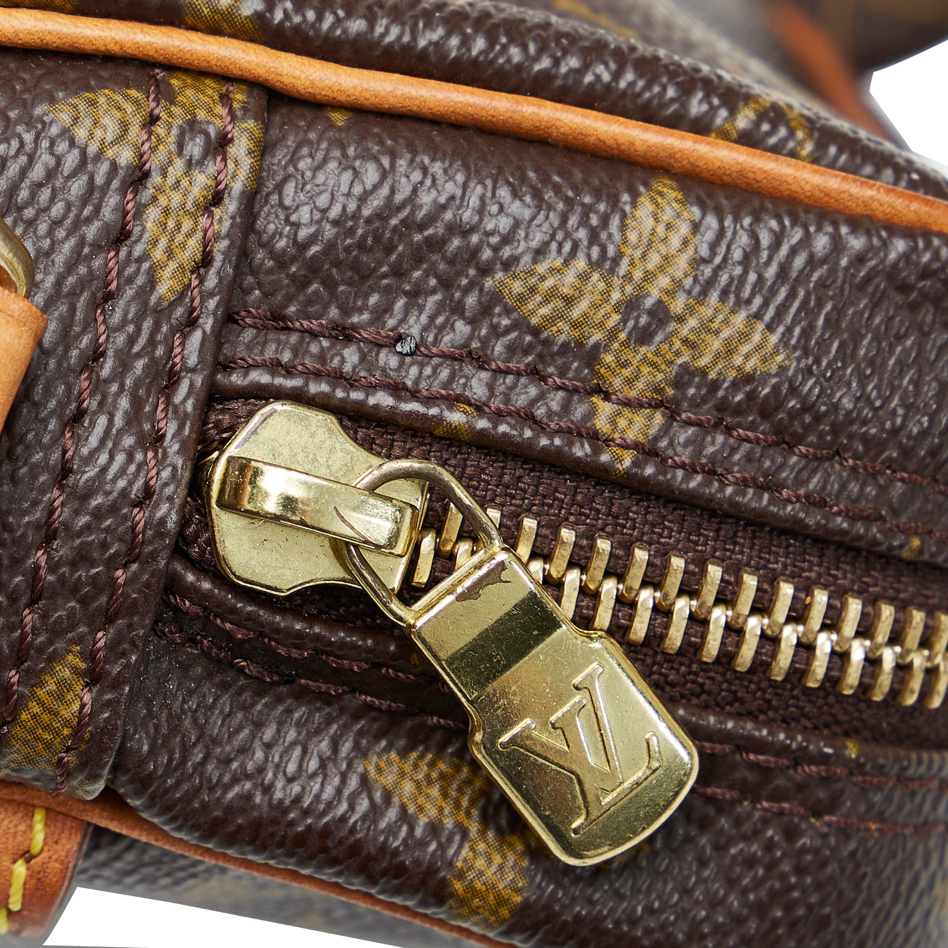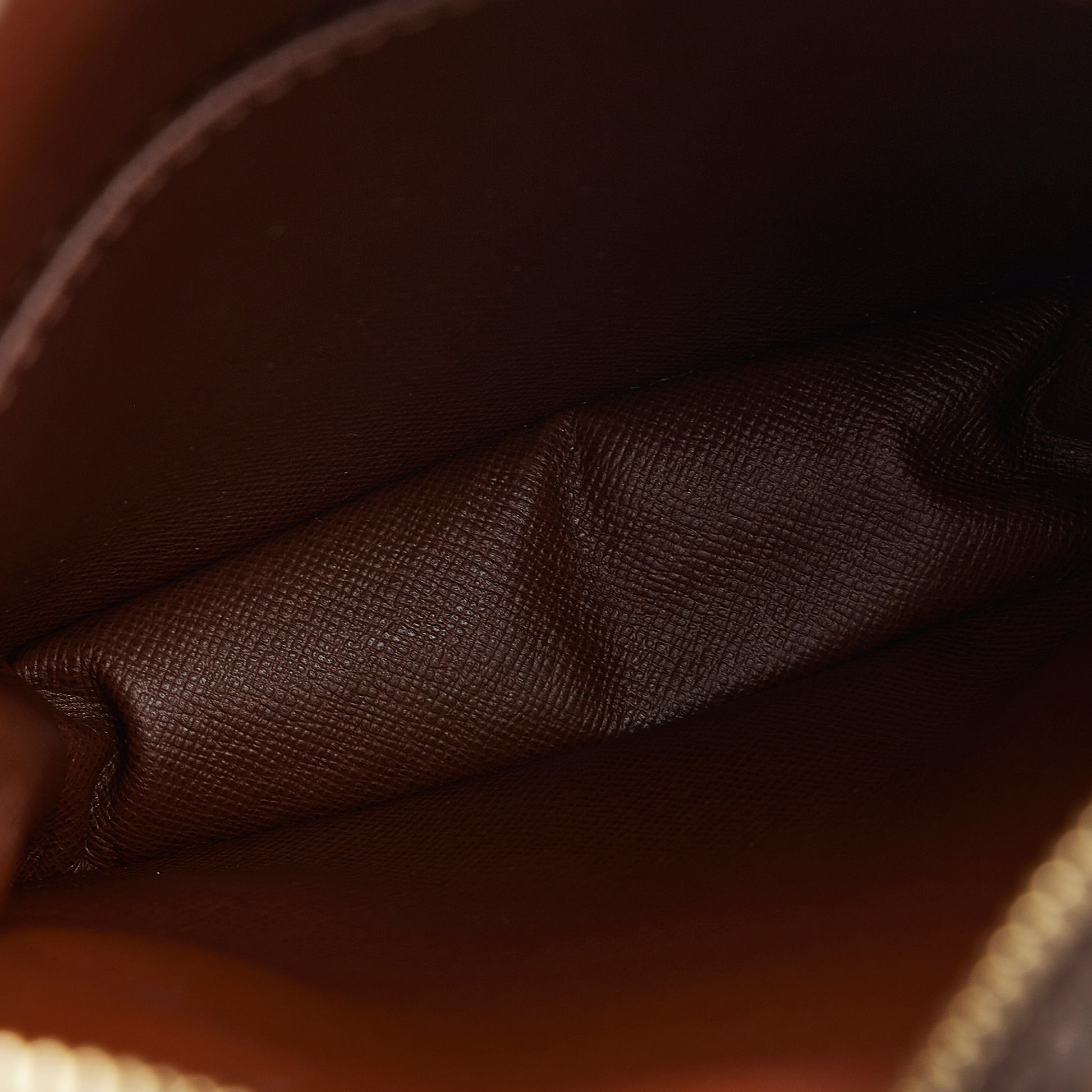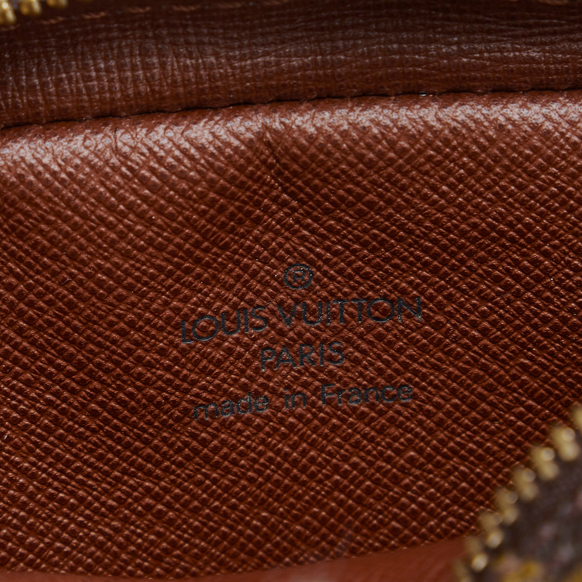 The Danube features a monogram canvas body, an adjustable shoulder strap with leather details, an exterior front slip pocket, and a top zip closure.