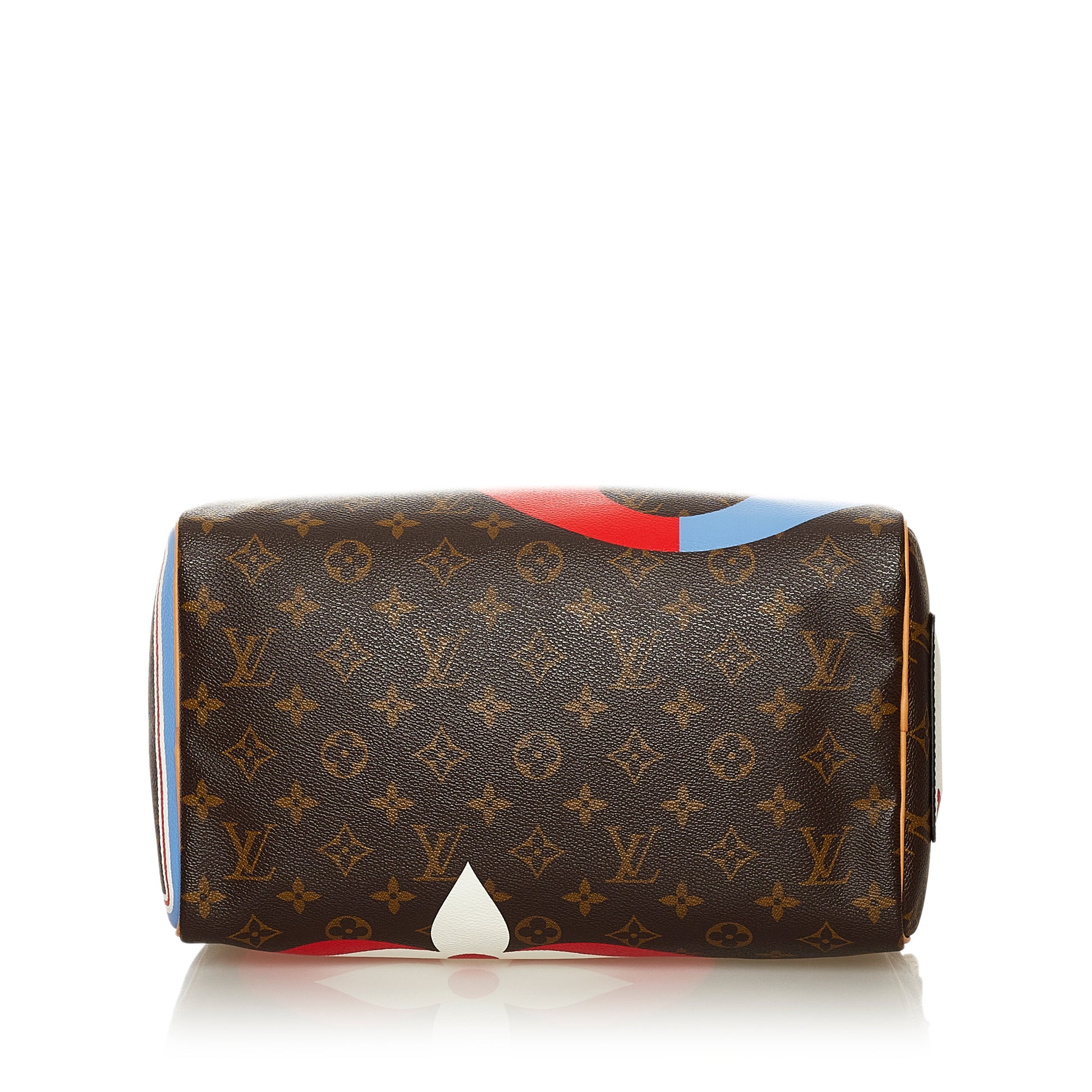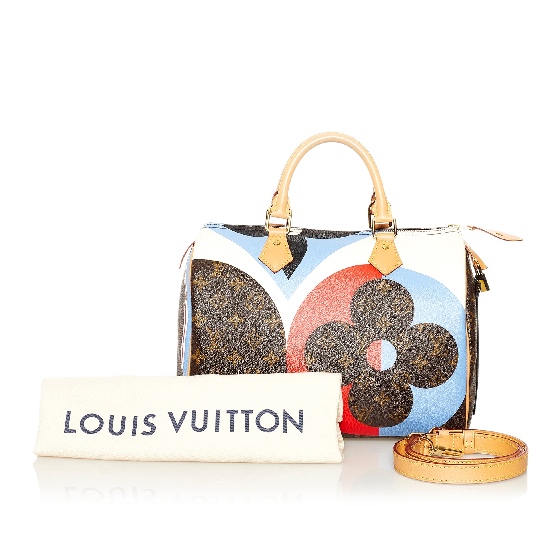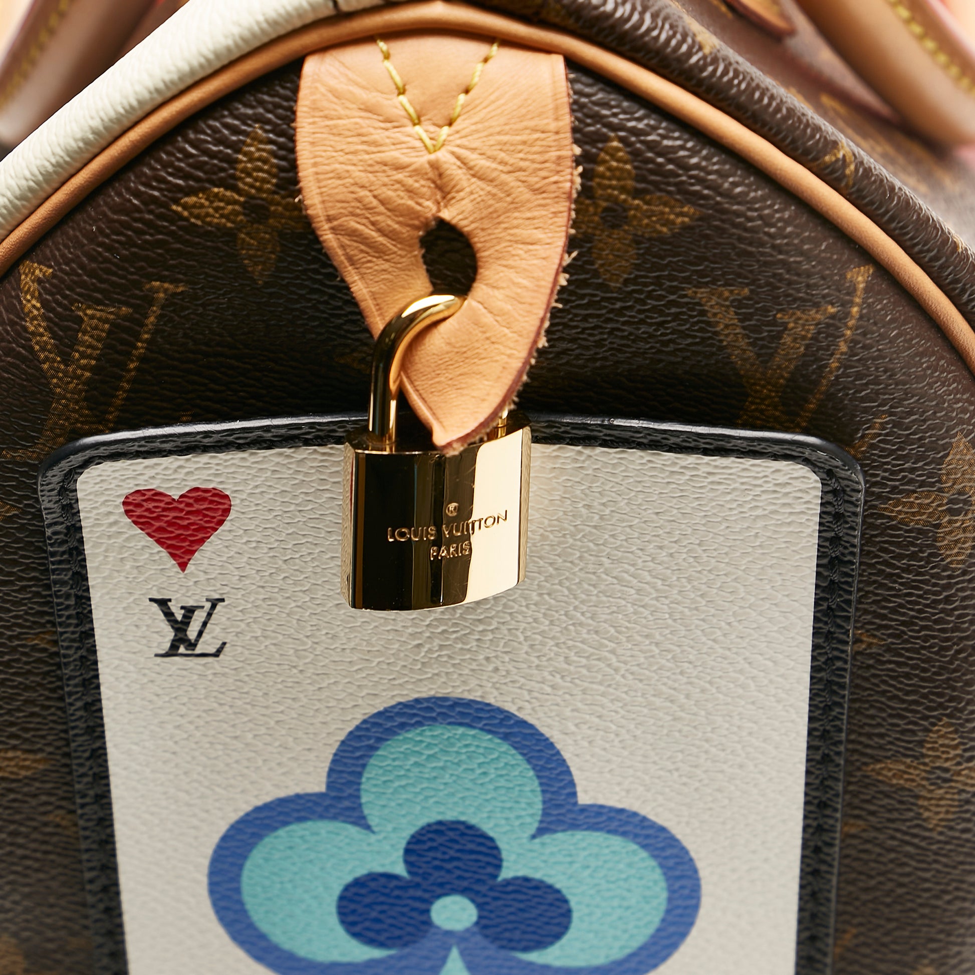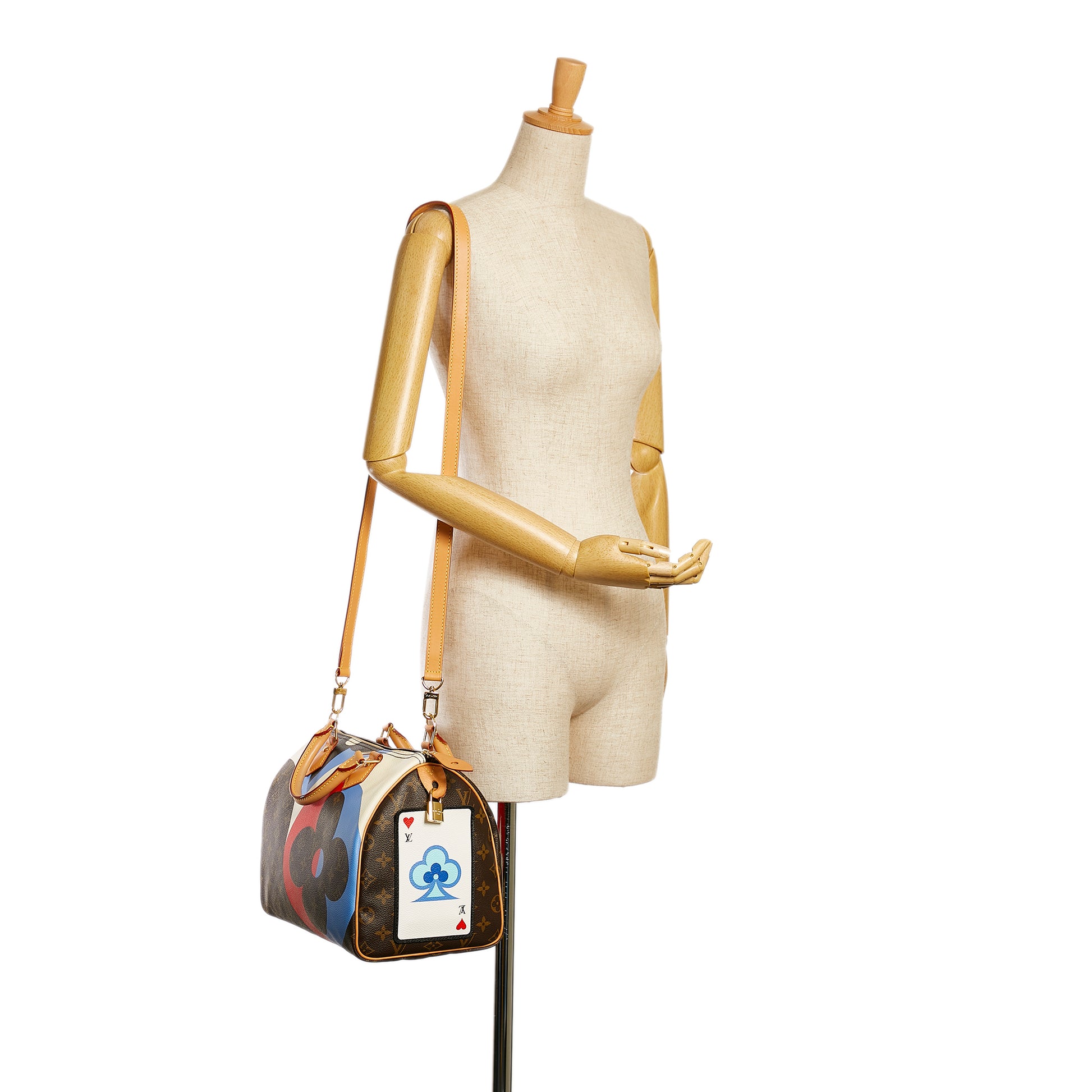 The Game On Speedy 30 Bandouliere features a monogram canvas body, rolled leather handles, a detachable flat leather strap, and a top zip closure.