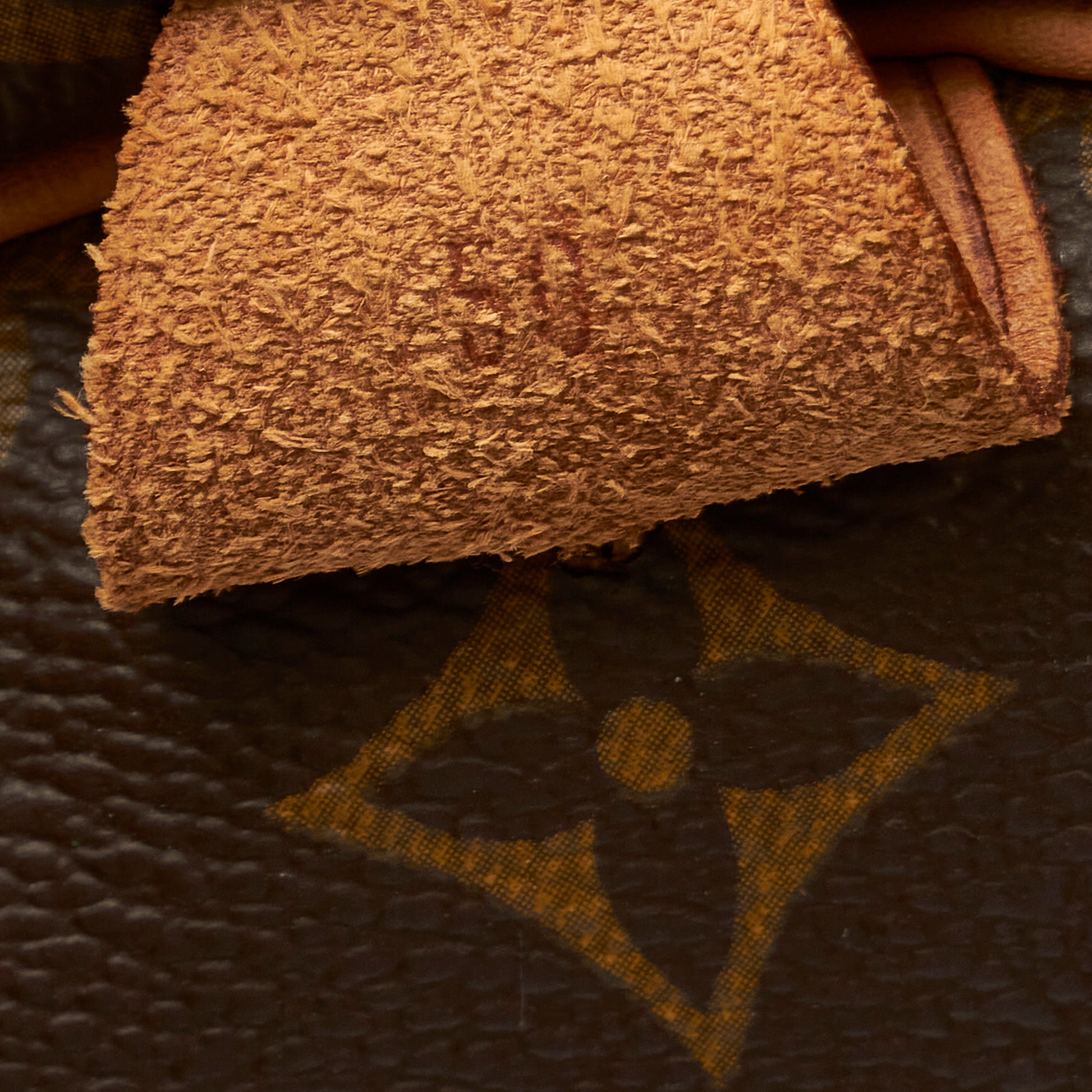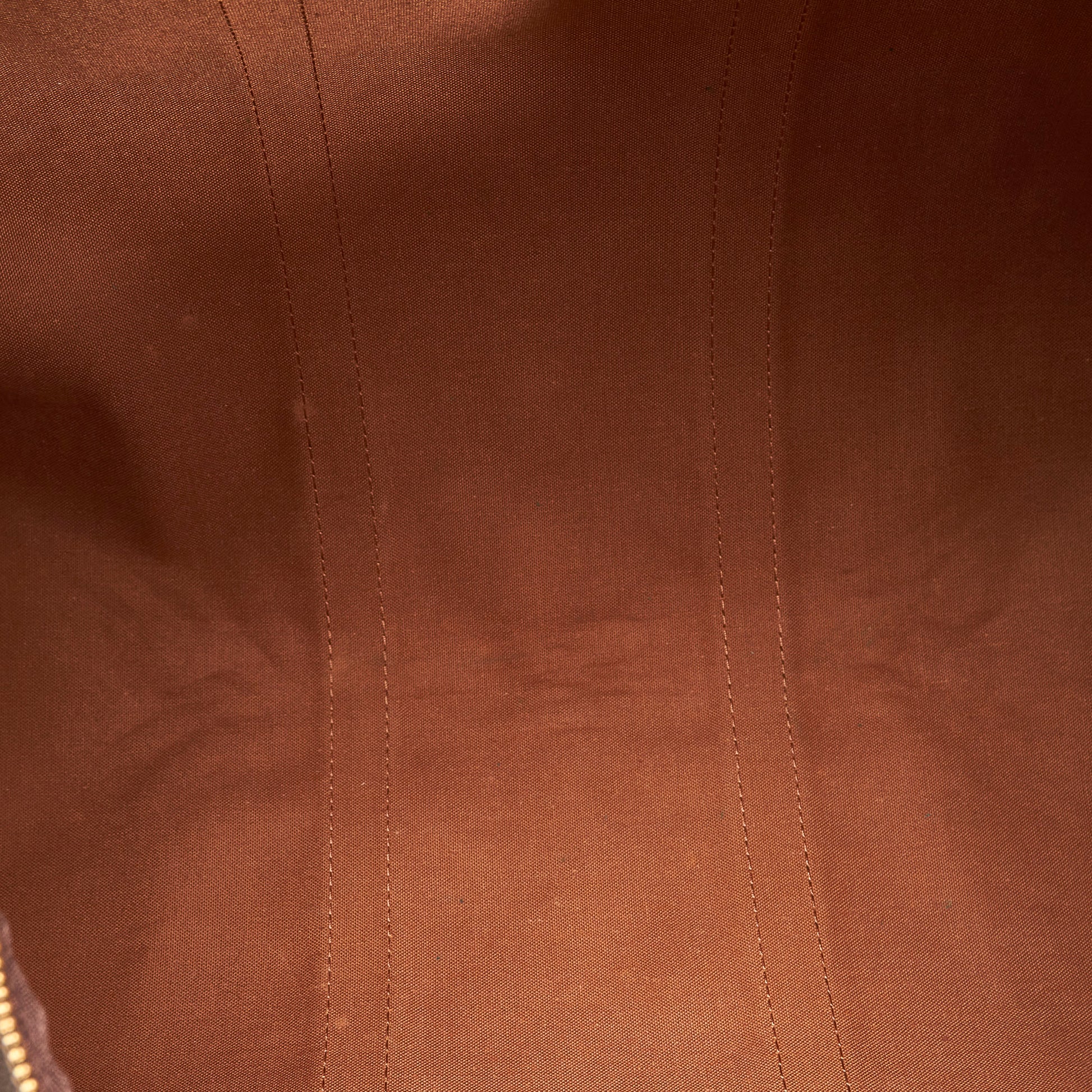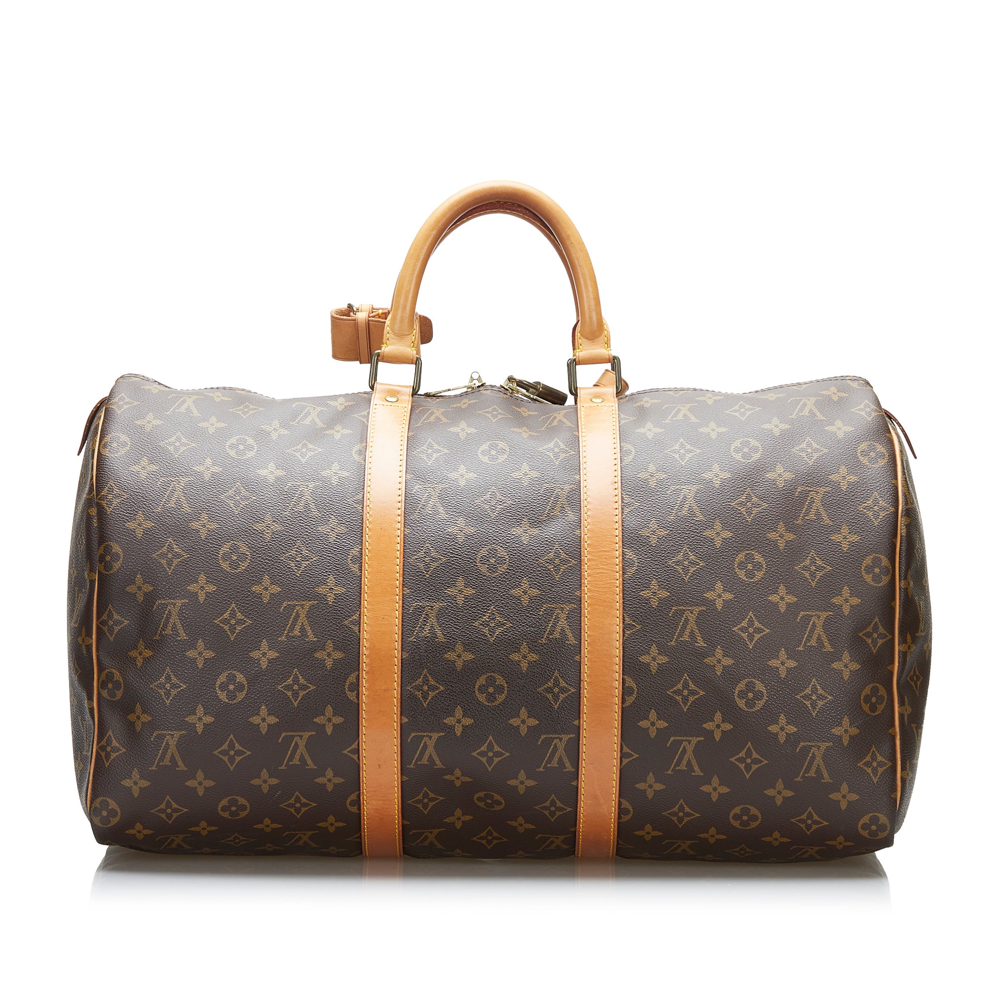 The Keepall 50 features a monogram canvas body, rolled leather handles, and a top zip closure.