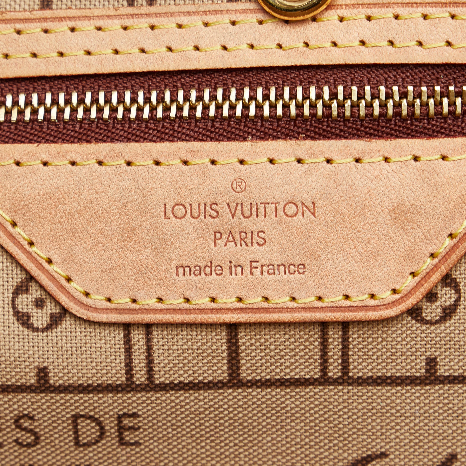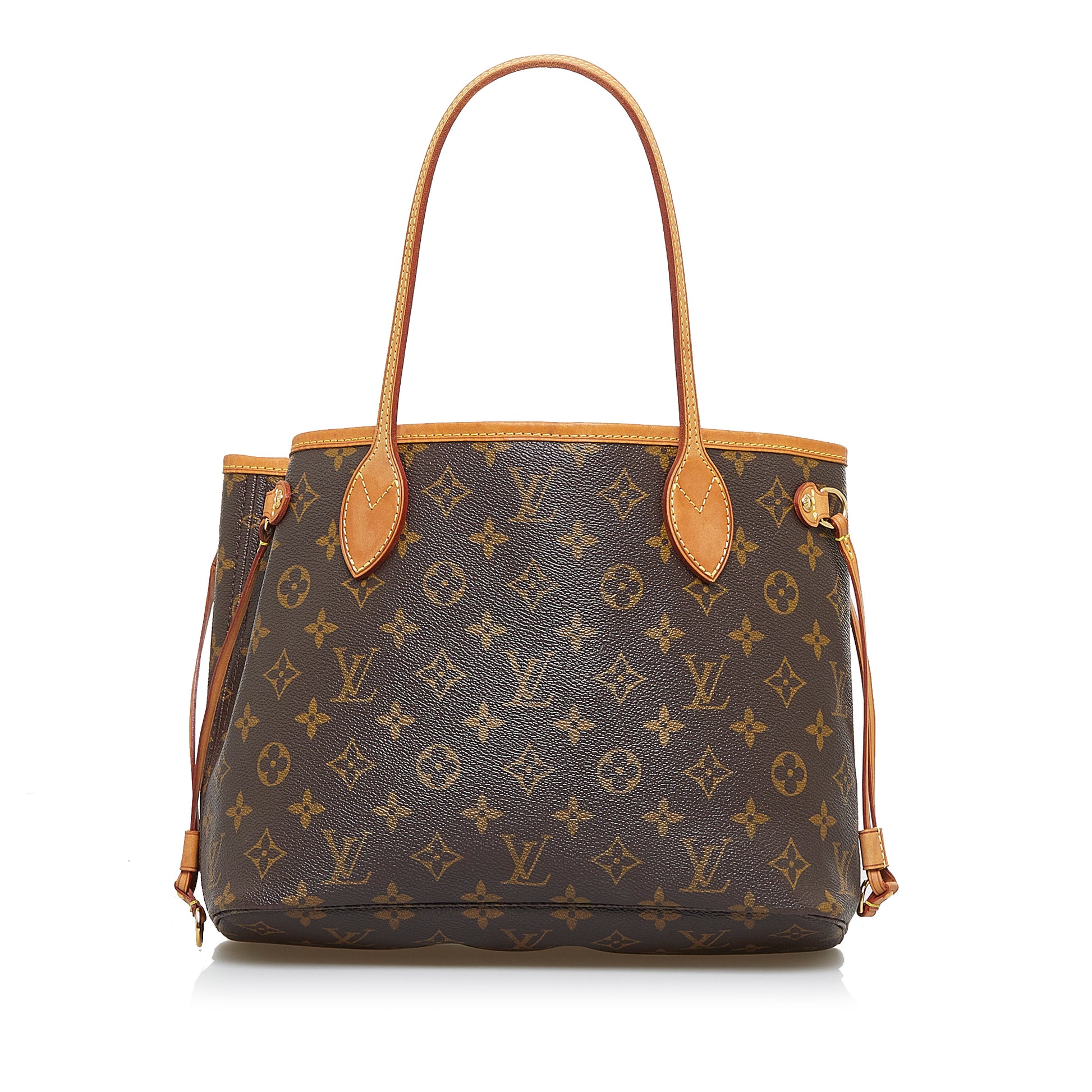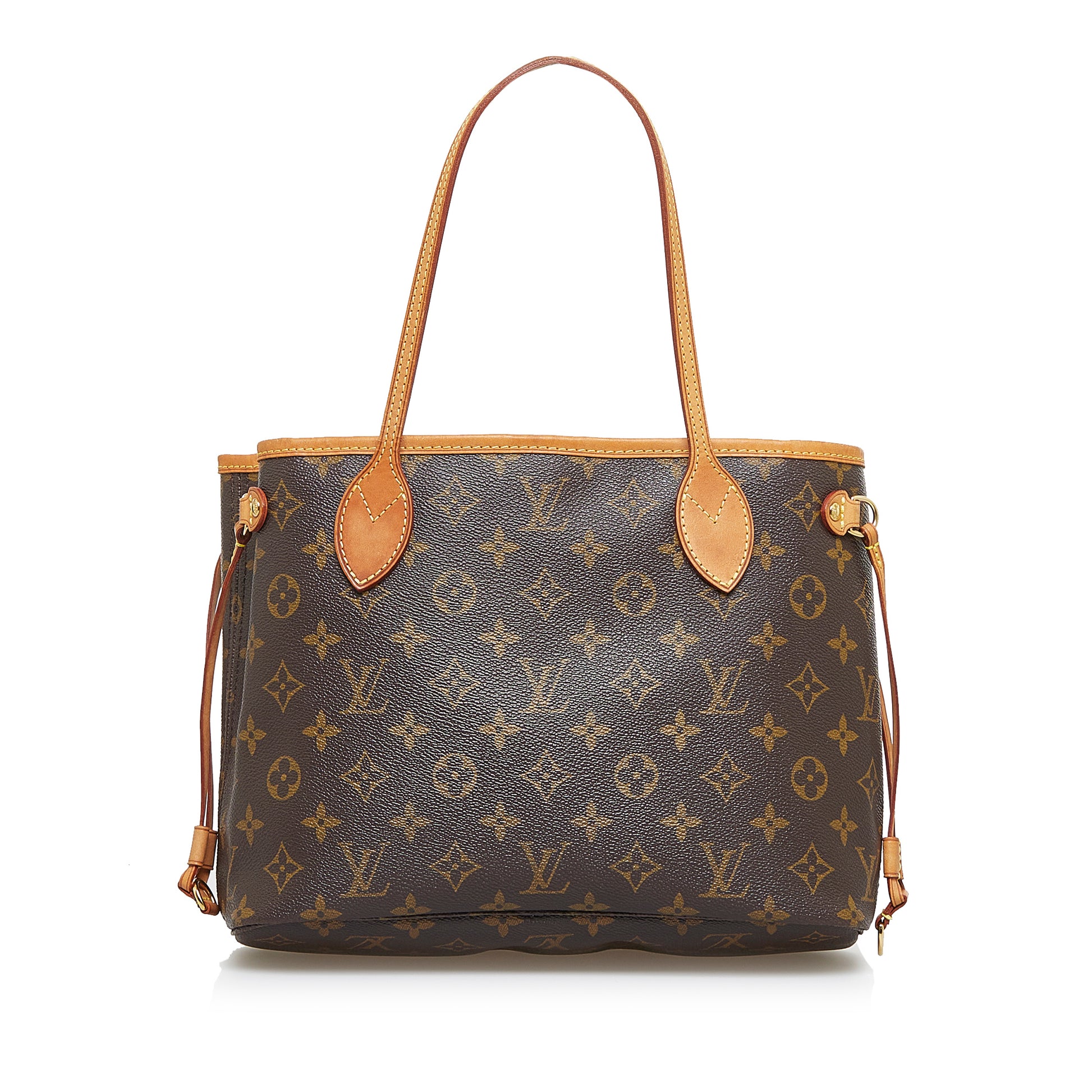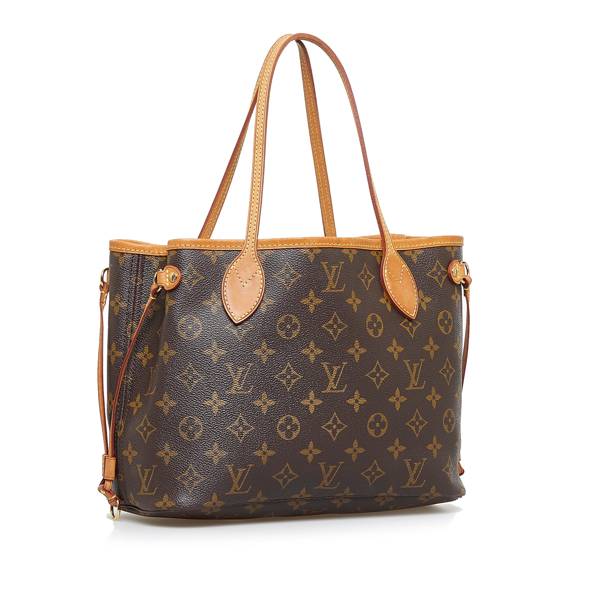 The Neverfull PM features a monogram canvas body, flat leather handles, an open top with lobster claw clasp closure, and an interior zip pocket.