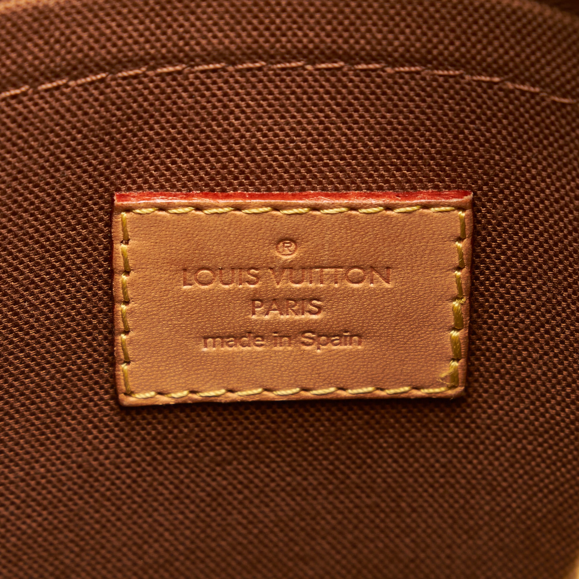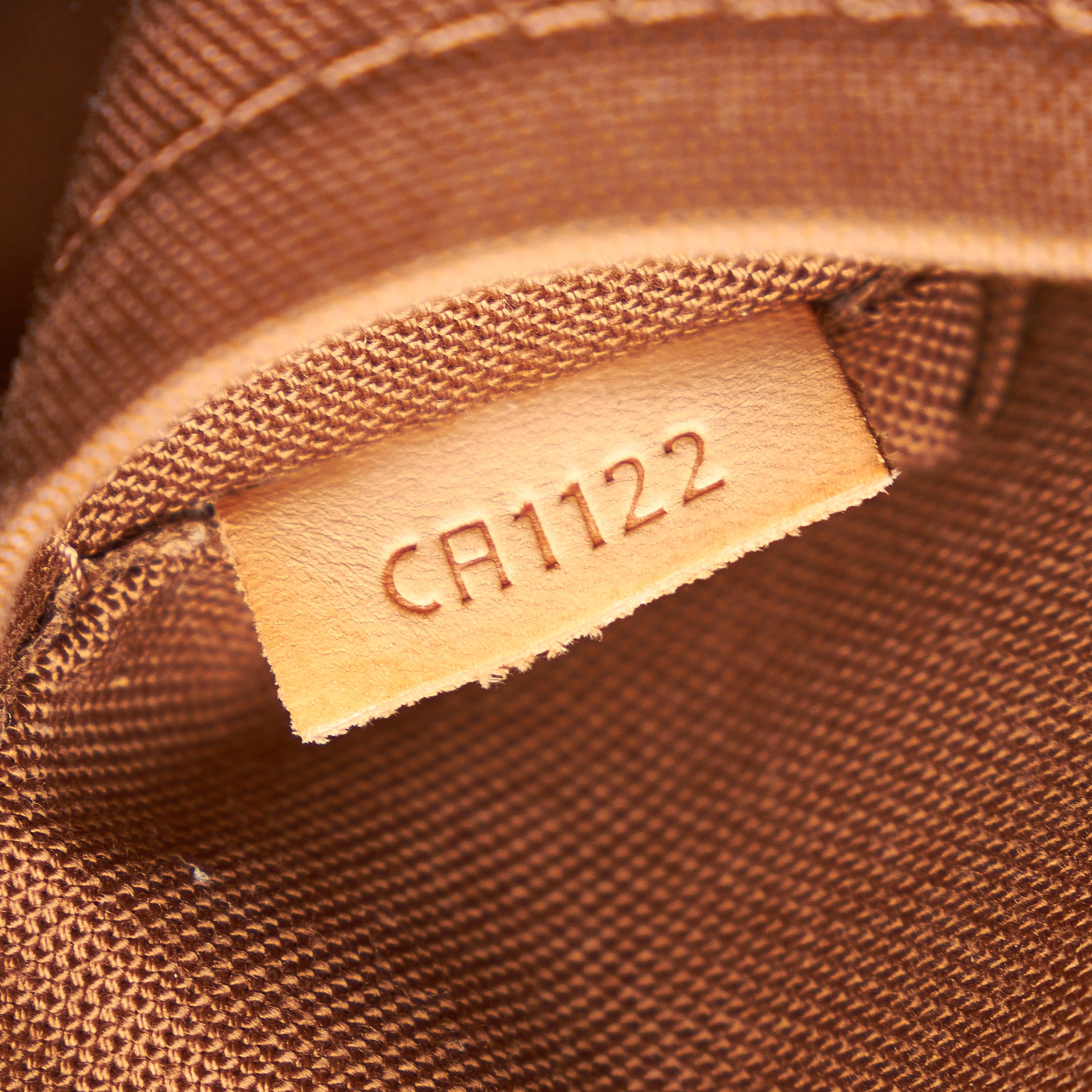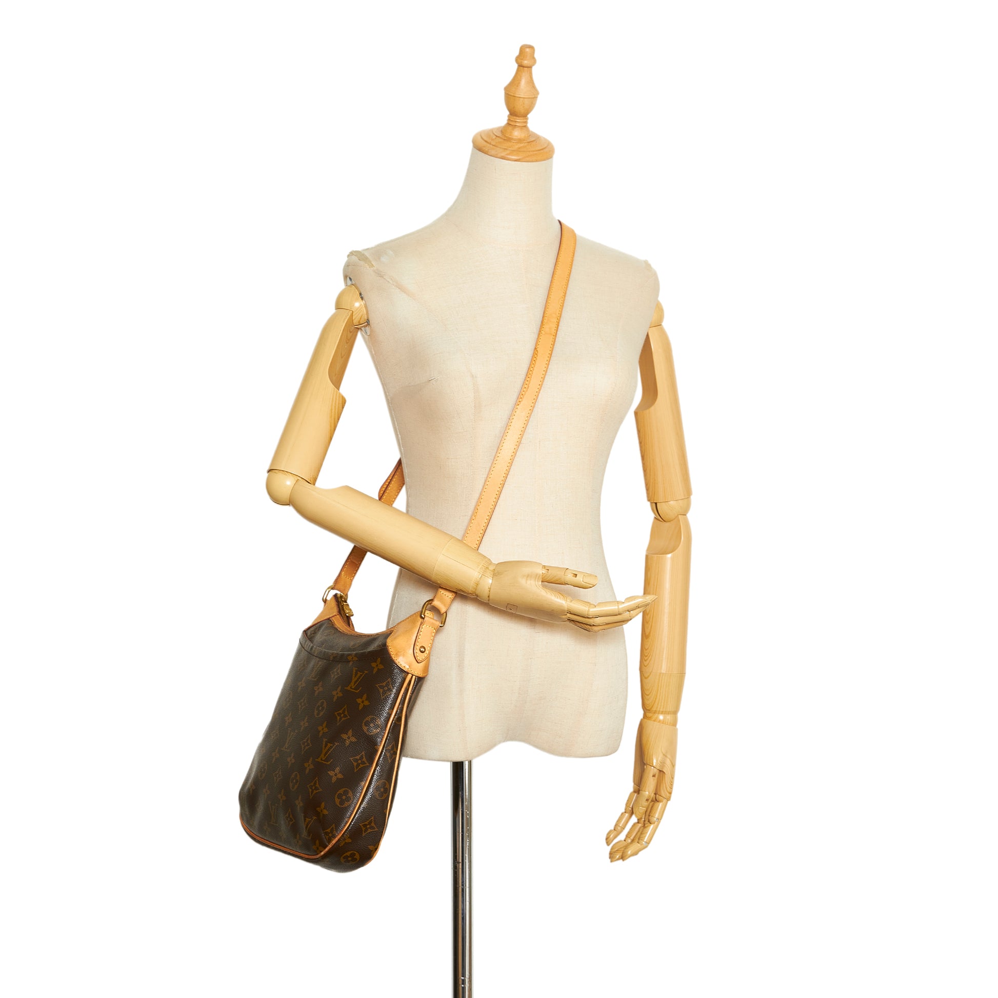 The Odeon MM features a monogram canvas body with vachetta leather trim, a front exterior slip pocket, an adjustable flat leather strap, a top zip closure, and interior slip pockets.