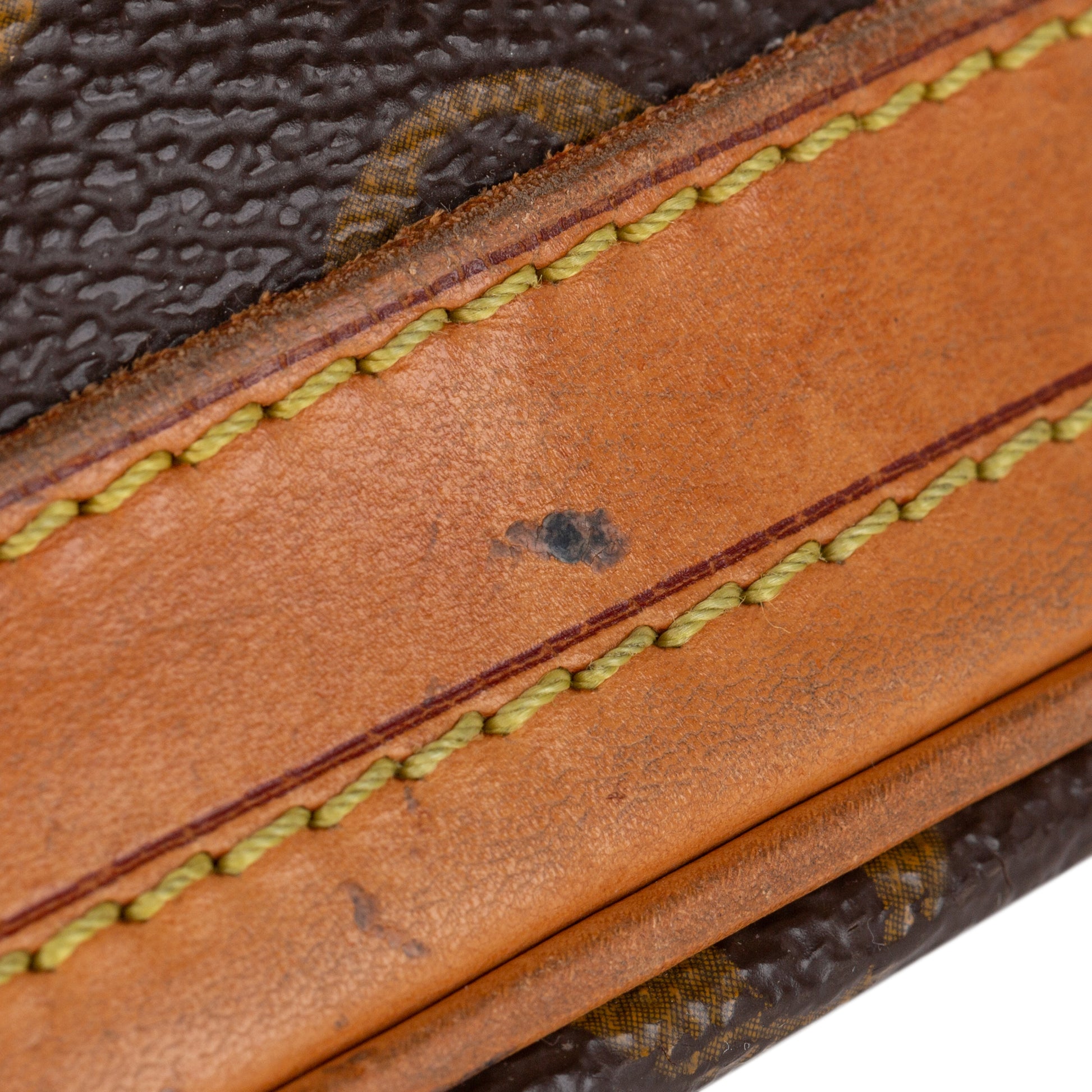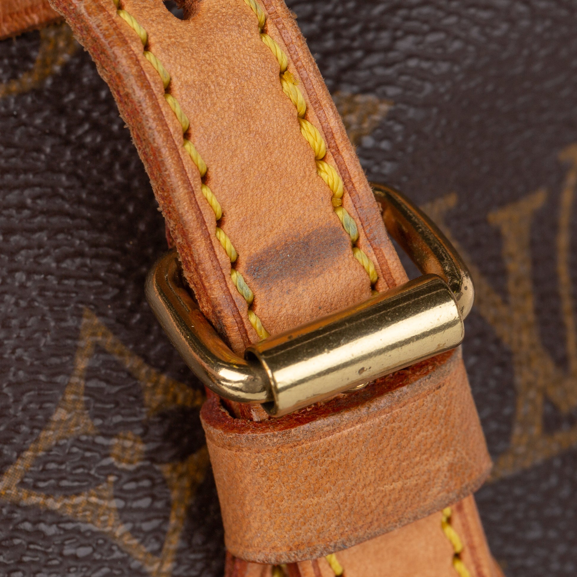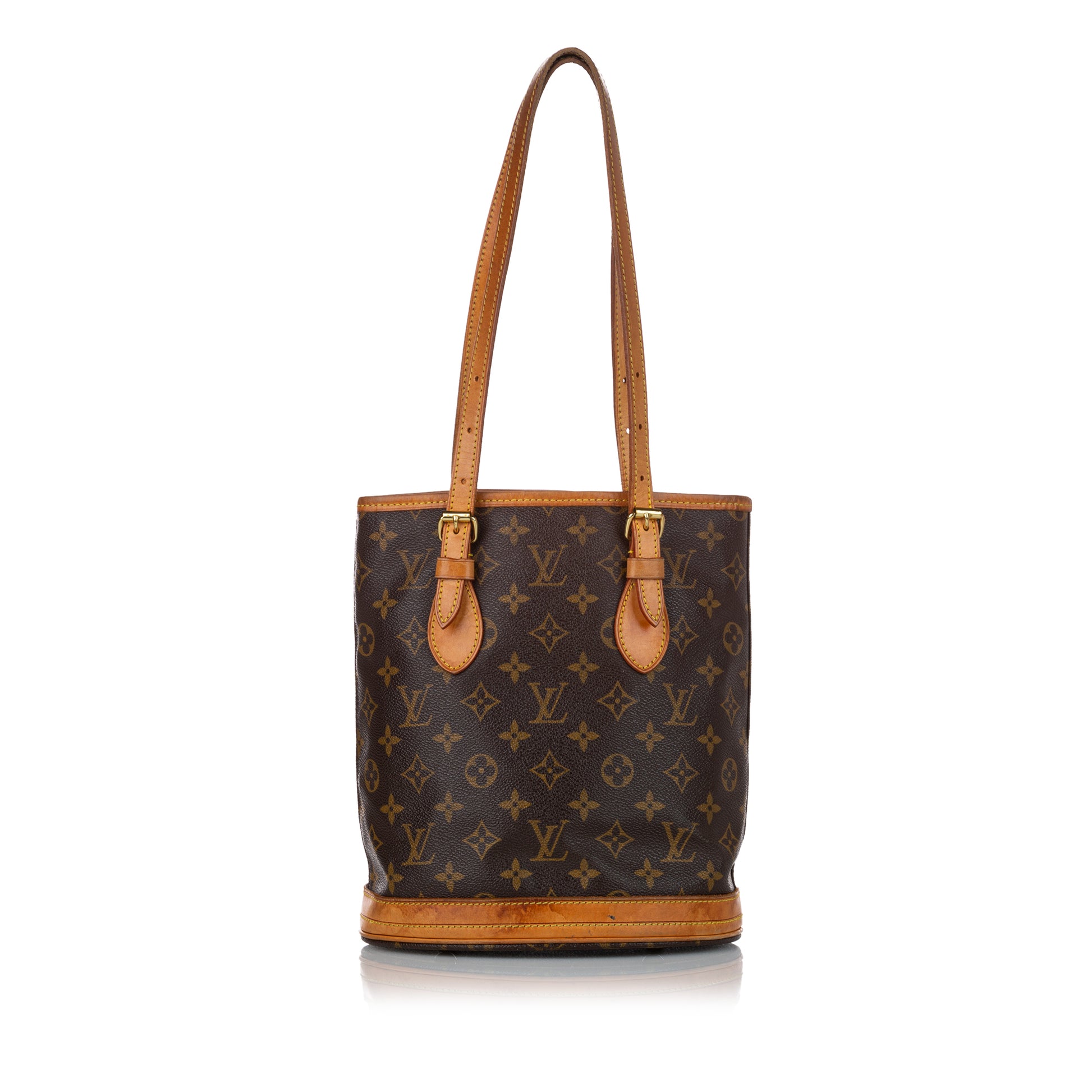 The Petit Bucket bag features a monogram canvas body with leather trim, adjustable flat leather straps, an open top, and interior zip and slip pockets.