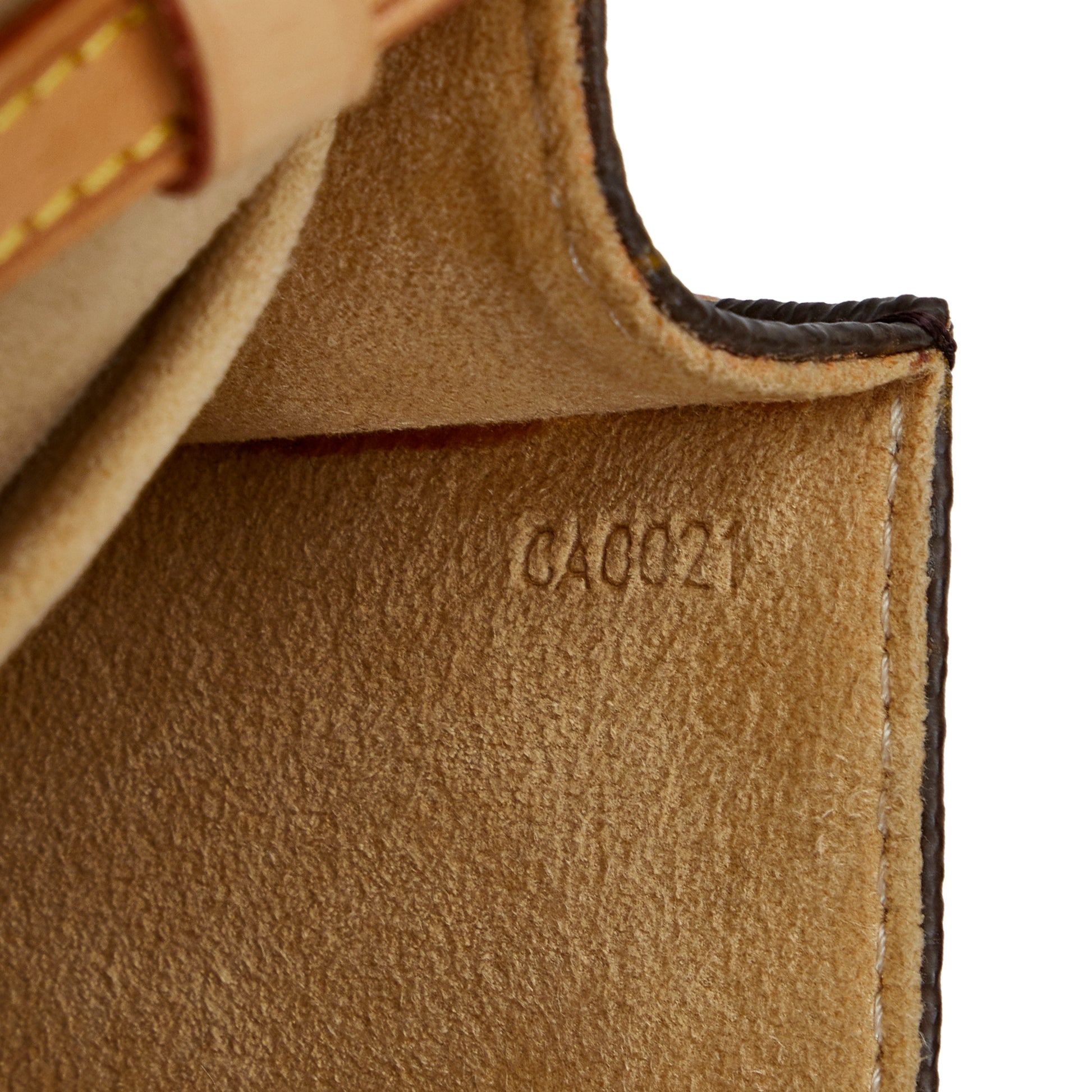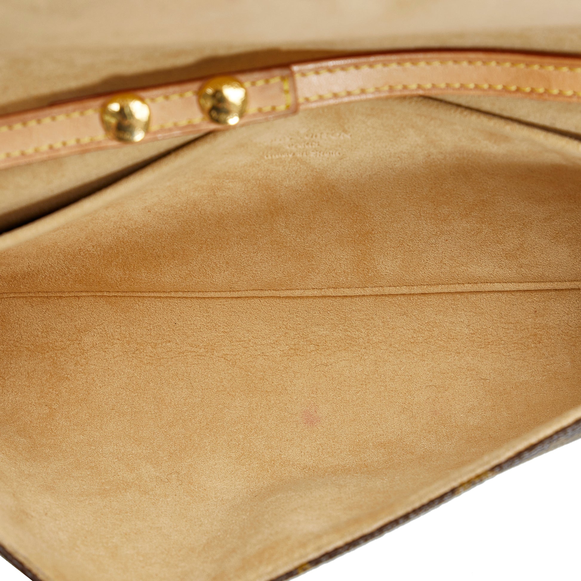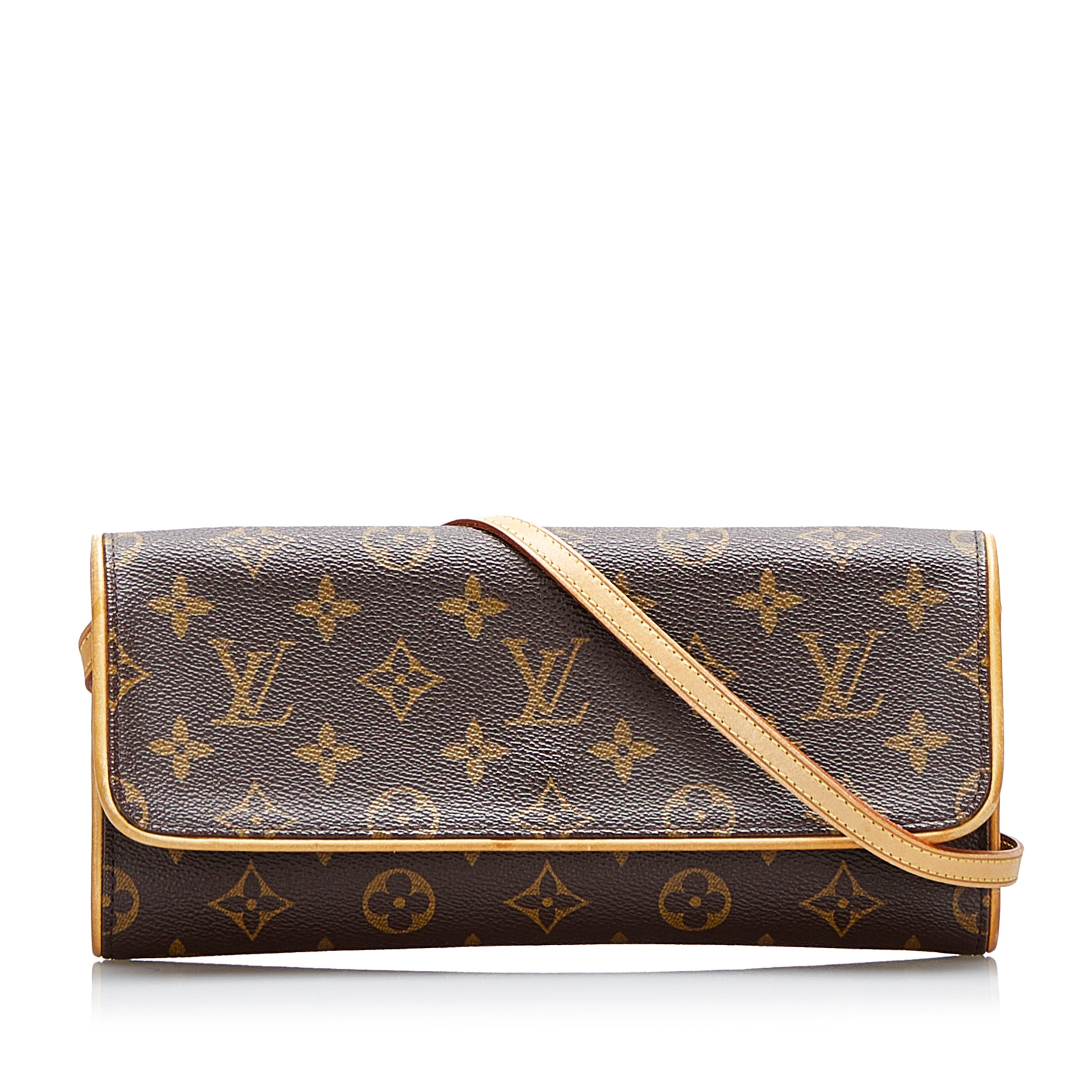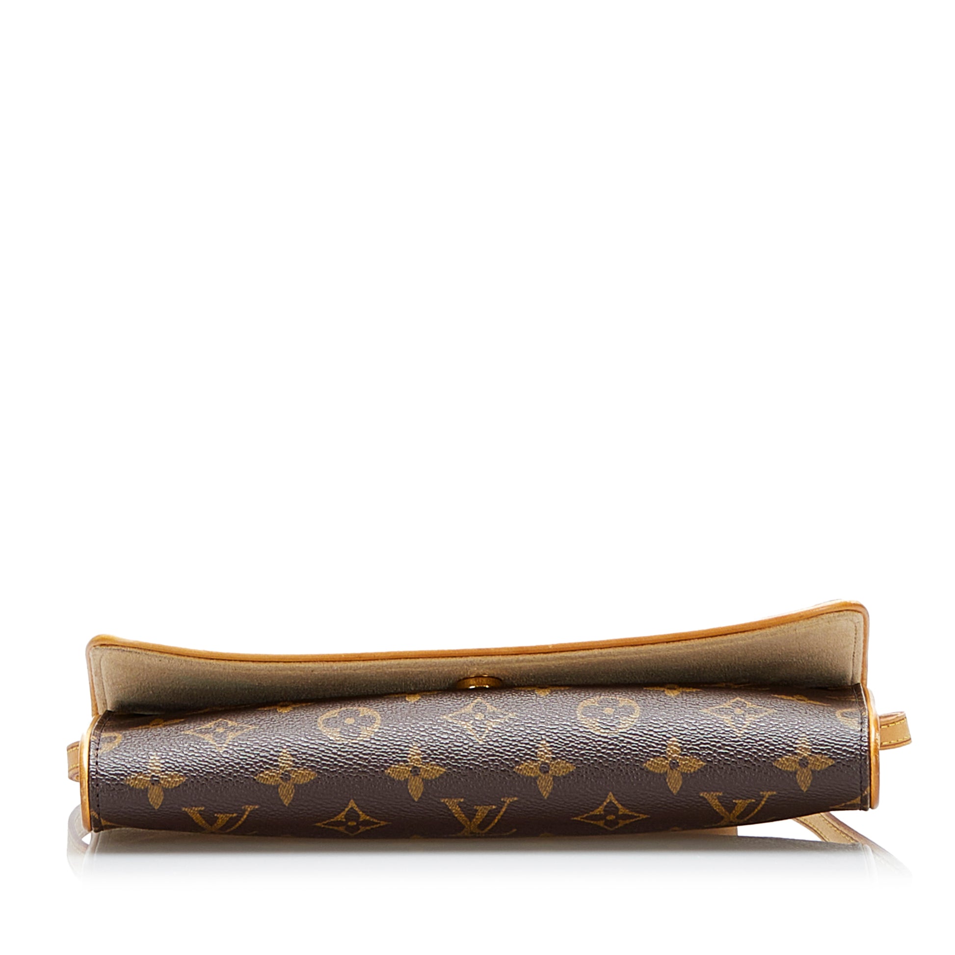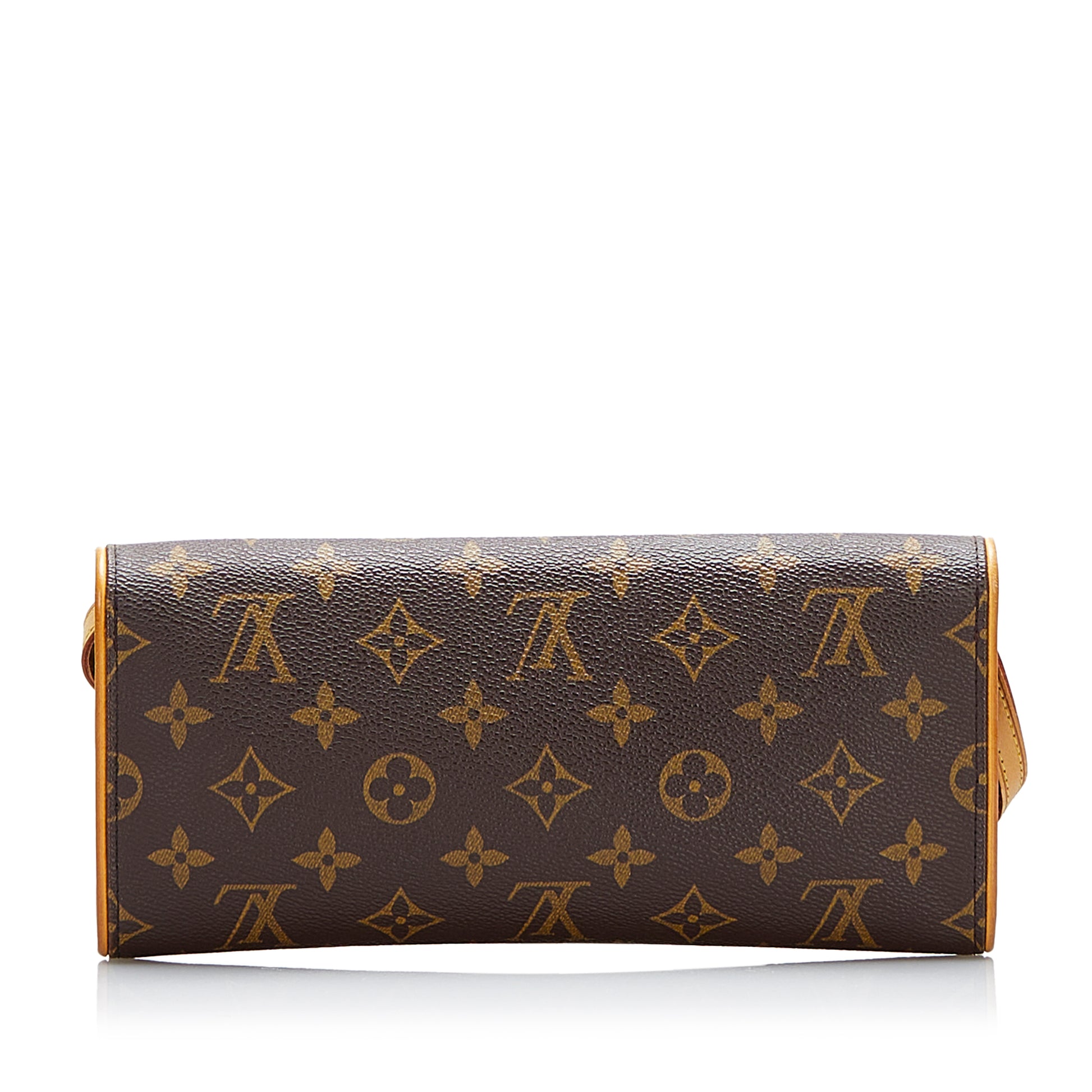 The Pochette Twin GM features a monogram canvas body, a flat leather strap, a front flap with a magnetic closure, and an interior slip pocket.