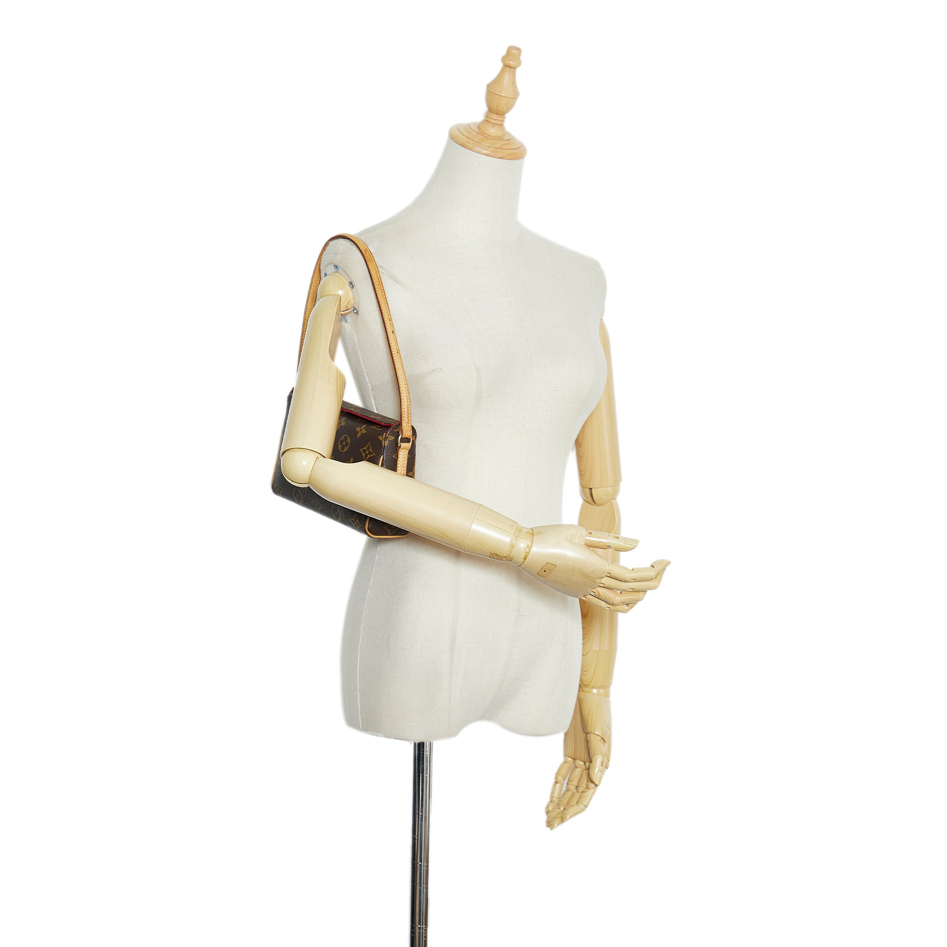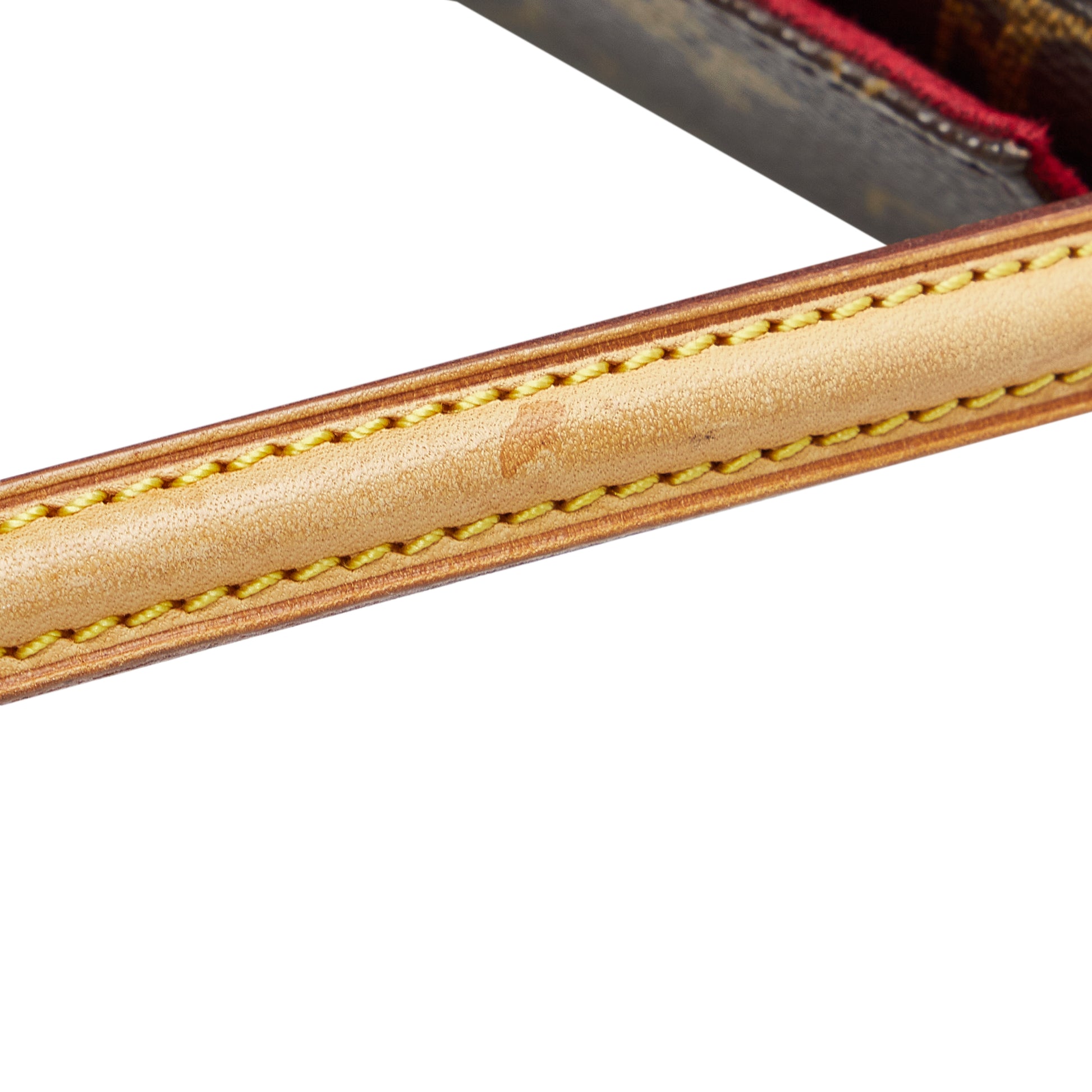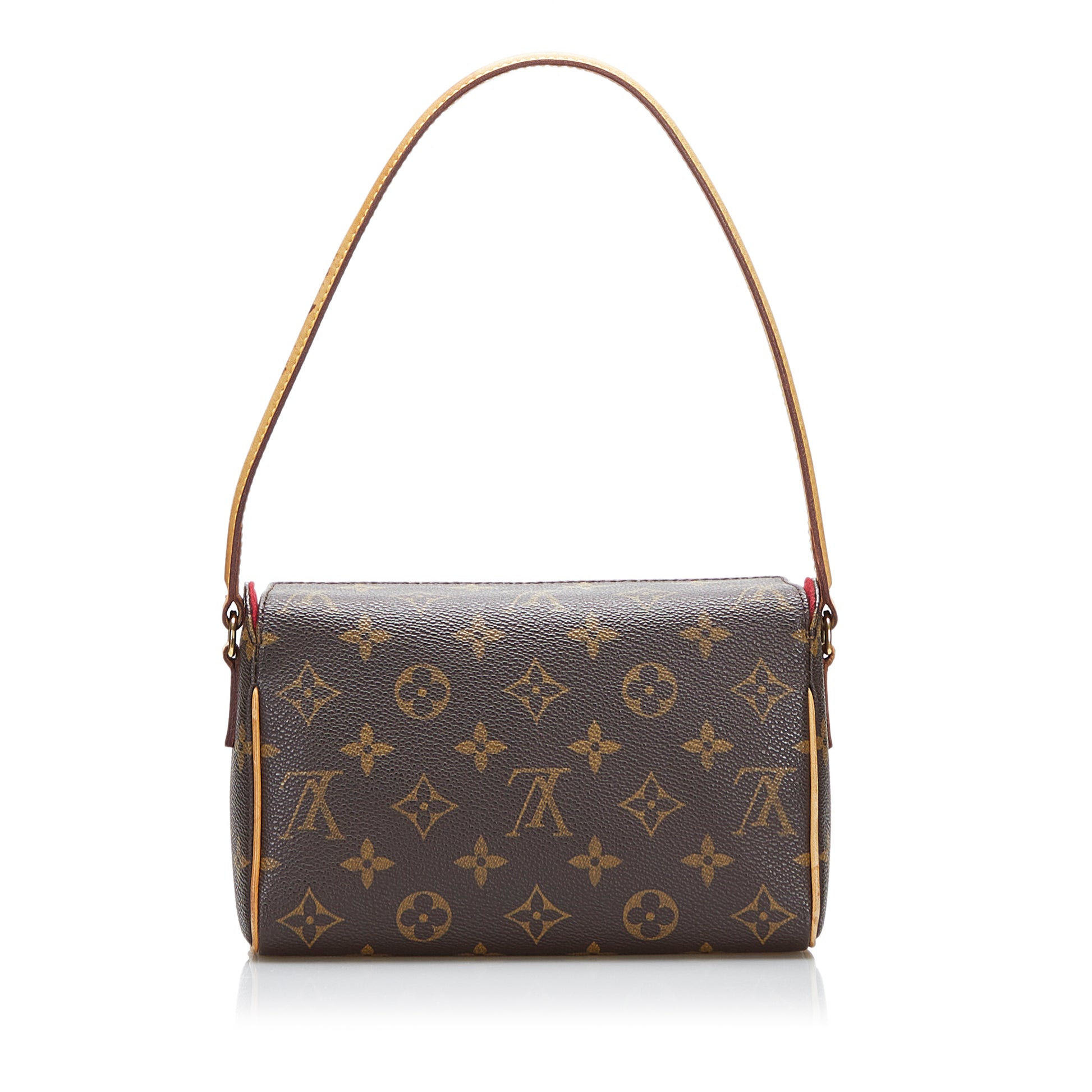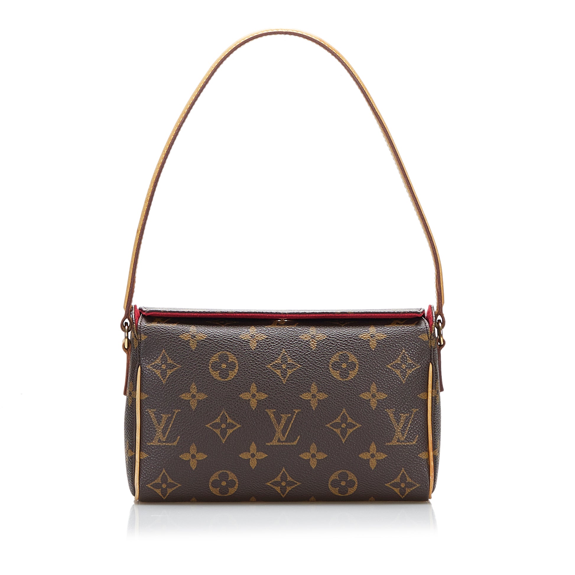 The Recital features a monogram canvas, a flat leather strap, a top fold over with a magnetic closure, and an interior slip pocket.