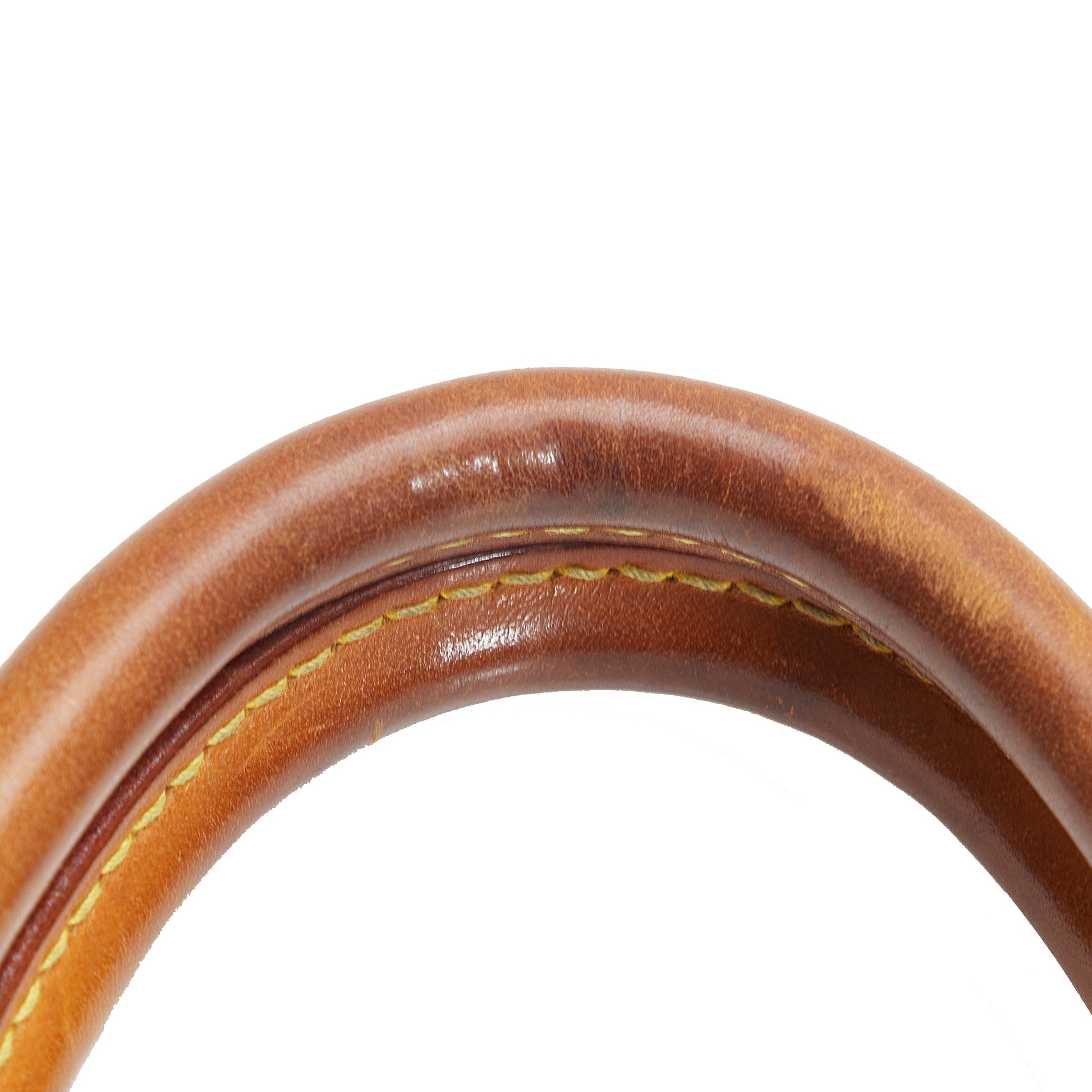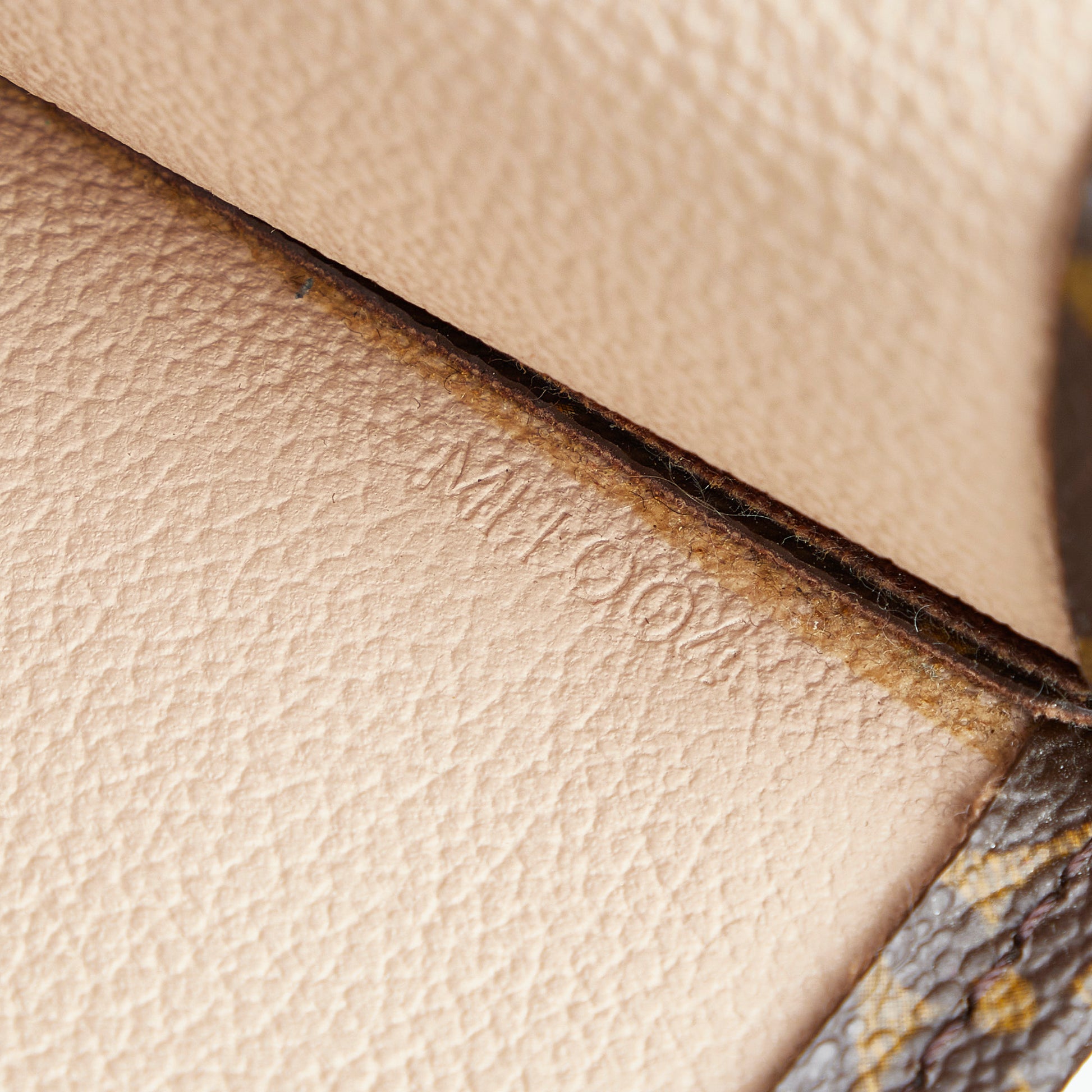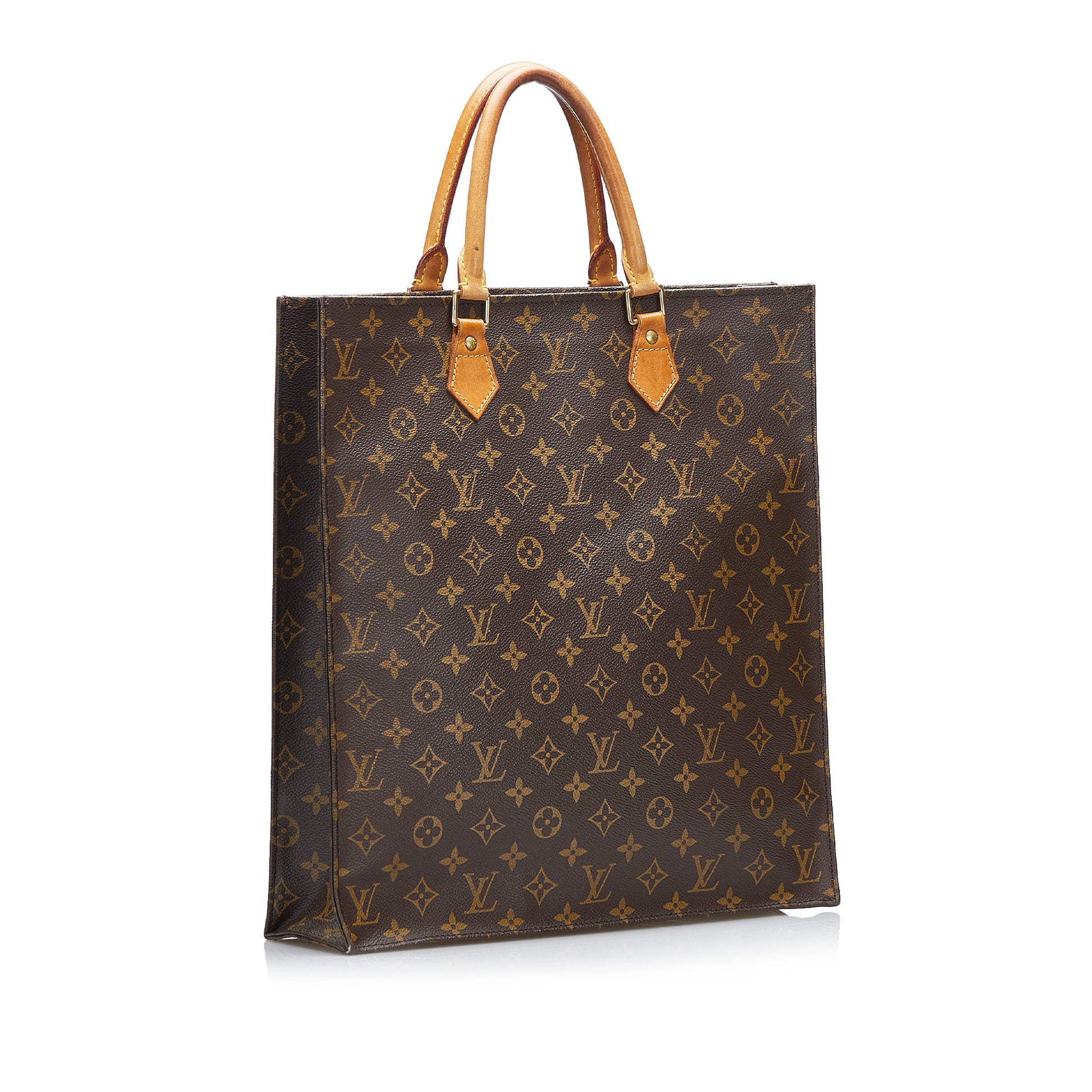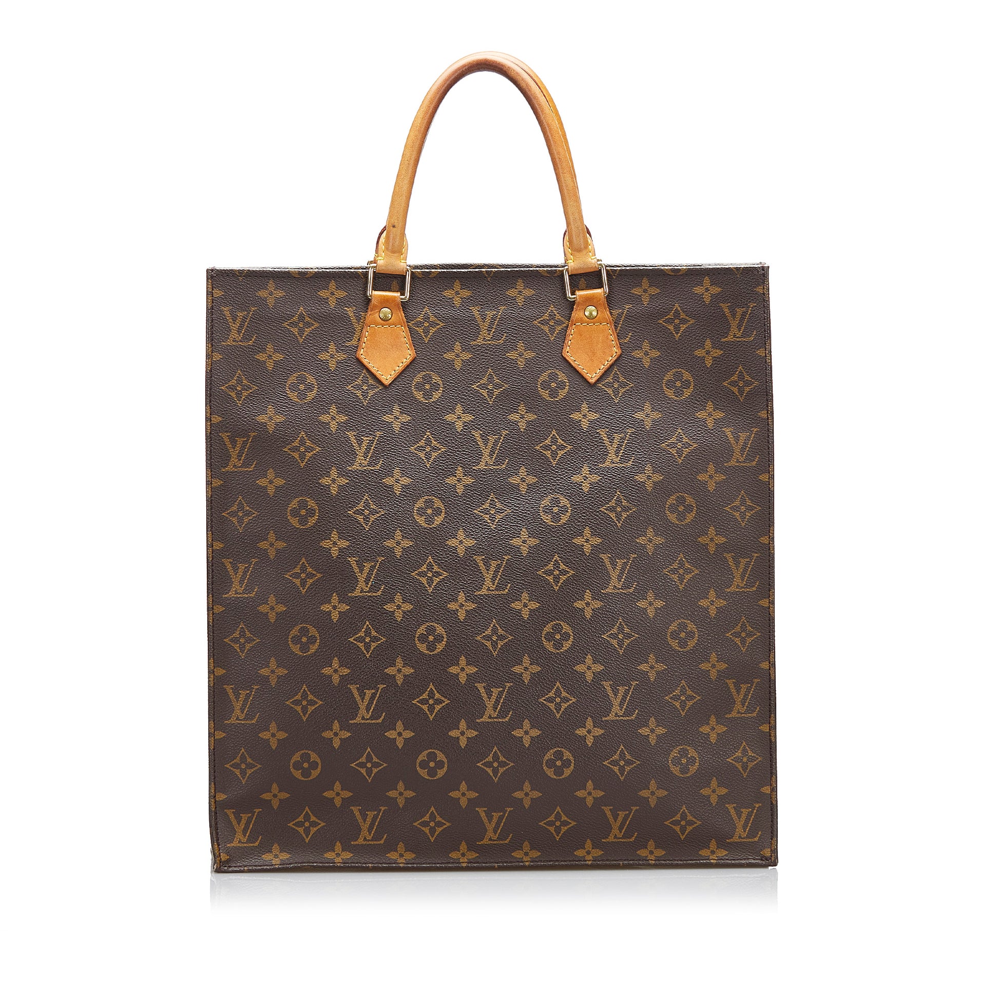 The Sac Plat features a monogram canvas body, rolled vachetta leather handles, an open top, and interior slip pockets.
