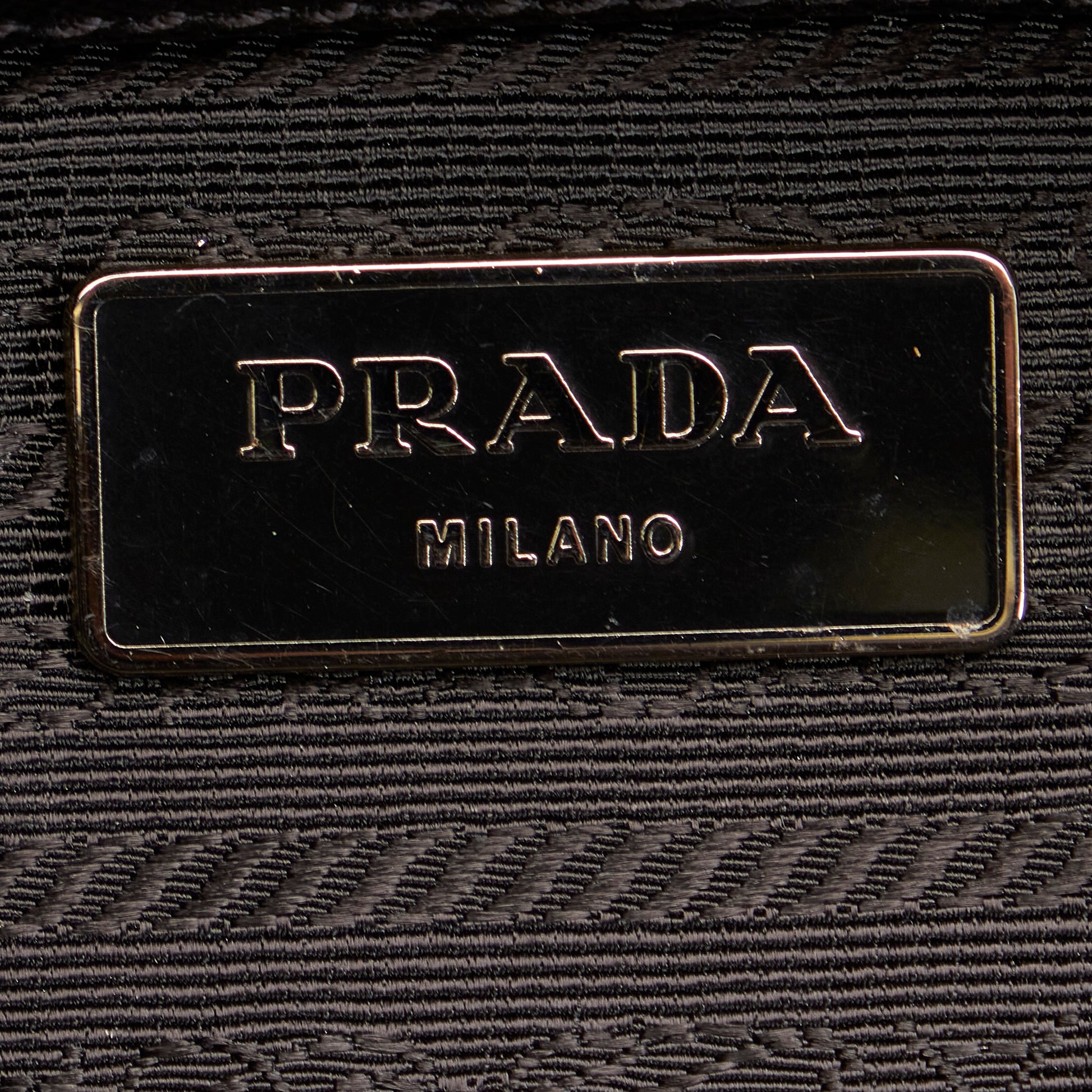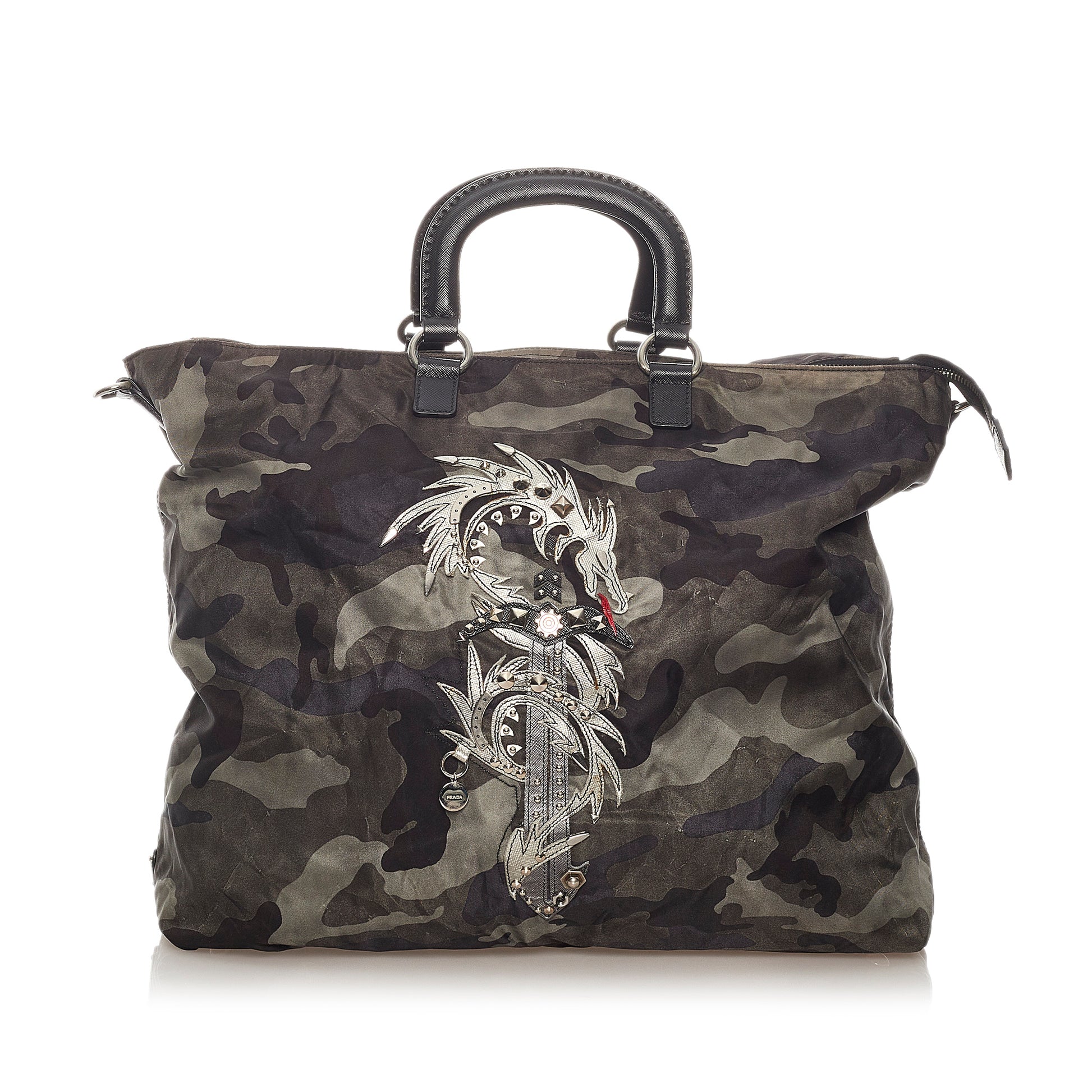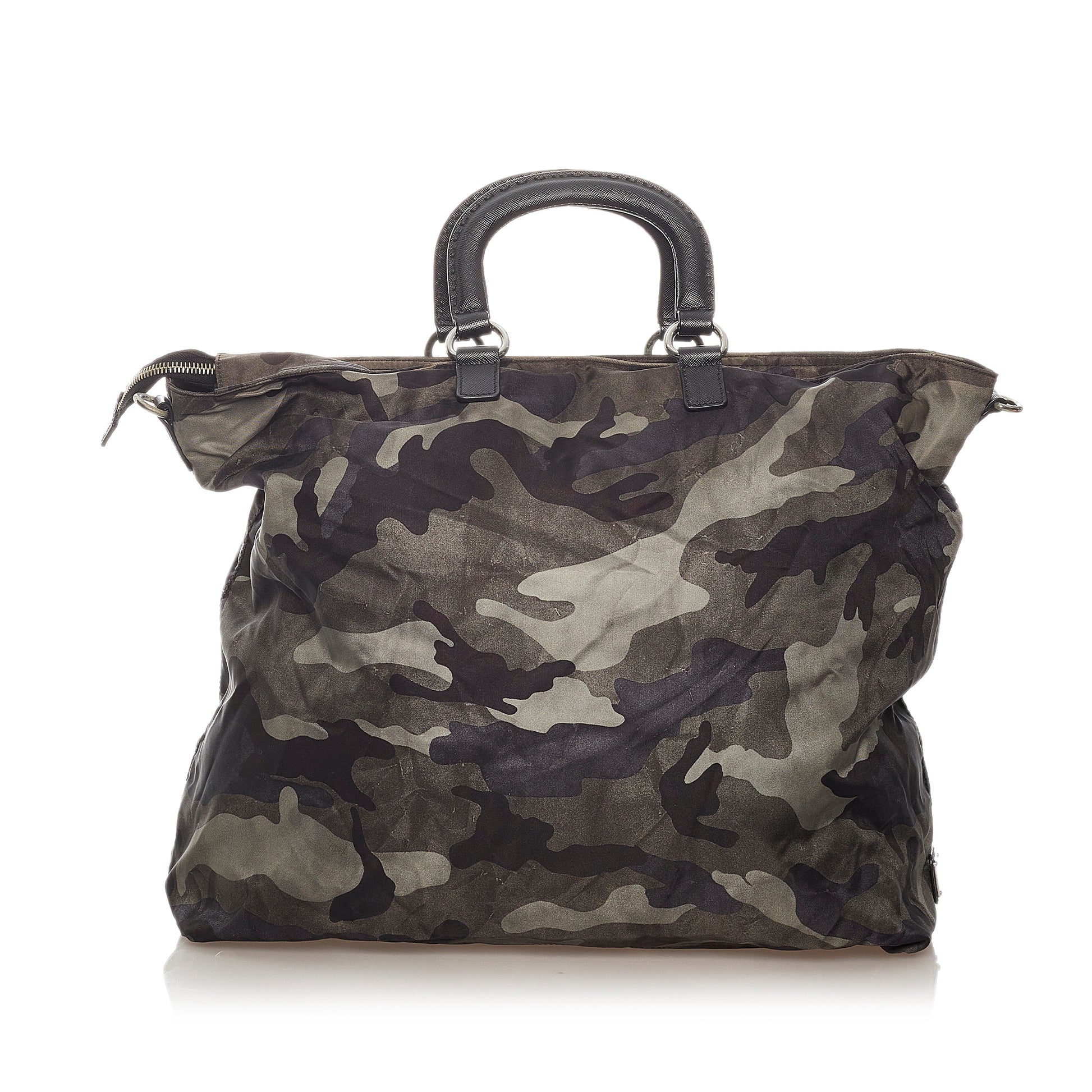 This satchel features a camouflage print nylon body, flat leather handles, a top zip closure, and interior zip and slip pockets.